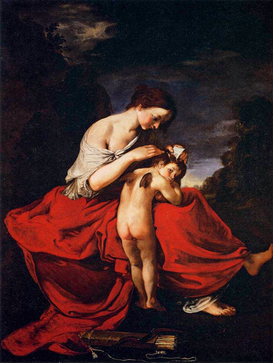 The painting offers one of the most original representations of Venus in the figurative arts. The goddess of love sits in the middle of a dark, rocky landscape and, like a caring mother, combs her son Cupid's thick hair with a fine comb, in search of lice. The scene, apparently permeated by domestic and affectionate simplicity, was probably supposed to conceal a more irreverent meaning. In fact, in the words of 17th-century biographer Filippo Baldinucci, which leave no doubt, the painting caused a certain scandal because of its subject matter: "... In one painting he portrayed Venus as she combed the hair of her little son, Cupid, responding wittily, as was his way, to the strong criticism of those who believed his subjects too vile and sordid. Using witty retorts that were sharp, but delivered in such a way as to describe the scene with offending common decency...". Therefore, the witty touches with which the painter enriches the scene are not surprising: the shirt sensually slung over the shoulder of Venus and Cupid - the latter only distinguished from a naughty child by the two wings pinned on his shoulders - which reveals his back. In 1769, the painting was inventoried in the Uffizi under the title 'Venus delousing Cupid', a title that in later years became 'Venus combing Cupid’s hair' or even 'Motherly Affection'.