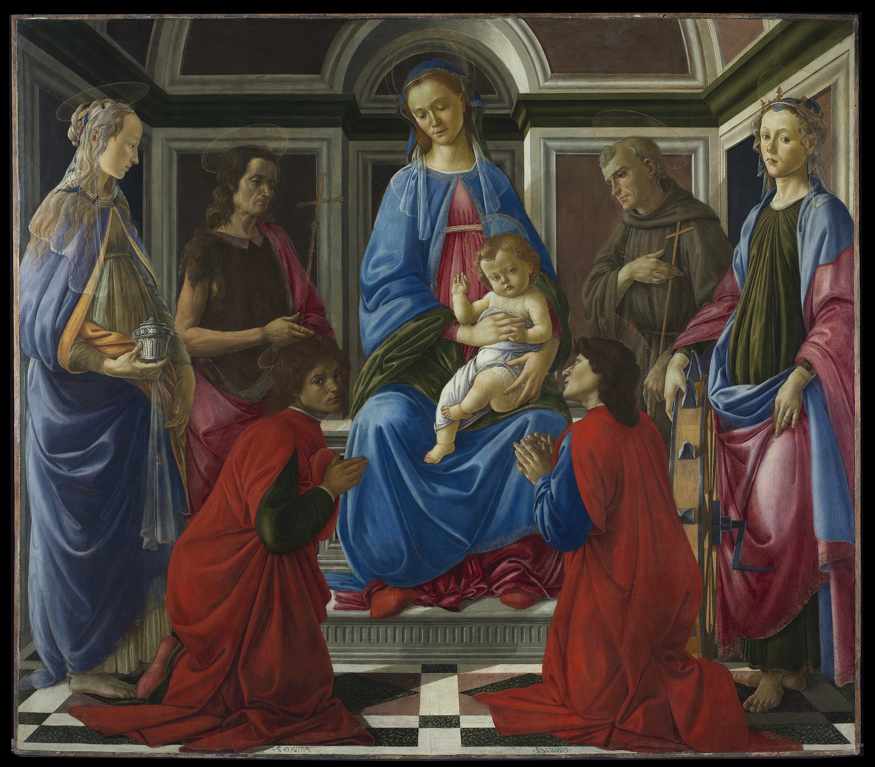 The figures of the saints are similar to the models of Filippo Lippi, Botticelli’s teacher, while the classical setting, dominated with polychrome marble, inspired by Alberti, together with the skilled depiction of robes, the result of lengthy practise from life drawing, are reminiscent of Verrocchio’s workshop, where Botticelli most probably completed his training.