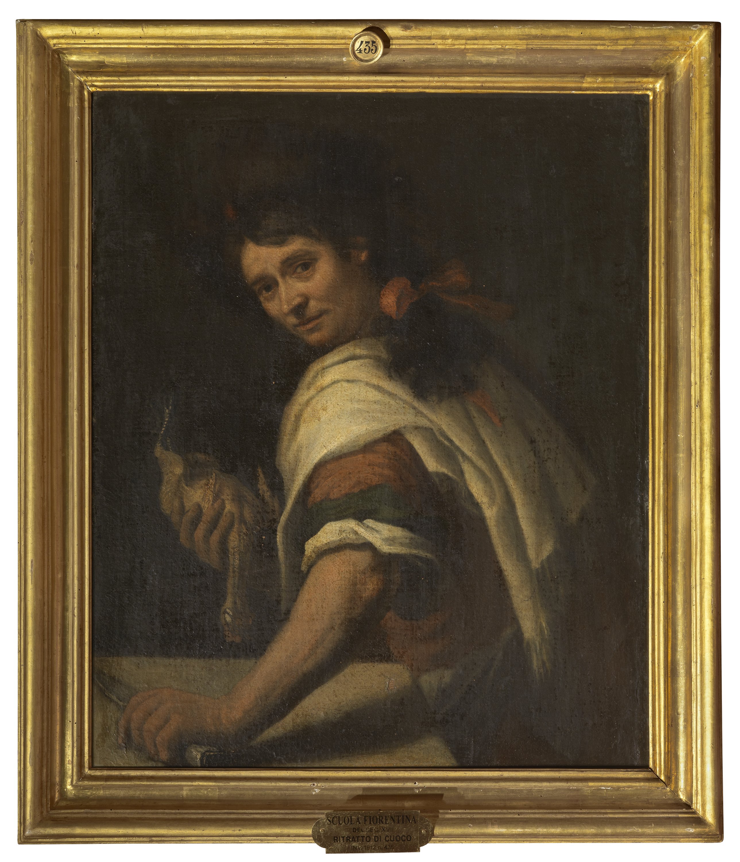 Although this is not one of the famous pieces from the Palatine Gallery, this curious portrait is still worthy of a closer look. The painting is a three-quarter view of a man who faces the onlooker with a interlocutory gaze. In his right hand he holds a plucked chicken, in prominent view, and in his left, the knife he is about to use to gut the bird. The characterisation of his face, clothes and accessories (some of which are only partly visible due to the dark background and altered colours) lead us to consider this a life painting, perhaps of one of the personal cooks to the grand ducal family. The cook has casually thrown a large fringed cloth to protect against stains over an outfit with rolled-up sleeves that leave him free to move. His long hair is gathered in a ponytail, tied with a red string that is carefully knotted into a bow and lastly - a rather curious detail - he is wearing a fur cap on his head