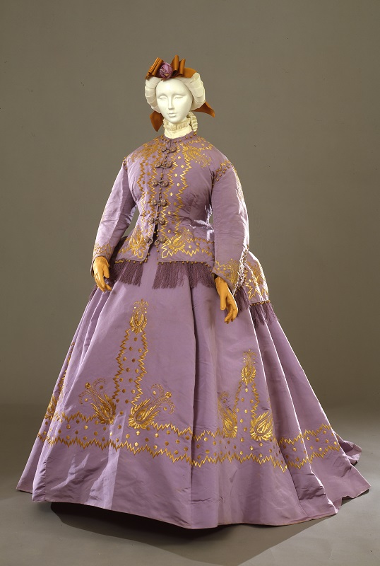 Woman’s dress consisting of jacket, bodice and skirt. This example is in mauve taffeta, embroidered in yellow gold straw thread to create floral designs with “bocche di lupo” [wolves’ mouths] and lozenge designs.