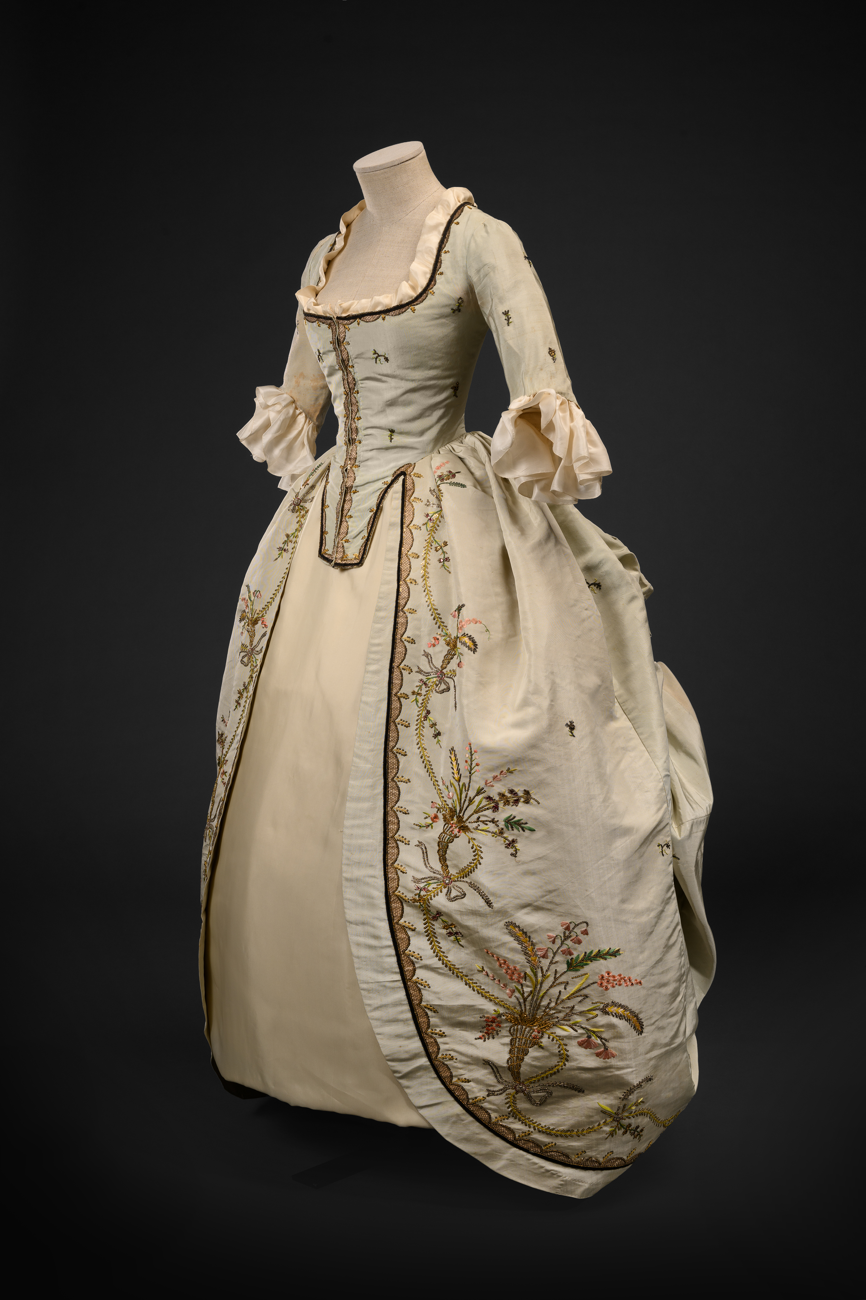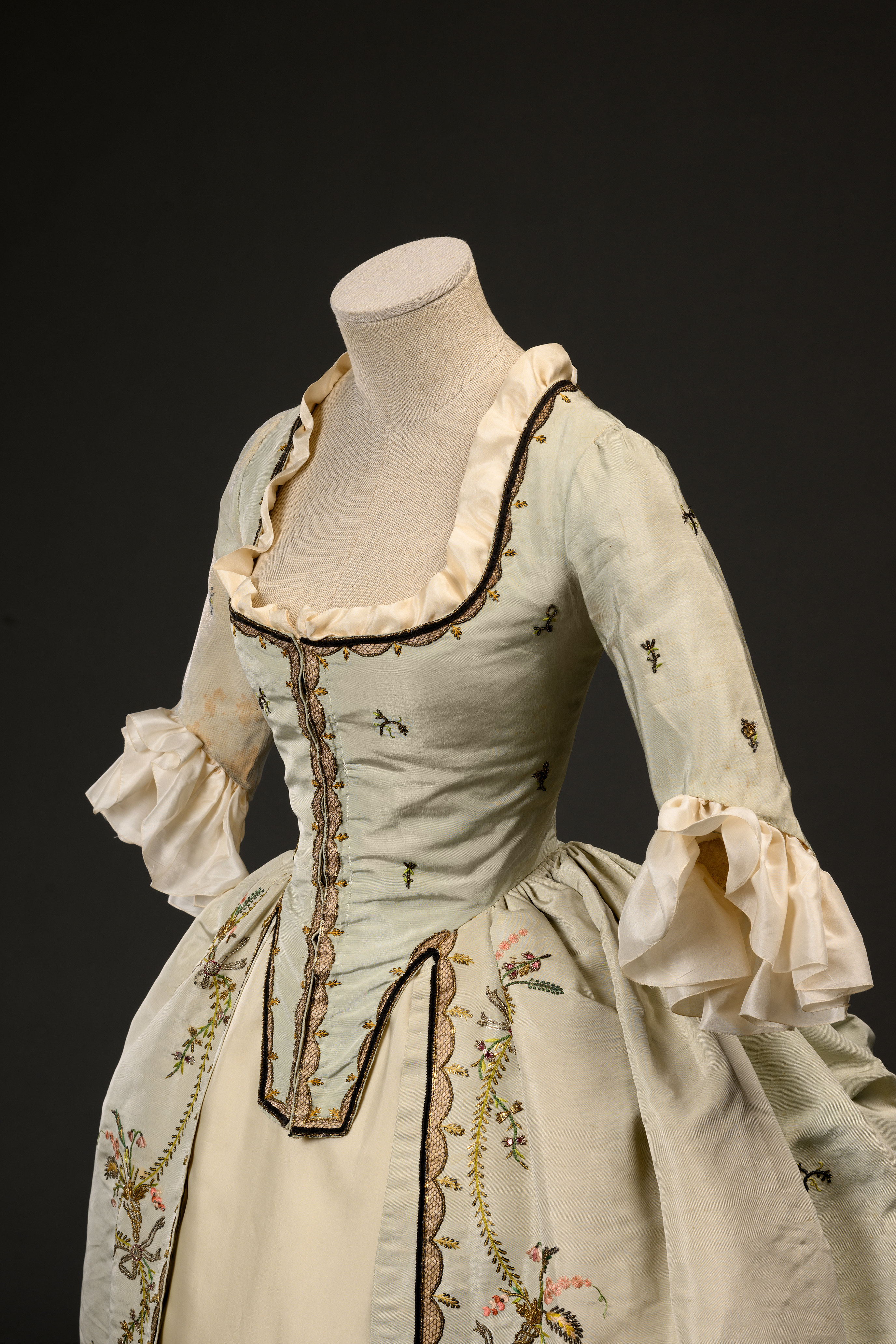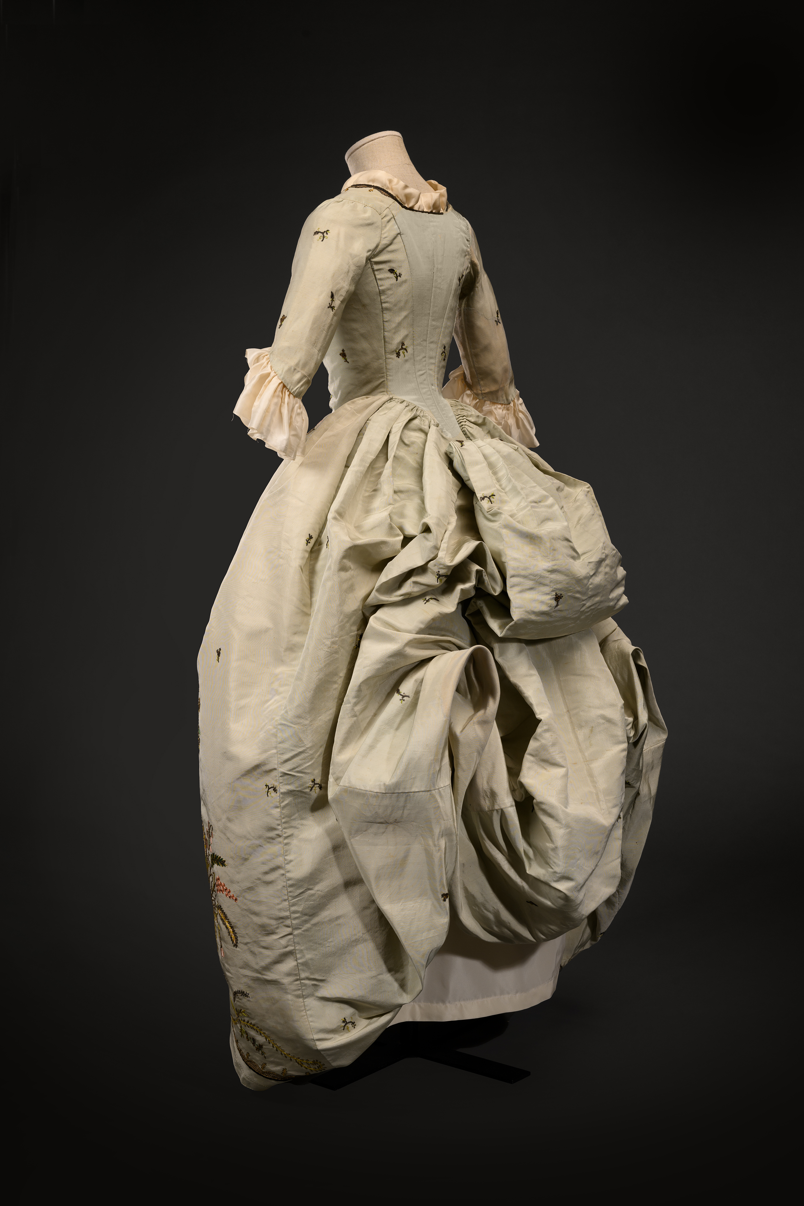 This gown embodies both trends popular at the time: the robe à l’anglaise and the robe à la française. While the version on display, gathered at the back, is reminiscent of the polonaise, typical of English fashion, its shape could be changed by a system of metal loops into a gown à l’andrienne.