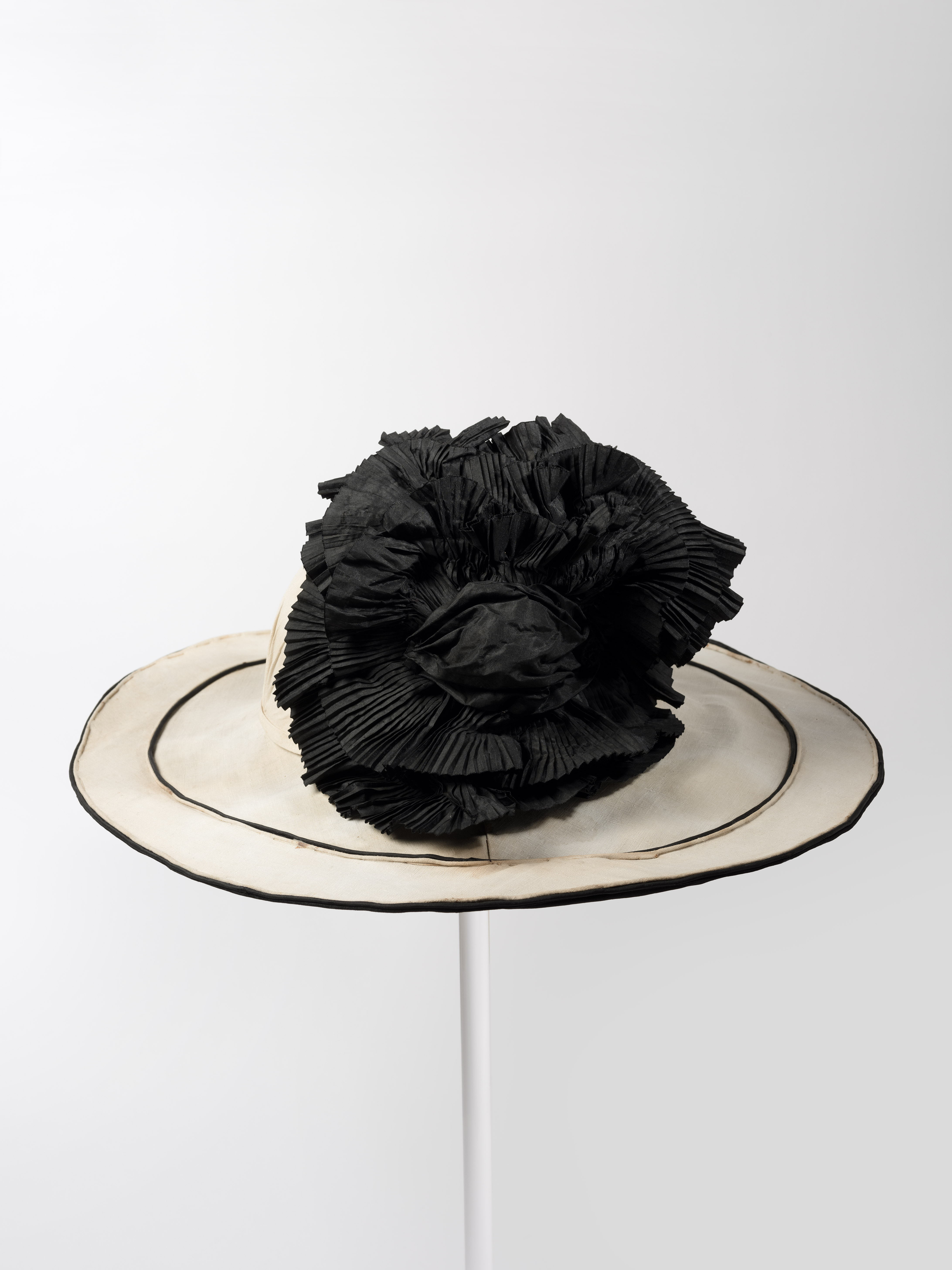 Stiff tarlatan hat covered in raw linen, with a large round crown and broad brim stiffened at the edge and in the centre with iron covered in linen and black taffeta. The front of the crown has a large cockade bow in pleated taffeta.