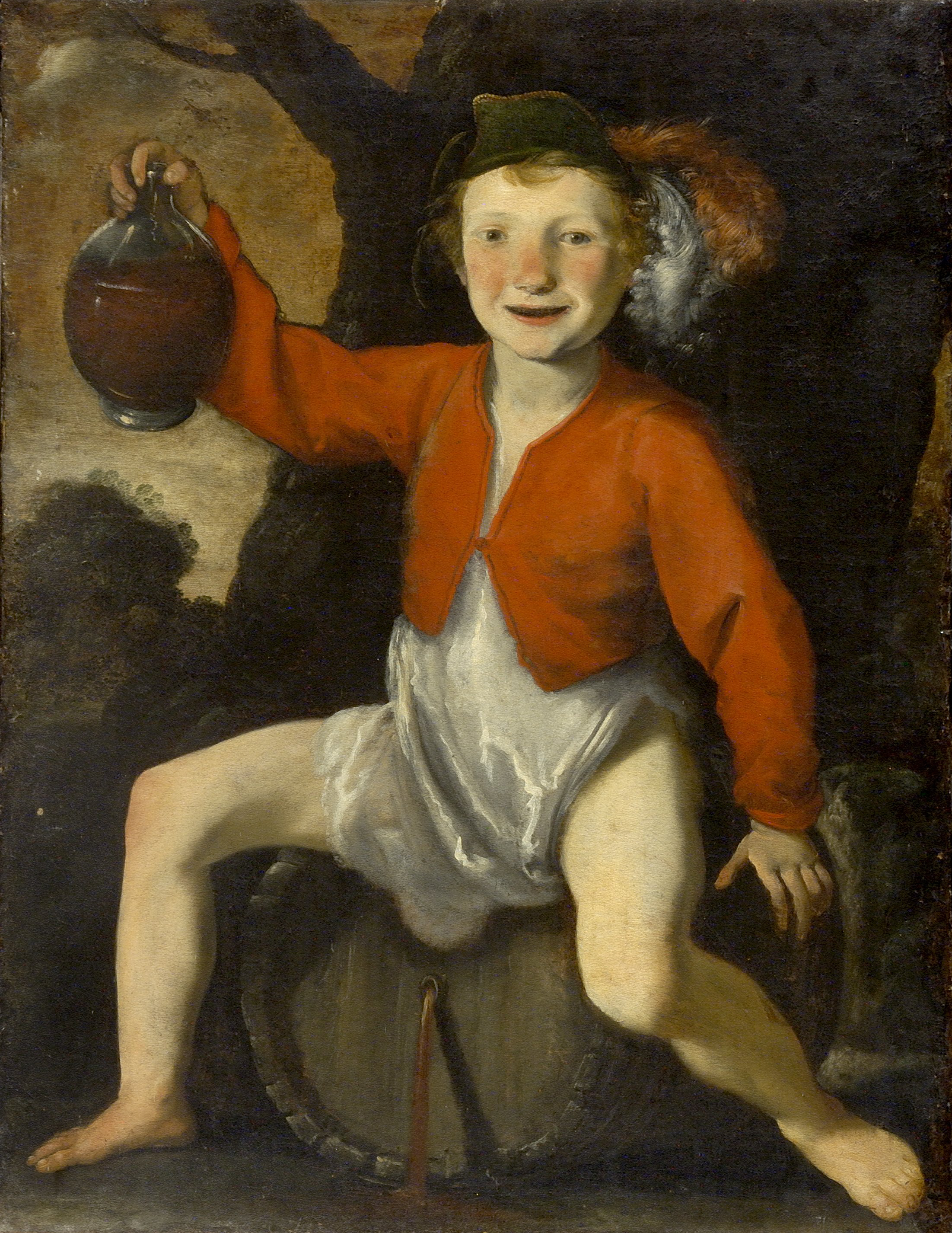 In the centre of the painting is a red-haired boy lifting up a bottle full of wine, probably just filled up from the barrel he is sitting on. His dopey grin and blushed cheeks evidently show signs of intoxication. The subject of the canvas refers to Bacchus, the god of wine and festivities. His realistic face features as well as his garments hint that the boy was painted probably after a real-life model, maybe a court jester. It is not entirely clear who painted the canvas but the playful and light ambiance is very similar to the ones featured by a specific circle of artists working in Florence in the 17th century. Among them are Baccio del Bianco, Pandolfo Sacchi or, above all, Giovanni da San Giovanni, who all worked together at the Casa Buonarroti and the Villa di Mezzomonte for Cardinal Giovan Carlo de’ Medici. It seems that the canvas was painted by Giovanni da San Giovanni. According to the grotesque taste typical of this genre, this kind of paintings also used to represent proverbs or popular sayings as well as allegories of the five senses (in this case, the sense of Taste). Moreover, other very similar works, like the ones at the Villa di Mezzomonte, hint that in those artists’ workshops there used to be several models their pupils could draw from, which provided a basic collection of examples to be replicated in their works.