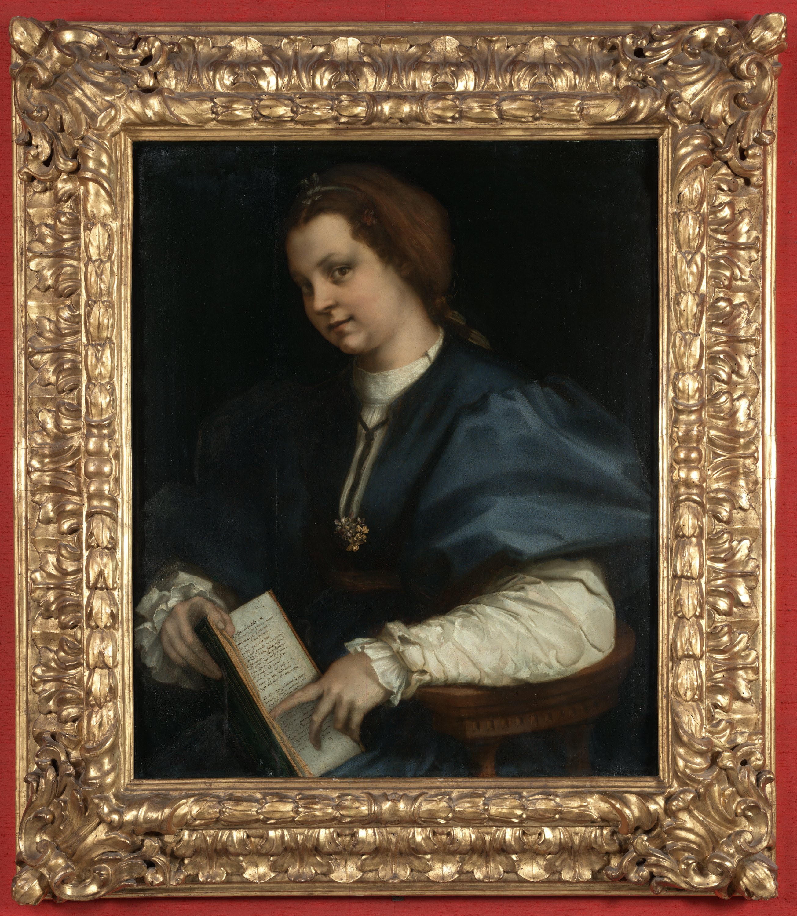 The young woman, shown in three-quarter view, is seated with her right arm on the back of the chair, while gazing out at the onlooker with a hint of an inviting smile. The dark background serves to highlight the wide-sleeved blue dress and white shirt, decorated with a floral pendant.. She is holding a ‘petrarchino’, a printed copy of the Canzoniere by Francesco Petrarca, a very popular type of book in the 16th century, due to the small size that made it suitable for the private enjoyment of reading. The woman shows us the page with sonnets 153 “Ite caldi sospiri al freddo core” [Go, warm sighs, to her frozen heart] and no. 154 “Le stelle, il cielo e gli elementi a prova” [The stars, the sky, the elements employed]. The first text is a reference to the disquiet of amorous feelings, and the second, in praise of the beloved’s beauty, evoking her beautiful eyes and the intensity of her gaze. We do not know the name of the woman. According to some, it may be a portrait of Lucrezia, Andrea’s wife, while for others, it is a portrait of Lucrezia’s daughter from her first marriage, Maria del Berrettaio. In this intense portrait, with its rich palette of blues, Andrea draws on the closest examples of portraiture, not only Florentine, but also Roman, from Raphael to the Venetians, such as Sebastiano del Piombo, or Lotto, from whom he takes the freer, more intimate style of interpretation. The painting was displayed in the Tribuna from 1589 and attributed to Pontormo.