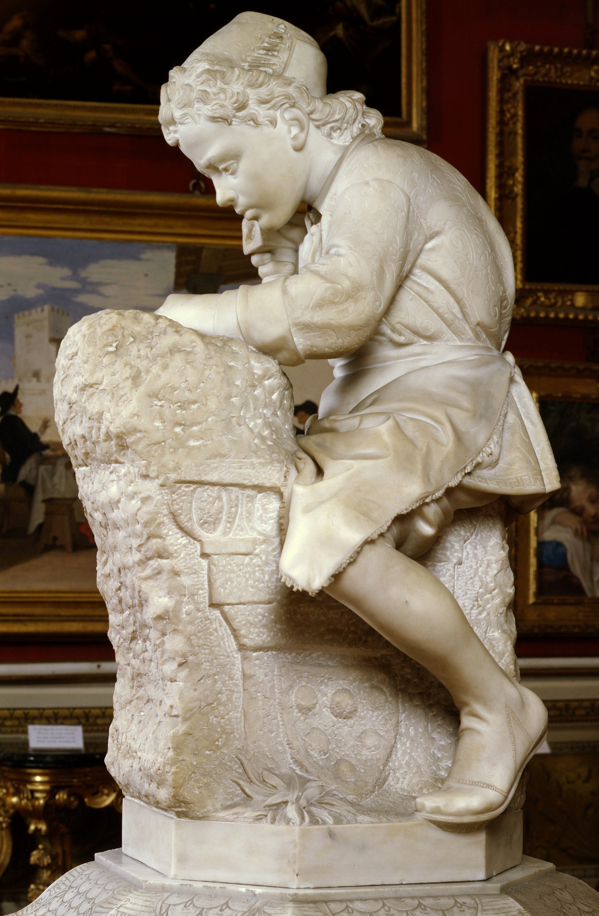 Such virtuosity impressed the visitors to Zocchi's atelier, including Victor Emmanuel II. The King was so amazed by the artist prowess that he bought the statue for his own apartments in the Pitti Palace in 1862. Indeed, this and other acquisitions made by the sovereign reflected the culture of historical romanticism that was flourishing in the national and international art scene, finding new useful ideas in the history of medieval and modern Europe to celebrate national history. In the case of Michelangelo, he was part of a specific current of artistic production in the second half of the 19th century, which aimed to celebrate the precocious genius of past masters through anecdotes from their childhood. Among the many examples, it’s enough to recall the story of the “young Giotto discovered by Cimabue”: a theme that inspired various artists of the time, including the Florentine painter Gaetano Sabatelli who painted Cimabue and Giotto (1846), which is also part of the Uffizi Gallery collections. There are, however, some critics who suppose that Zocchi with this work wanted to tell his own story, alluding to his first apprenticeship as an errand boy in his uncle's marble workshop, as recounted by biographer Angelo De Gubernatis (Angelo De Gubernatis, Dizionario degli artisti italiani viventi. Pittori, scultori, architetti, Firenze Gonnelli 1889, pp. 560-561).