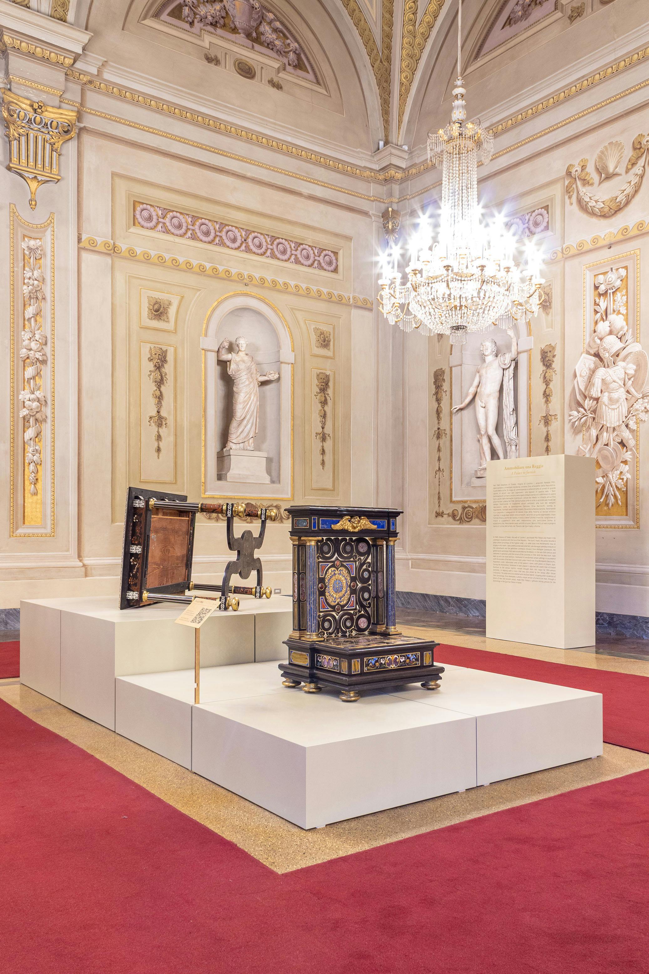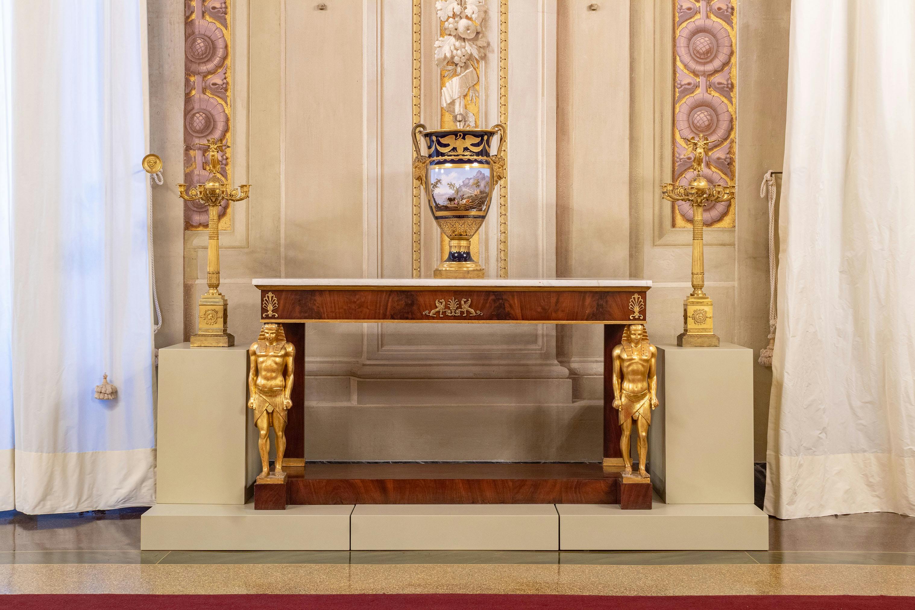 The very best of three centuries (from the 17th to the 19th) of royal furnishings, recounted through the evolving interior decoration styles of three dynasties – the Medici, Lorraine, and Savoy –, has been concentrated in a selection exhibiting 16 genuine furniture masterpieces that also outline the Palace’s cultural history. On the first floor of the former sovereign residence of the Pitti Palace, the Palatine Gallery’s Niche Room now offers a complete anthology of royal furniture. Decorative armchairs, vases from the Manufacture de Sèvres and others imported from China, Giovanni Socci’s legendary mechanical writing desk, a kneeling stool made by Leonardo van der Vinne and adorned with precious stones, and a unique stipo providing a perfect scale reproduction of the Pitti Palace: all these items, through their shapes and decorations, speak to the visitor about how the sovereigns’ tastes and “domestic” aesthetics changed over time. The visitor is thoroughly initiated in the Palace’s heritage of furniture and the decorative arts – that is, in the discovery of an inheritance that, although among the most important of its kind in Europe, is still virtually unknown. Today, while very little remains of the Renaissance decor at Pitti, thousands of items bear witness to the Baroque period, to 17th century Neo-Classicism, and to Savoy eclecticism. Of the objects on display in the Niche Room, visitors can admire the virtuoso 17th-century works of intarsia and “commesso” – that is, the inlay of gemstones from Botteghe Granducali degli Uffizi, the grand ducal workshops. With the rise of the Lorraines, the court’s taste – also in furnishings – adapted to the new European styles, abandoning the decorative flamboyance of Baroque for the lightness of oriental lacquer and sinuously-shaped furniture. With Ferdinand III, certain environments in the Pitti Palace were transformed in accordance with the dictates of the Neo-Classical style; under French rule, Elisa Baciocchi, Napoleon’s sister, refurnished some of the palace’s rooms with pieces in Empire style. During the Restoration, this style was also adopted by Ferdinand III and his son Leopold II to complete the palace’s interior decorations, as the furnishings’ severe lines were adjusted to the various stylistic revivals brought back into vogue by 19th-century aesthetes, in keeping with a taste that was also prized by the Savoys after Italian Unification.