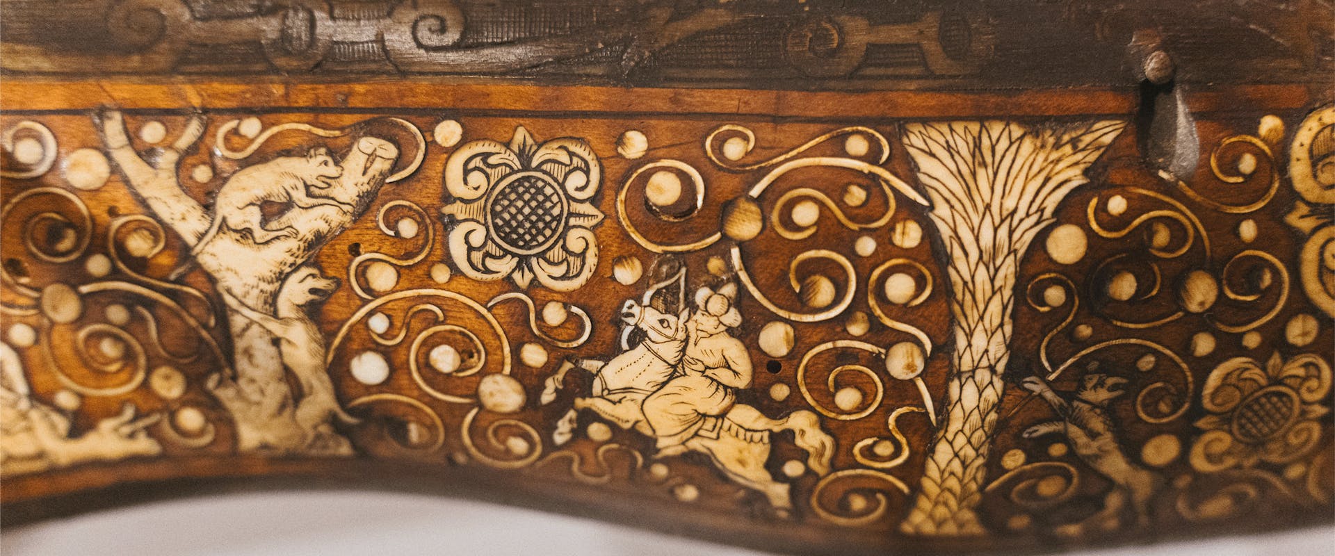 Visitors are greeted by the most iconic exhibit in the show, a 16th century Buratto or Saracen quintain on loan from the Museo Nazionale del Bargello. Likely to have been made for celebrations held to mark the marriage of Francesco I and Bianca Cappello in 1579, alterations over the centuries have transformed it from a Saracen noble into the European warrior we see today. The exhibition logo is another prestigious work of art, Stefano Della Bella’s Knight in Armour made for a parade, on loan from the Gallerie degli Uffizi. The rich, sumptuous attire and caparison conjure up an image of the sheer splendour that attended these spectacular events designed to celebrate the great and good. In another painting, on loan from the Fondazione CR Firenze, Stefano Della Bella illustrated one such event, a nighttime parade in the Boboli Garden in 1637. Arms and armour have been lent by the Museo Stibbert in Florence, which owns one of the richest collections of material from the ancient Game of the Bridge in Pisa. The Stibbert has also loaned a set of superb 17th century crossbows richly inlaid with hunting scenes, manufactured by workshops in southern Germany. while the Ivan Bruschi Foundation’s collections have loaned an amusing letter of challenge from the “unvanquished, most glorious and ever victorious Buratto, King of the Indies”, printed to announce the edition of the Saracen Joust held in honour of Cardinal Corsini, Bishop of Arezzo, on 26 August 1674.