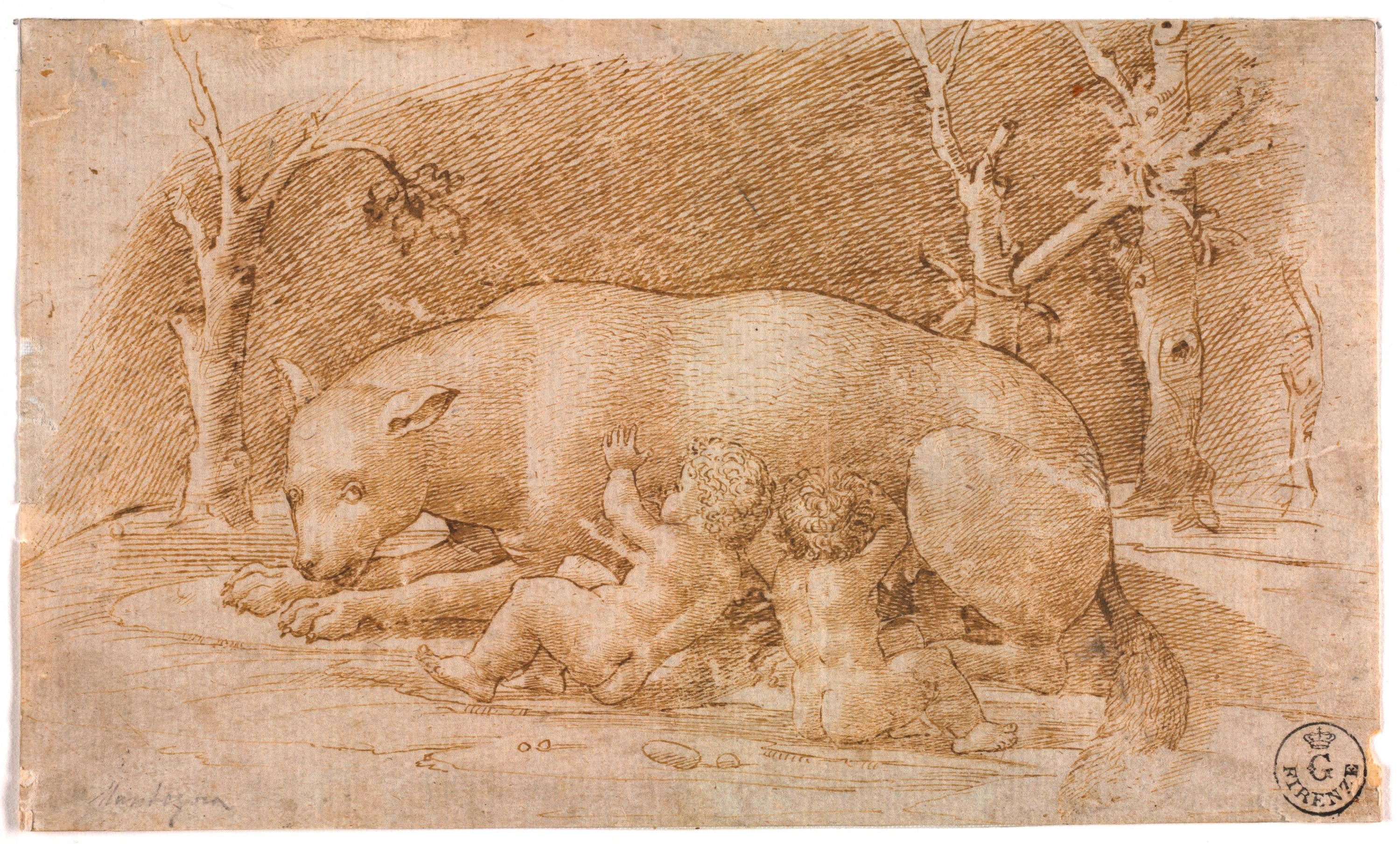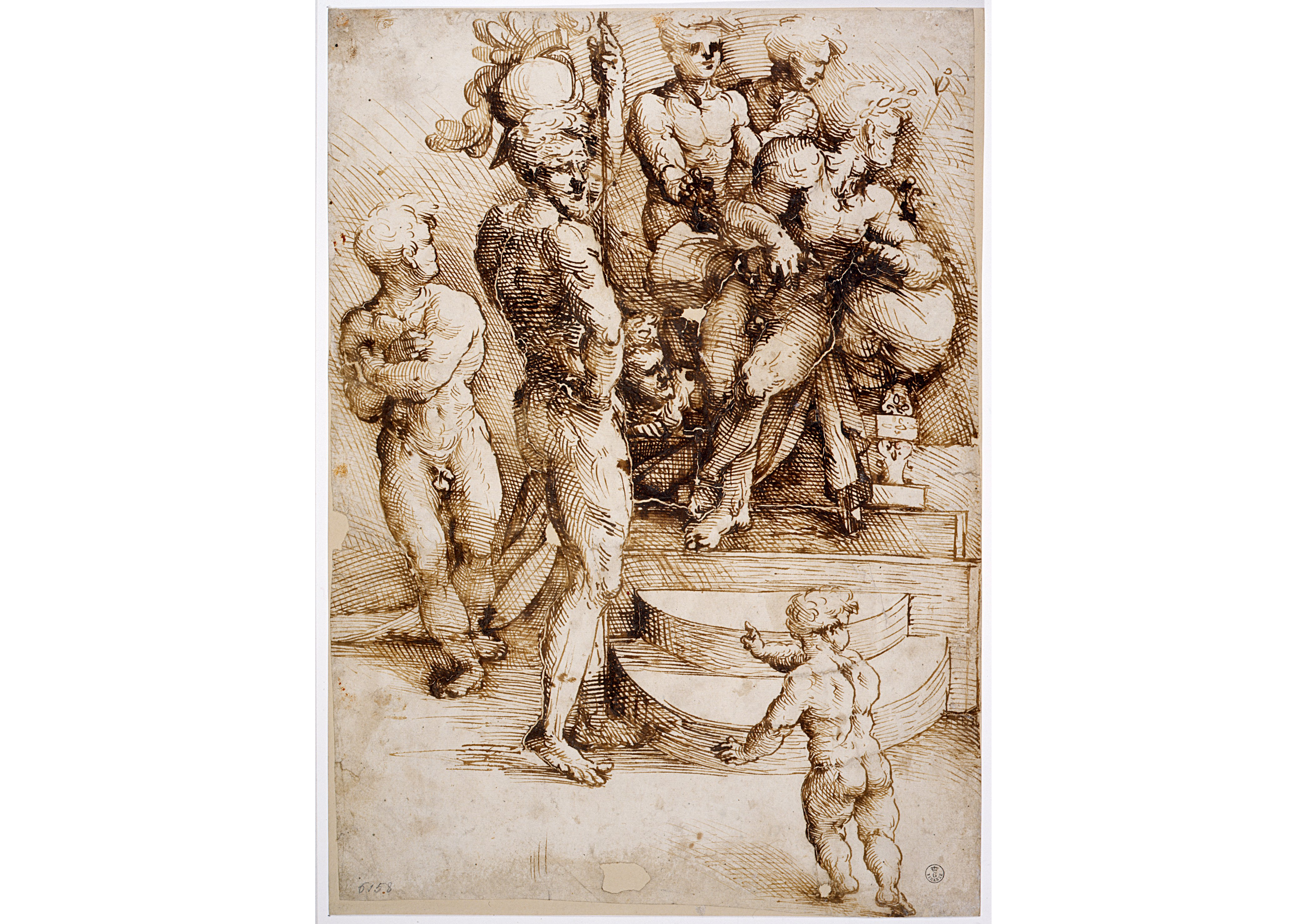 Inv. 1673During the early years of his training in Bologna, draftsman and engraver Marcantonio Raimondi adopted, and experimented with different techniques influenced by the thriving art scene in northern Italy (Ferrara and Padua) in the late 15th and early 16th centuries. This drawing can be ascribed to the earliest period of Marcantonio's career, as it bears a striking resemblance to Mantegna's method of hatching with a pen, adapted in rather a similar way to the niello prints that Francesco Francia favored. The artist creates an extremely refined and rather bright image through narrow pen strokes and dense cross-hatching in various directions.