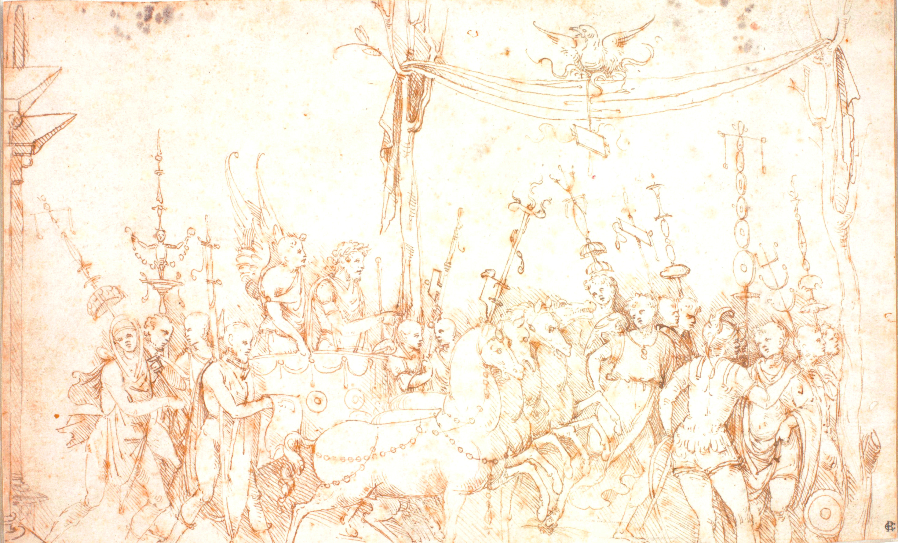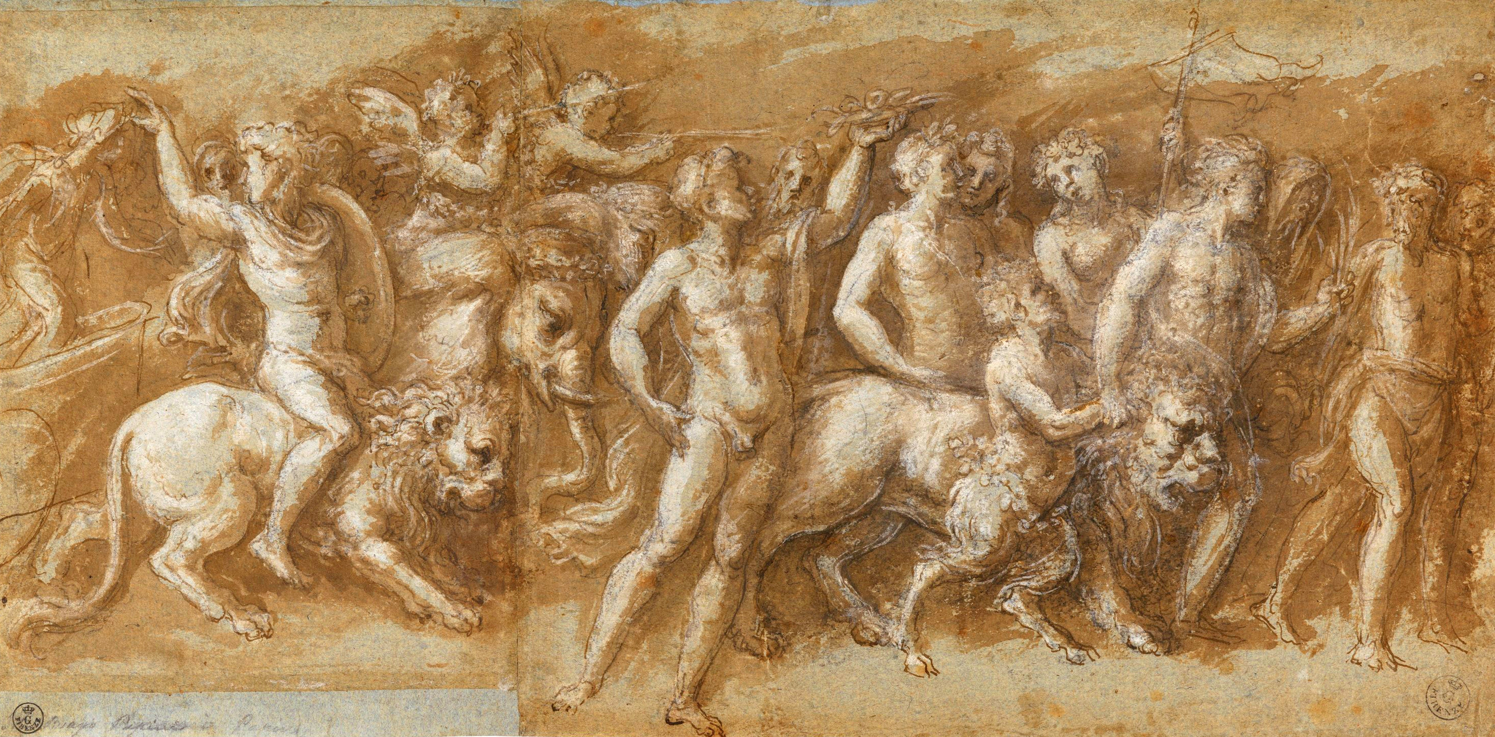Inv. 1477 F rectoThe subject of this drawing derives from the front of a sarcophagus depicting ‘The Indian Triumph of Bacchus’ which is now mounted in a facade in the gardens of Villa Medici in Rome. This may have been studied by Biagio Pupini during his trip to Rome at the beginning of the 1520s. Pupini tackles the classical world through direct contact with ancient artworks, or through copies by contemporary artists, notably Amico Aspertini. Not constrained by any philological intention, he reworks the models in a very personal way. The painting-like qualities of the scene are derived from facades painted by Polidoro da Caravaggio, closely linked to an evocative interpretation of ancient art. The luministic contrast between the dark background of the paper and the figures, highlighted by striking white lead brushstrokes, is combined with a dense and dynamic representation of the procession’s spatial arrangement.