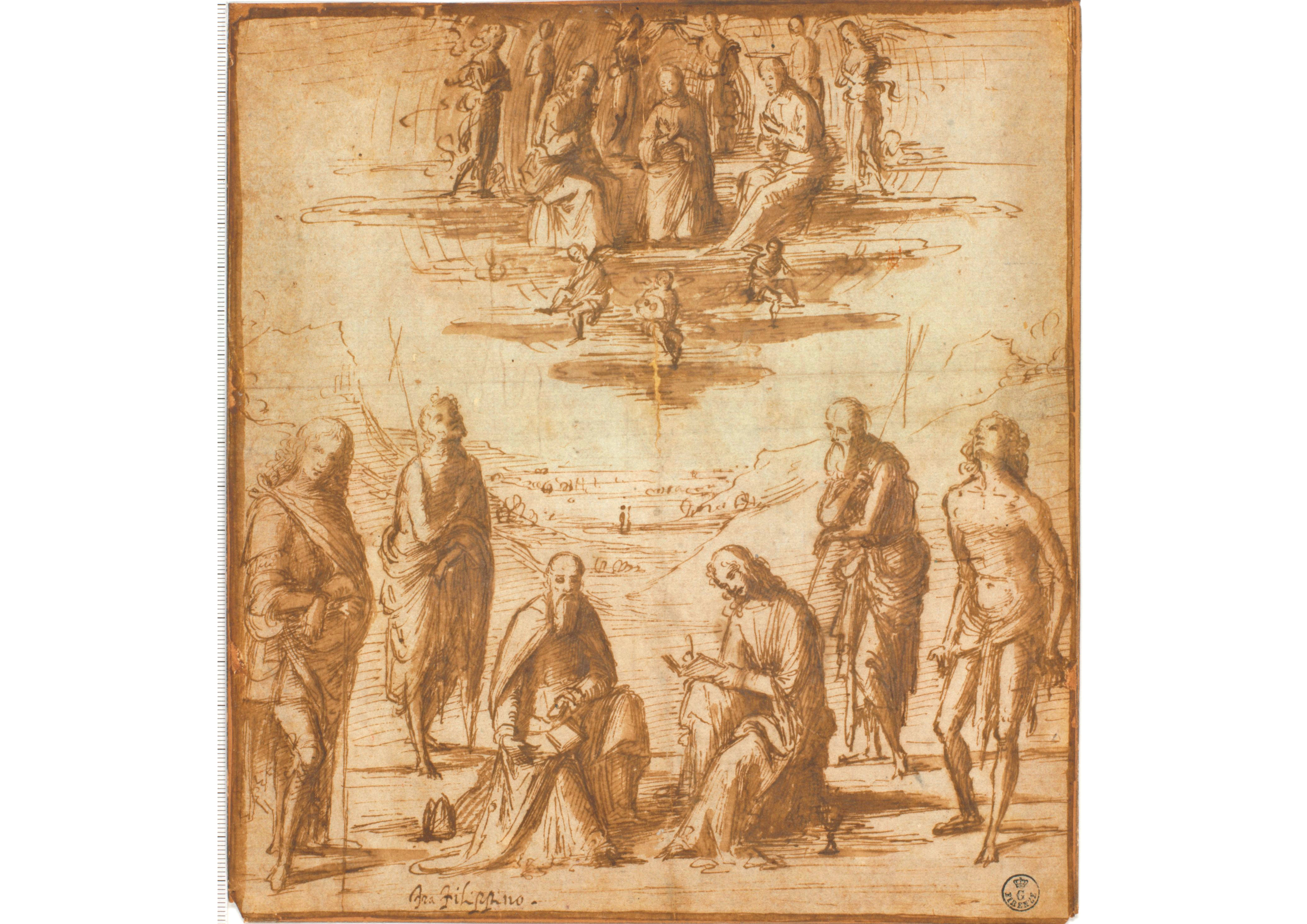 Inv. 178 EThis drawing, like other artistic experiments from Lorenzo Costa's Bolognese period, is clear evidence of the links between Bologna and Central Italy at the turn of the 16th century. Here, we see evidence of the artist's new take on Perugino's compositional models, as well as the incisive pen strokes of Florentine Filippino Lippi. This work, a preparatory study for ‘The Coronation of the Virgin and Saints’ which dates back to 1501 (Bologna, church of San Giovanni in Monte), establishes the essential elements of the composition. It is a quick sketch, but contains many hints of lighting effects, and has the softness of a painting due to the use of diluted ink.