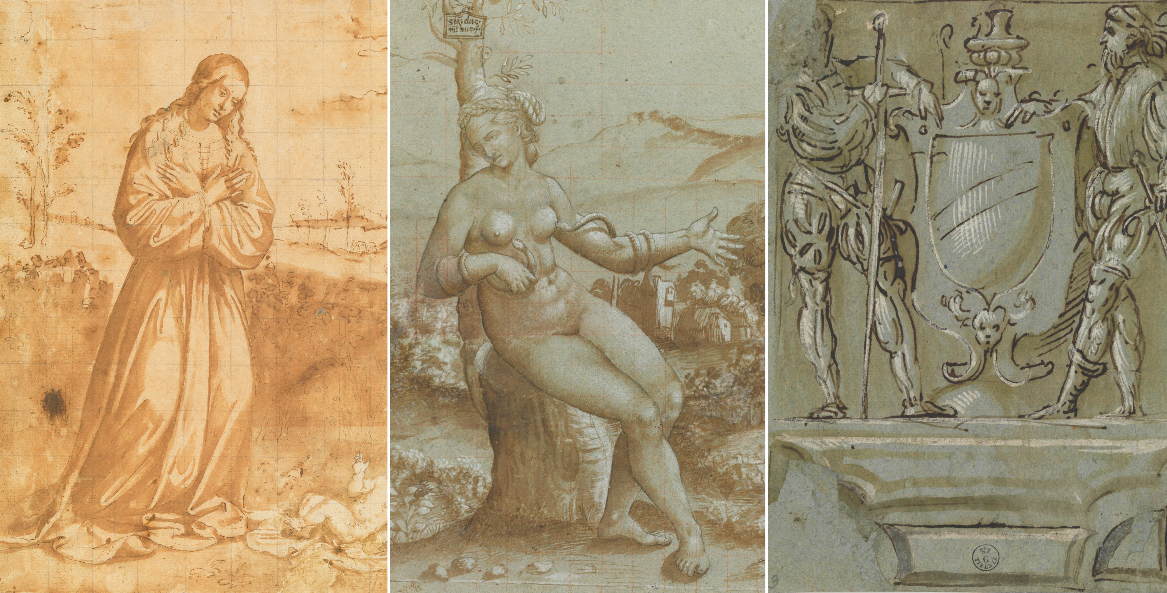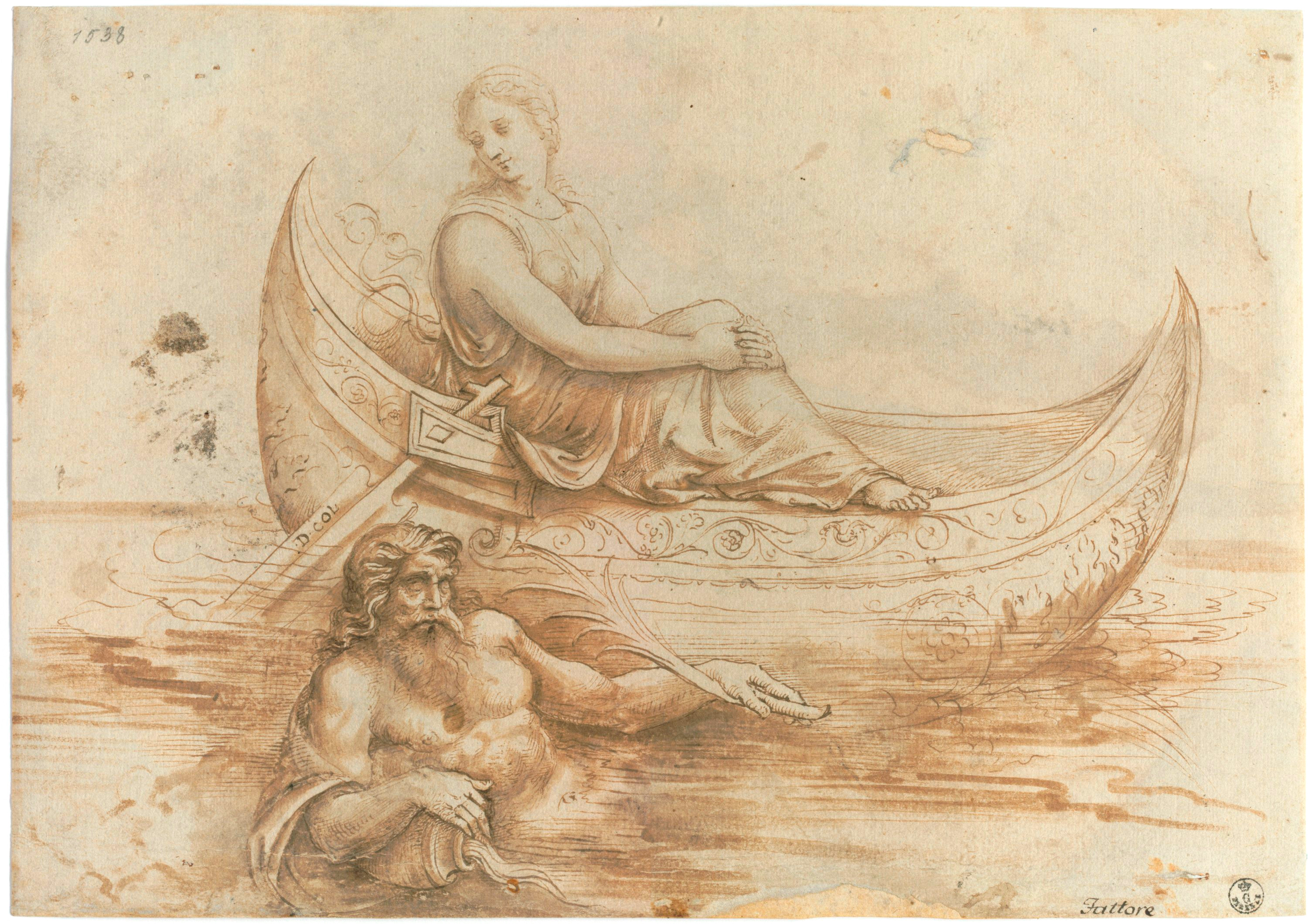 Inv. 1538 OThe unusual iconography in this drawing is taken from ‘De Aquaeductu Urbis Romae’, a work on the problems of Rome's water supply written by Julius Sextus Frontinus, a Roman writer and politician who lived in the 1st century AD. Interpreting the work of Frontinus, Jacopo depicts both the goddess Collatina, who represents the small hill where the water source for the ‘Aqua Virgo’ aqueduct rises, and the virgin who points out the source of the Aniene River (depicted allegorically at the bottom) to Agrippa's soldiers. The drawing is a significant example of the open-minded approach to iconography linked to the predilection for mythological allegoresis found not only in the art of Jacopo Francia, but also in the work of his father Francesco. The backdrop for this was the cultured city of Bologna, where the "Studium" constantly produced new editions and commentaries on ancient texts.