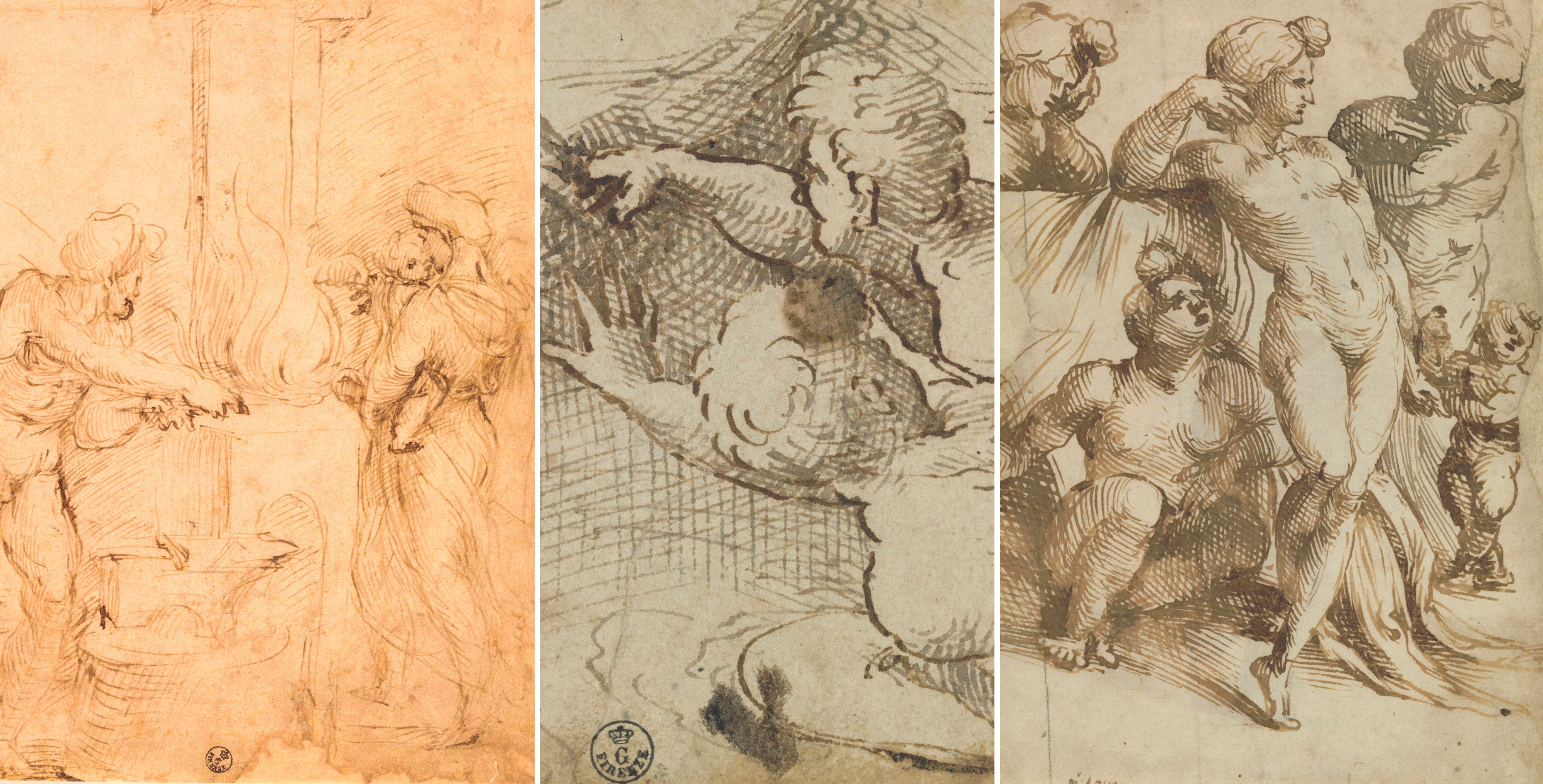 Inv. 6158 FThis work, which can be dated to around the end of the 1520s, reveals the experimentalism and layered culture which helped to drive Aspertini's drawing work. The accentuated musculature of the figures and their tendency towards gigantism derive from the work of Michelangelo, while the pen strokes themselves show the influence of Venetian art, particularly the early drawings of Domenico Campagnola, which were in turn associated with the pen drawings of Tiziano. The forceful parallel and cross-hatching, and the pronounced outlines which help the figures to stand out from the background, give them a plastic quality while, at the same time, creating strong luministic contrasts.