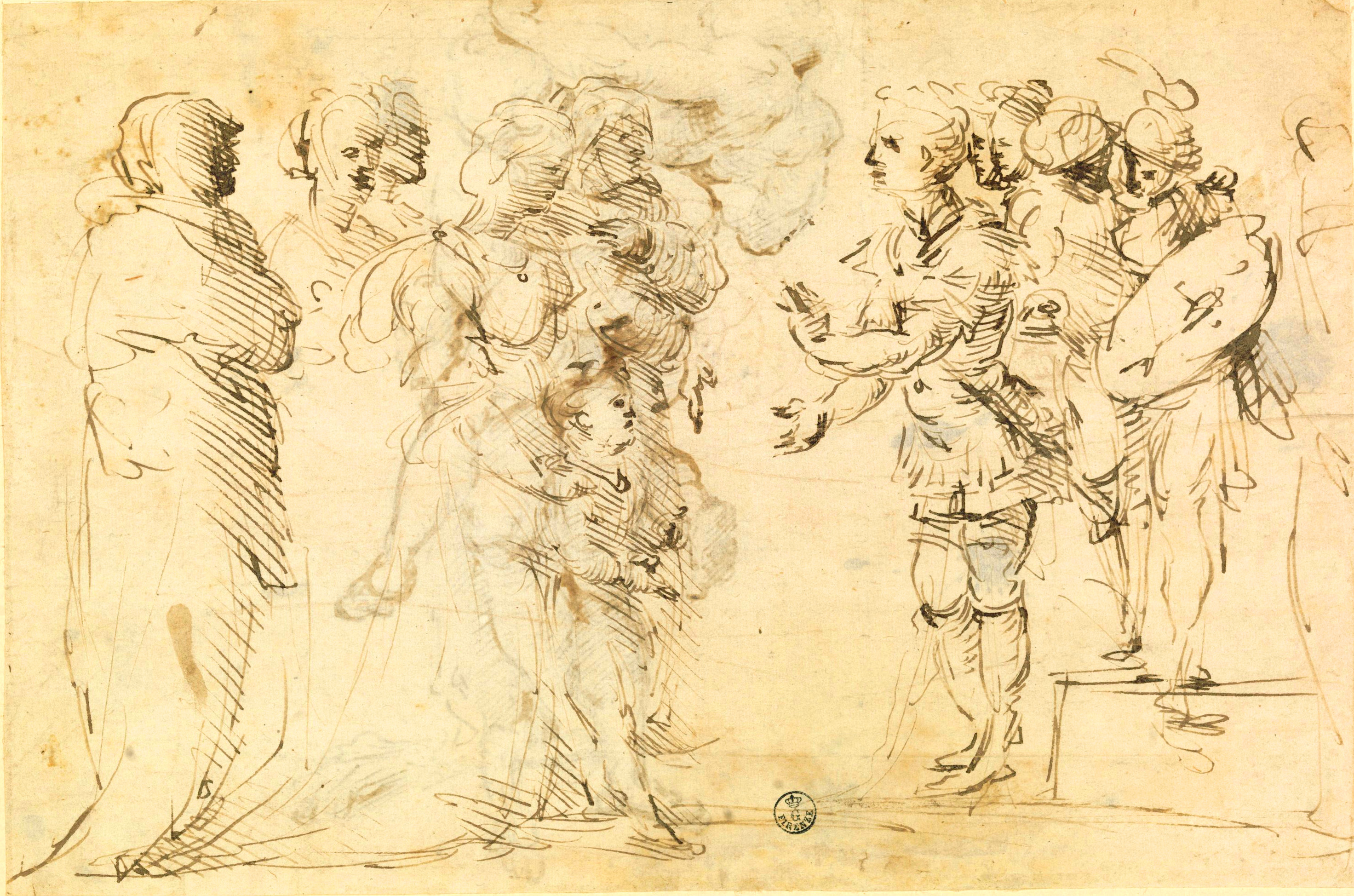 Inv. 15820 F rectoThis drawing is constructed with outlines drawn with quick strokes of the pen that do not fully complete the forms, and shading created with a rather thinned-out parallel hatching technique. The general arrangement and the speed with which the work was completed indicate that it was intended as a sketch of the overall composition, selectively focusing on proportions and the effects of light. The free and open spatiality of the scene in question is portrayed using striking contrasts in light, with deep, dark shadows obscuring the faces of the figures and thickening in the folds of their clothes, while an intense light seems to eat away at their silhouettes.