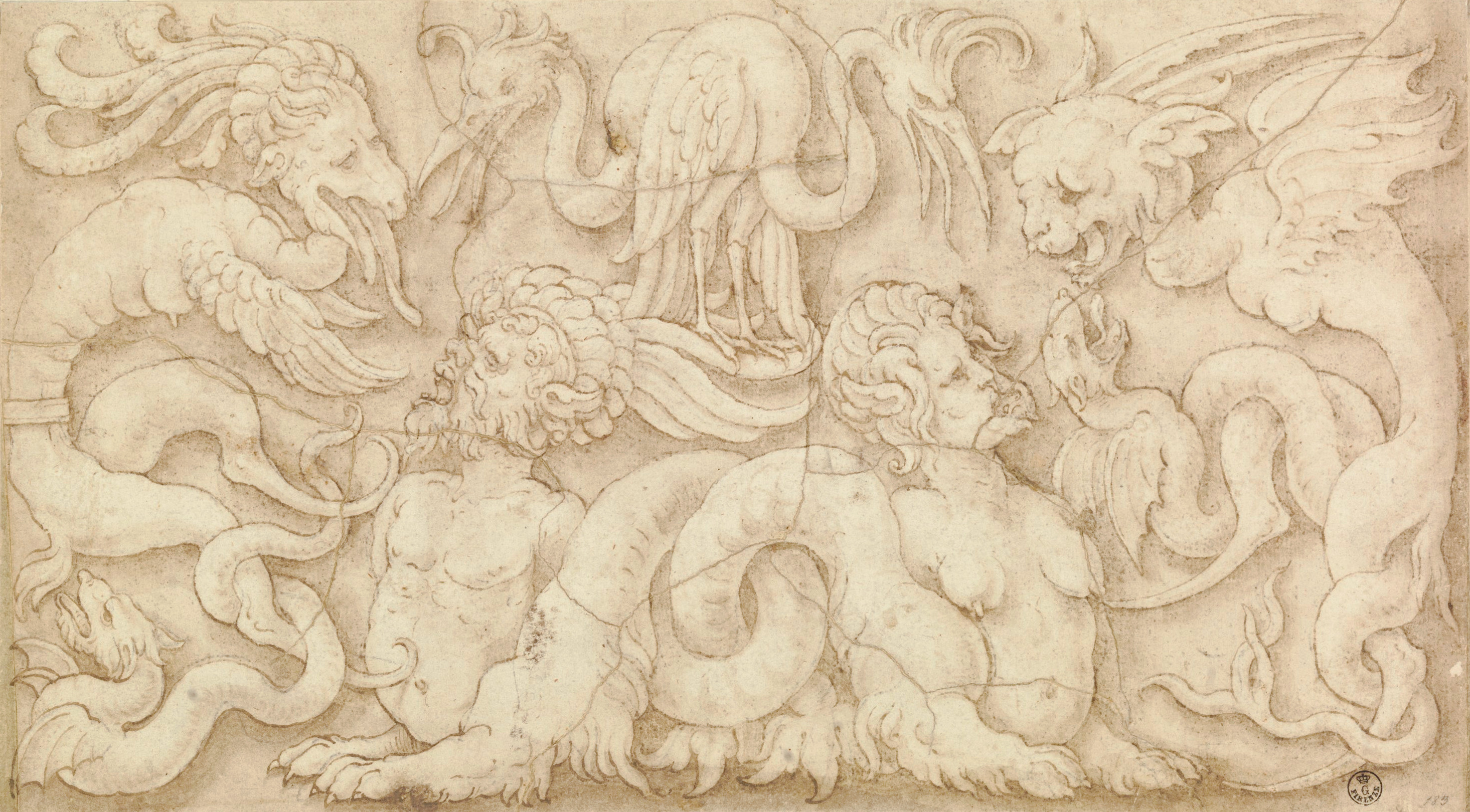 Inv. 1641 EThis drawing, which depicts a frieze with fantastical and anthropomorphized creatures, most likely dates from Amico's mature period, and specifically from a period of activity in the latter half of the 1530s. It is clear that Aspertini had come into contact with the work of Giulio Romano in Mantua: the massive bodies, which were a legacy of Michelangelo, are re-elaborated here into the grotesque key of the formal gigantism that was typical of Romano.