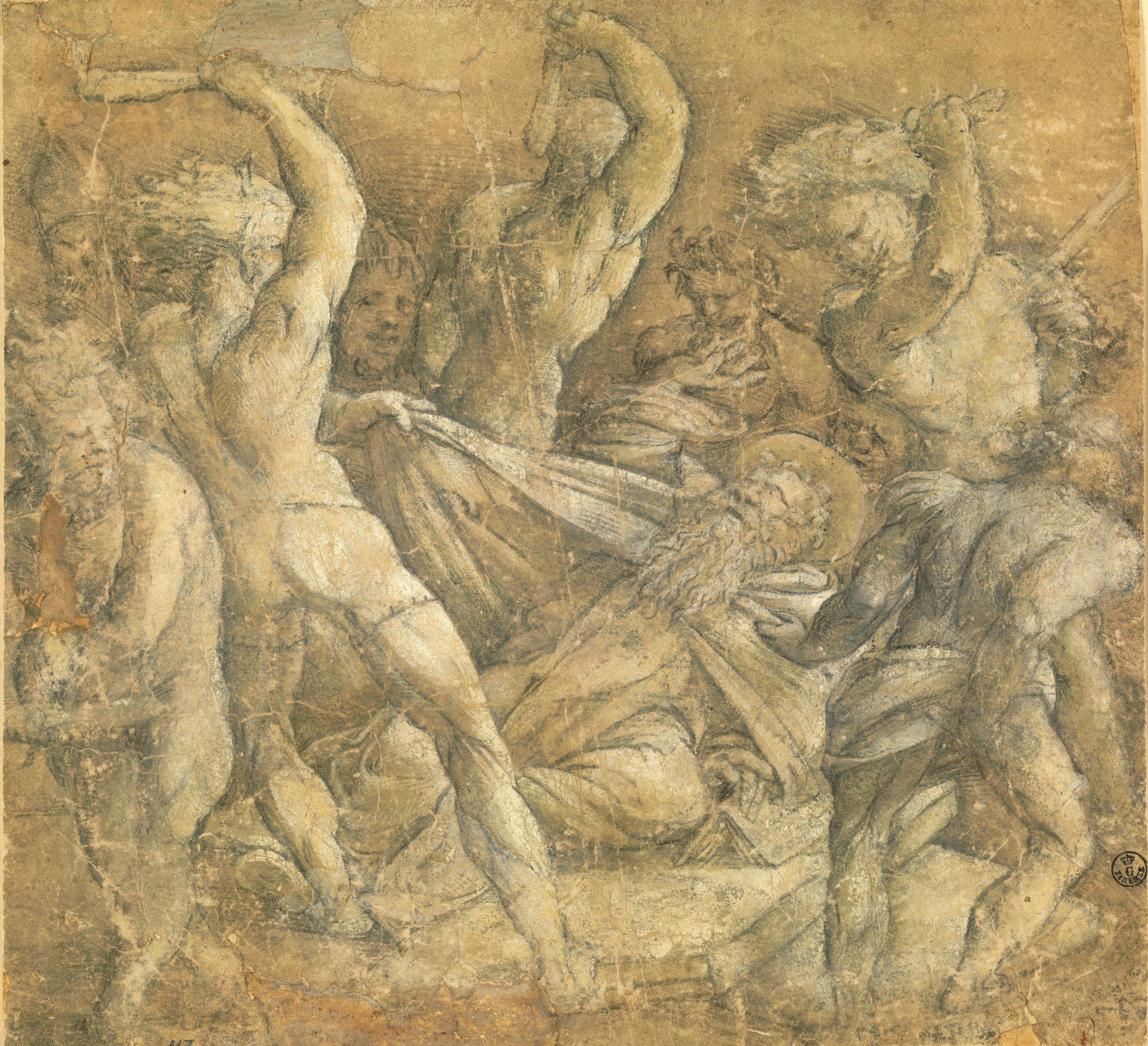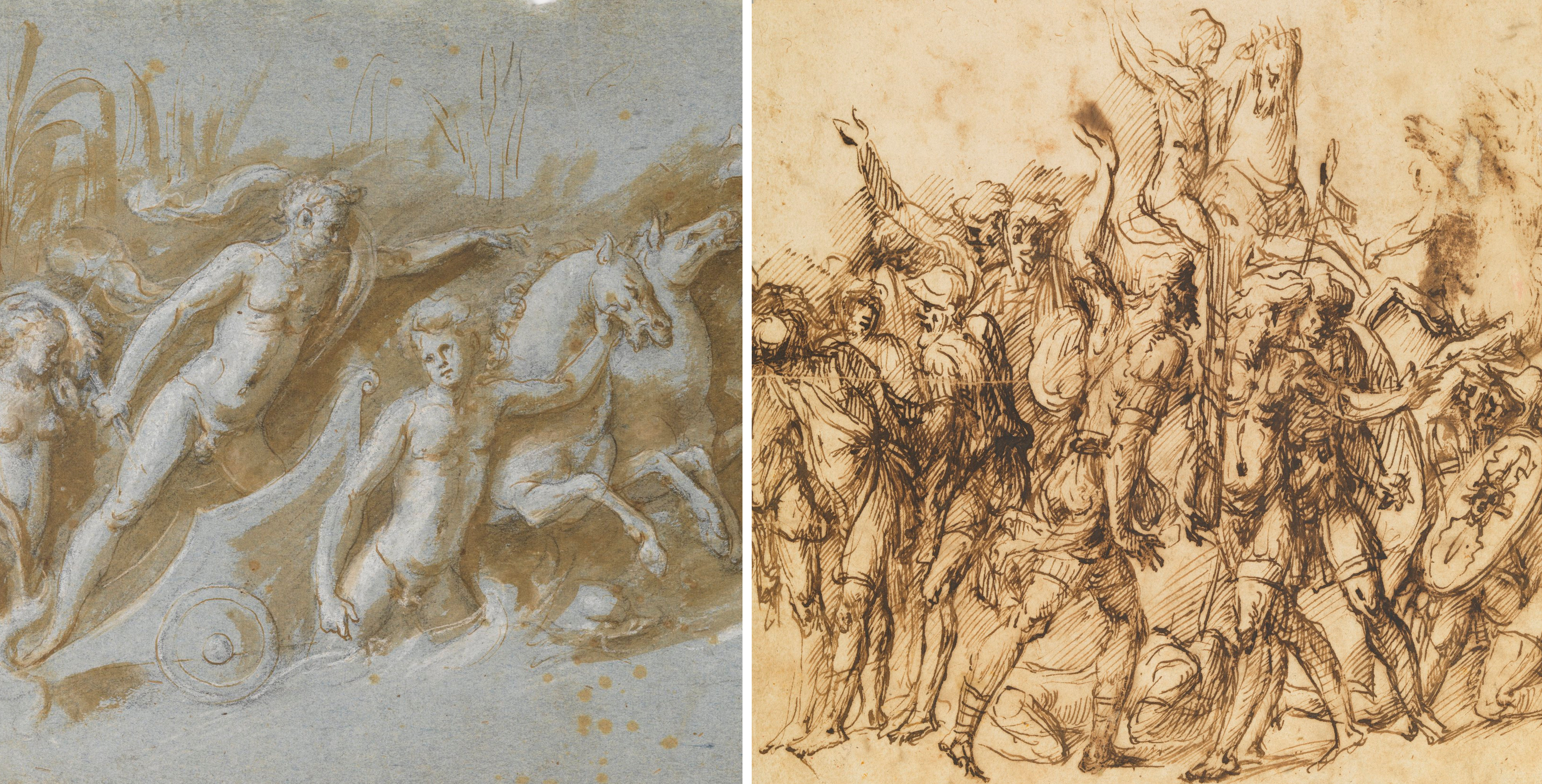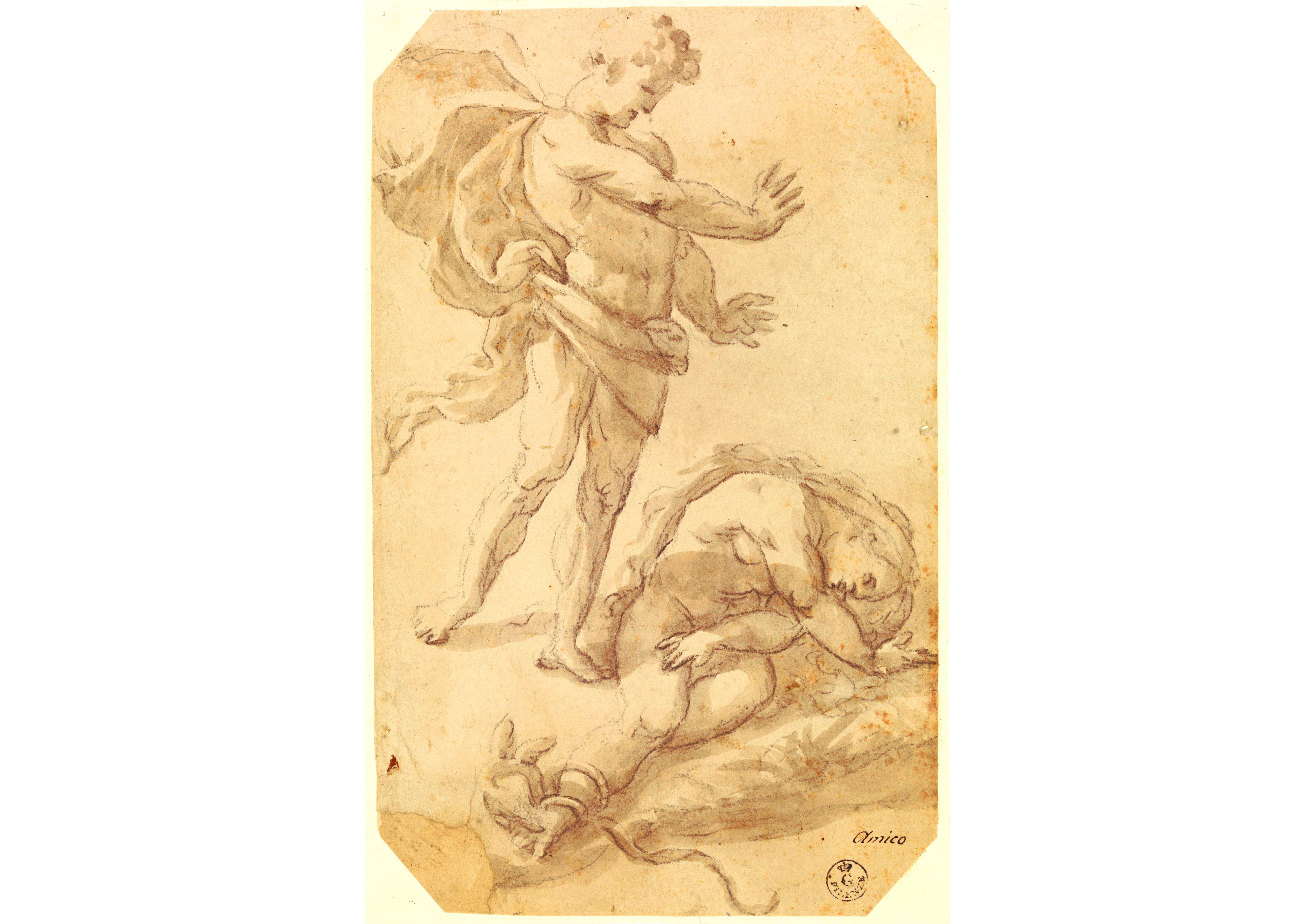 Reflecting on antiquity was a key aspect of the stratified culture of Bologna's artistic scene: classical models were updated and reinterpreted using examples by contemporary artists with whom the Bolognese School came into contact. Together with an updated and original interpretation of Michelangelo, we can identify an awareness of the work of Giulio Romano in Mantua (Rome, circa 1499 - Mantua, 1546) in some of Aspertini's drawings modeled on classical works, with the sprawling bodies surrounded by solid and compact lines. During the 1530s, Amico increasingly used diluted ink and white lead in order to create the effects of pictorial corrosion, with the aim of causing the forms to flake away.