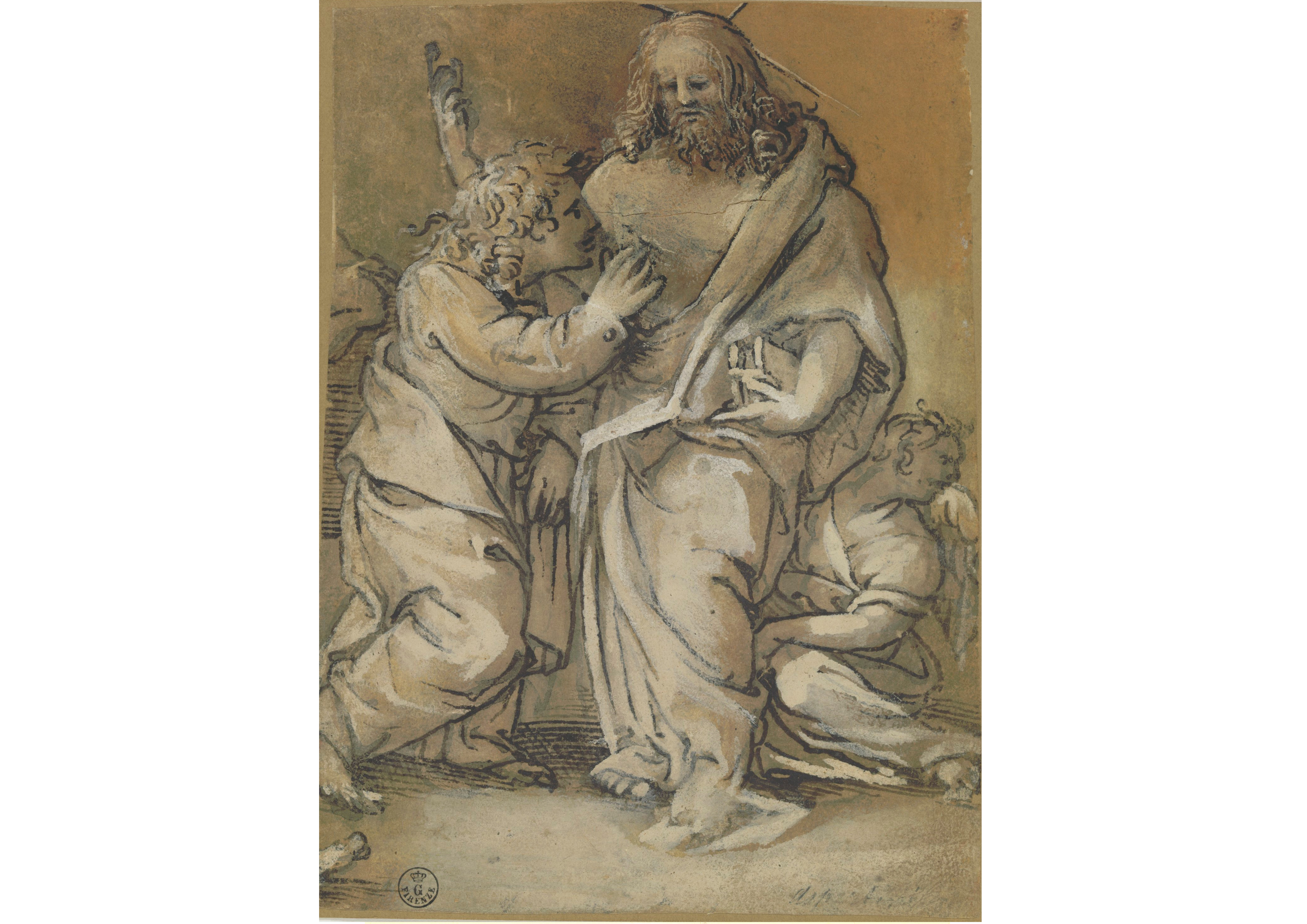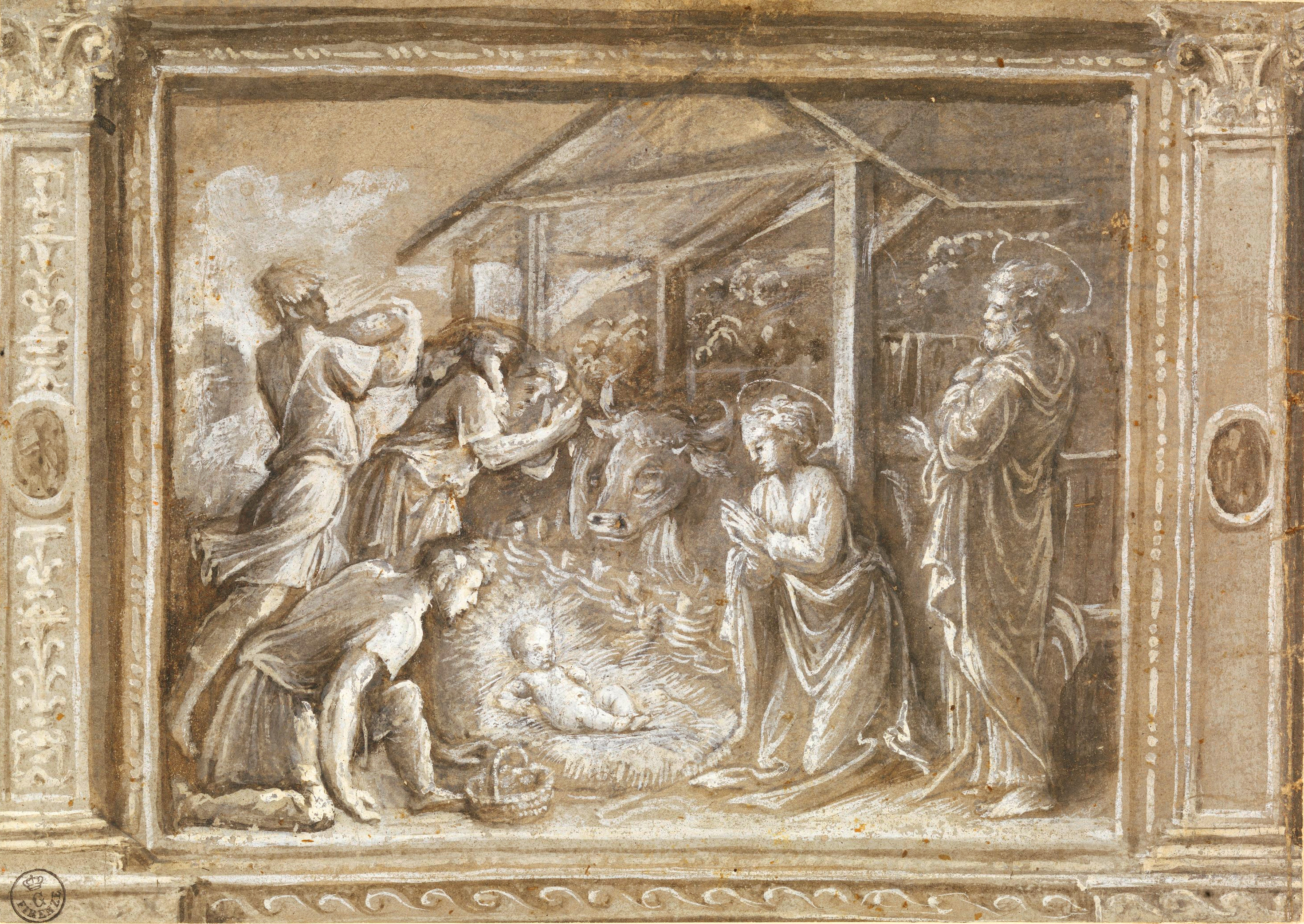 Inv. 1430 FThis drawing, which dates from the first half of the 1520s, bears the hallmarks of Raphael. In particular, it returns to the iconographic motif from ‘The Adoration of the Shepherds’ created by Raphael in the latter half of the 1520s, which was used in several versions created by his pupils. The scene here is more symmetrical and simpler than the prototype; Bagnacavallo adapts Raphael's model in a softer, more faithful style. The artist's careful attempt to recreate the qualities of a painting using white lead and two shades of ink on a tinted background testify to his close relationship with Biagio Pupini. Stylistically speaking, however, Bagnacavallo shows a greater level of formal firmness.