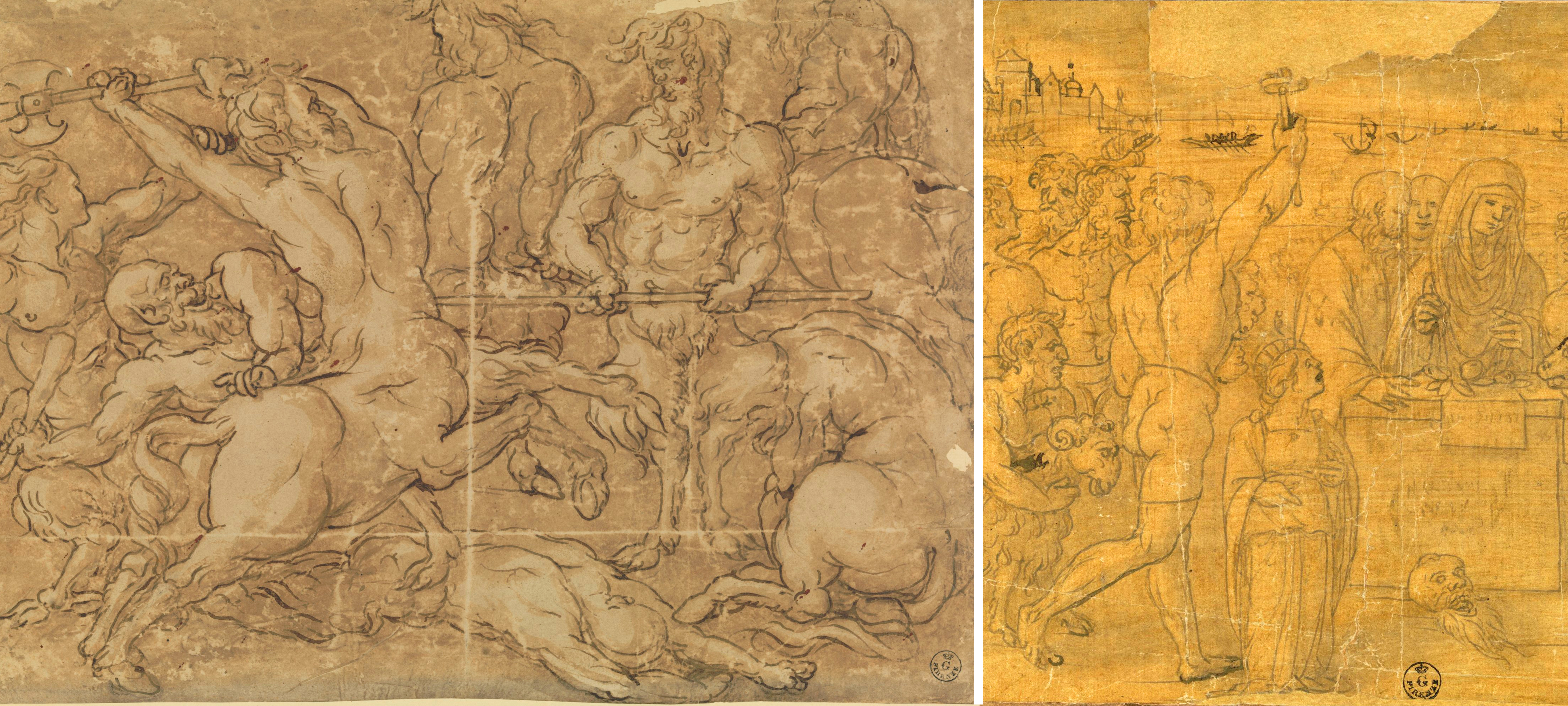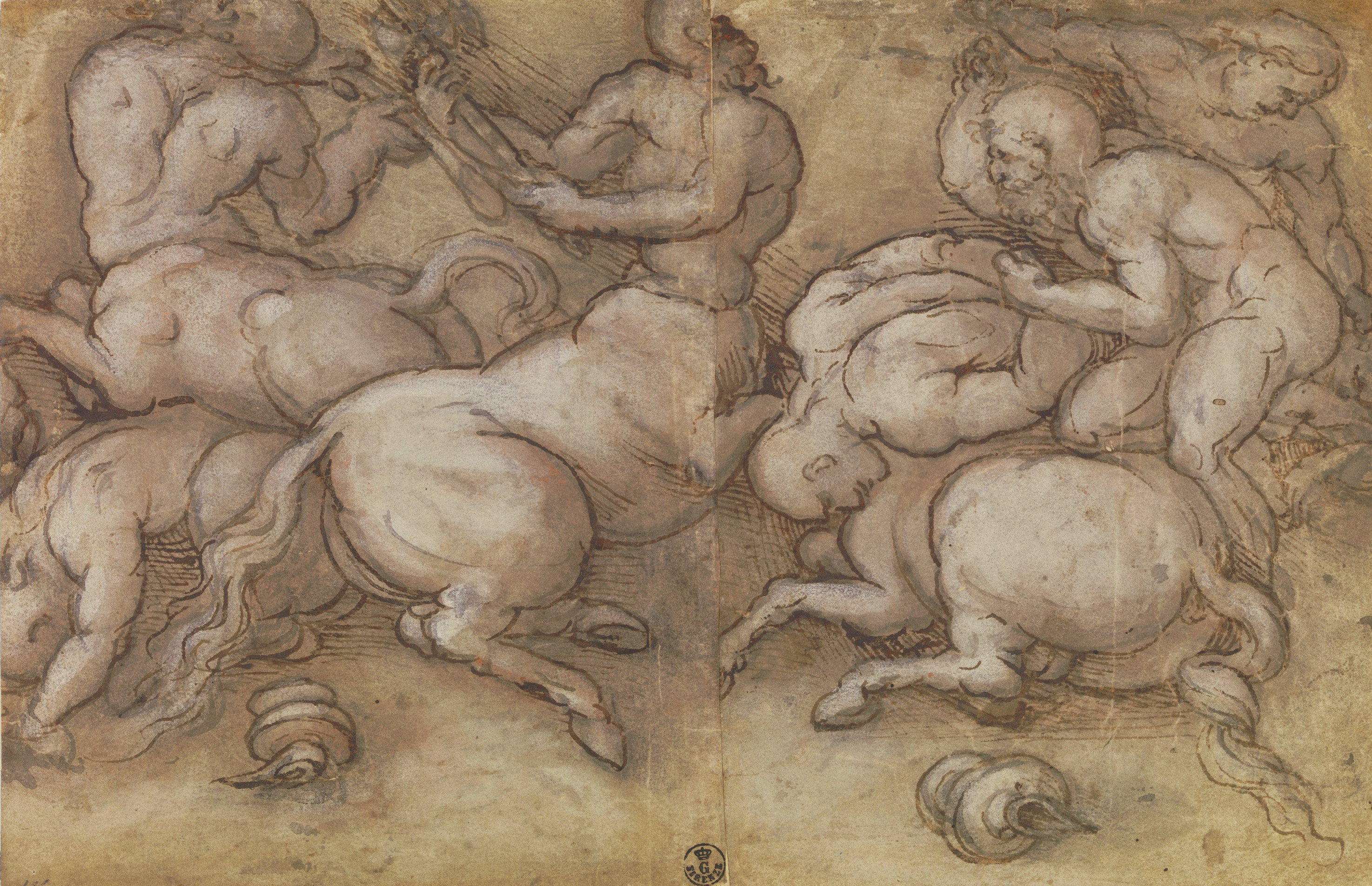 Inv. 1383 E rectoThe subjects are taken from a sarcophagus depicting the ‘Battle of the Centaurs’ which must have been in Rome at the turn of the 16th century. The sarcophagus is now lost, but drawings of it remain, along with a cast kept at Palazzo Peruzzi in Florence. The drawing represents only the central section of the front panel of the sarcophagus, and we can observe in it a certain degree of interpretative freedom in comparison to the original design. The centaur bent forwards, for example, is a variation added by Aspertini. The Bolognese artist established a profound dialogue with classical art. This increasingly gave him room to reinterpret the originals (within certain limits) as time went on, as similar deviations from the source demonstrate. Amico frequently returned to the same motif taken from ancient art, reworking it in various studies depending on his needs and the style he wished to use.