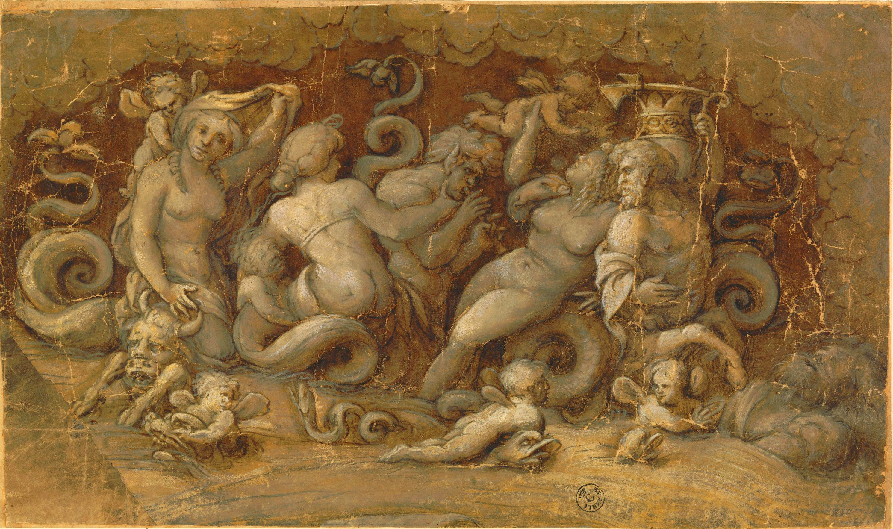 Inv. 14637 FIt is plausible to conclude that this composition featuring marine deities is linked to a larger mural based on ancient art, given its unusual iconography and striking painting-like qualities. With its violent and dramatic tone, the work represents the personal interpretation of an iconographic theme derived from antiquity. The artist subjects the model to an original reworking which takes it beyond a simple classicist reproduction.