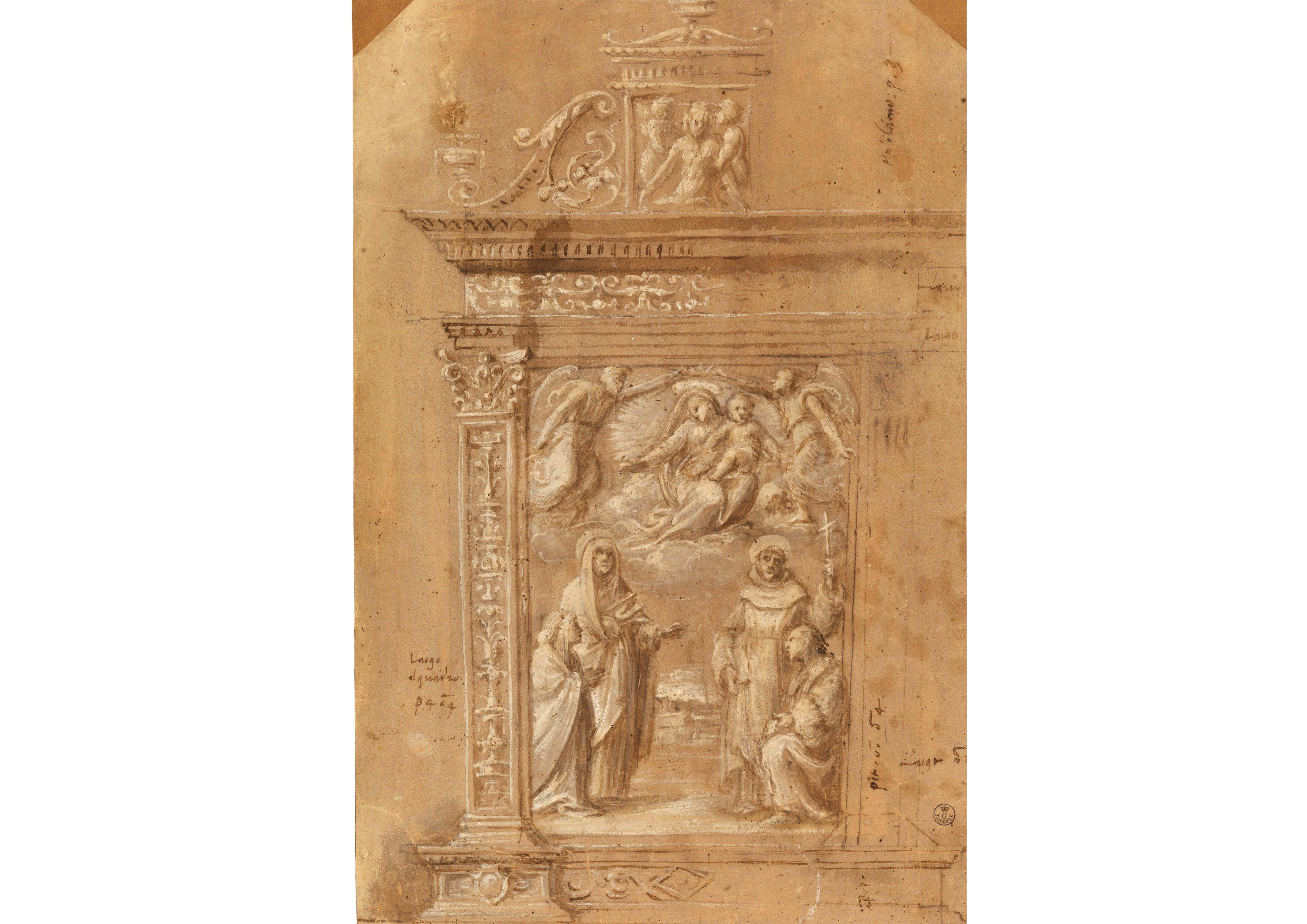 Inv. 1755 OThis study, which dates from around 1530, is a preparatory sketch for the painting ‘Virgin with Child in Glory Crowned by Angels with Saints Monica and Francis and Two Clients’, painted by Bagnacavallo for the church of Santa Maria della Misericordia in Bologna. The brushstrokes in white lead create effects of light and shade, mainly apparent in the figure of the Virgin and the depiction of the countryside. This technique shows the influence of Girolamo Da Carpi's style on Bagnacavallo, and more generally the artist's use of expressive methods taken from the art of Ferrara.