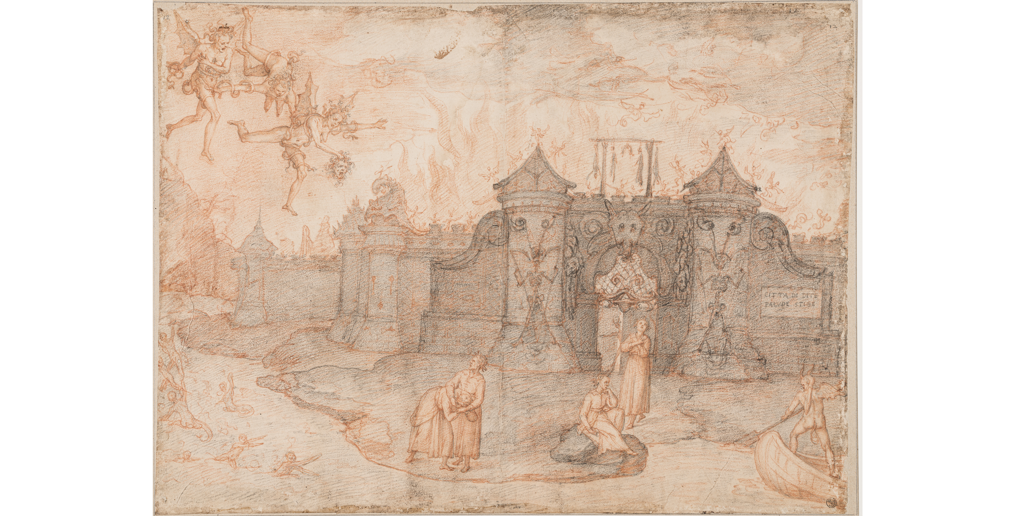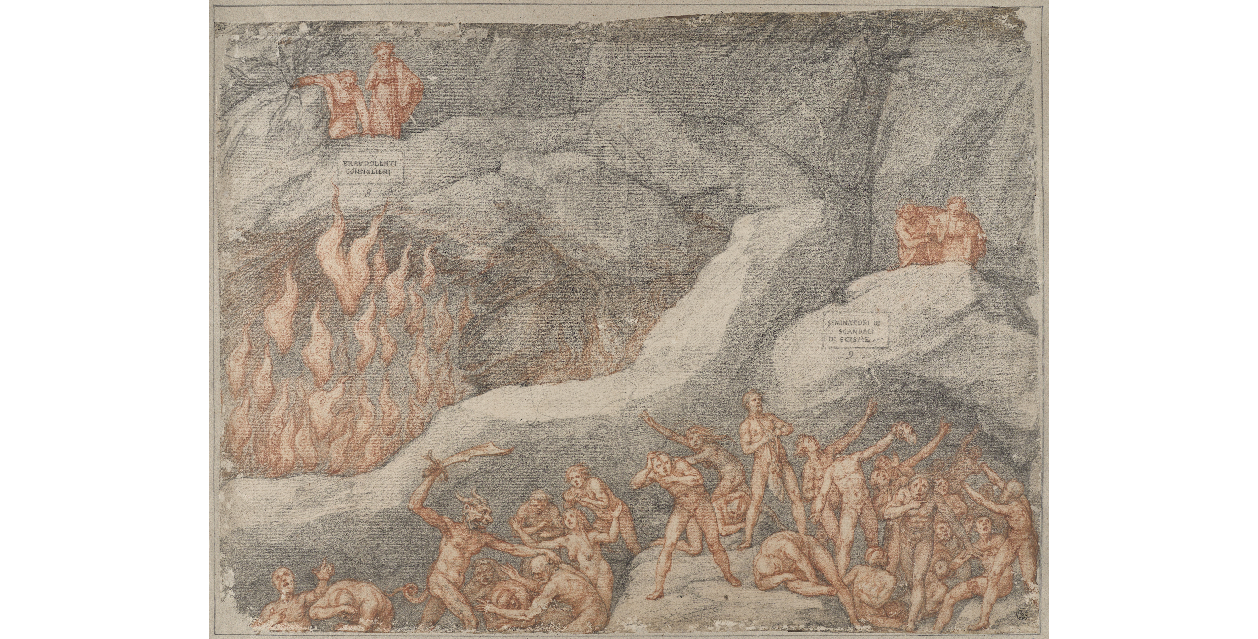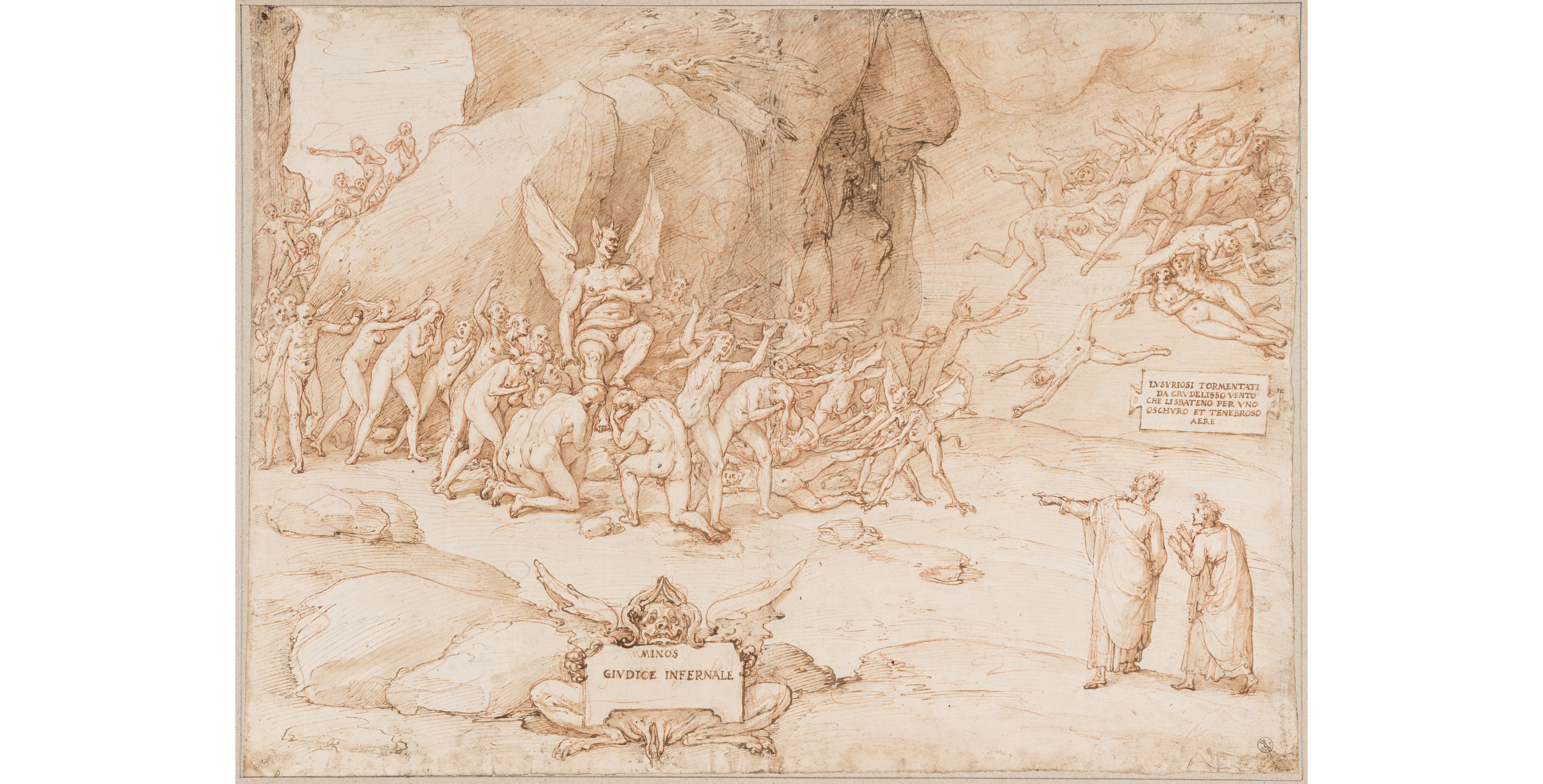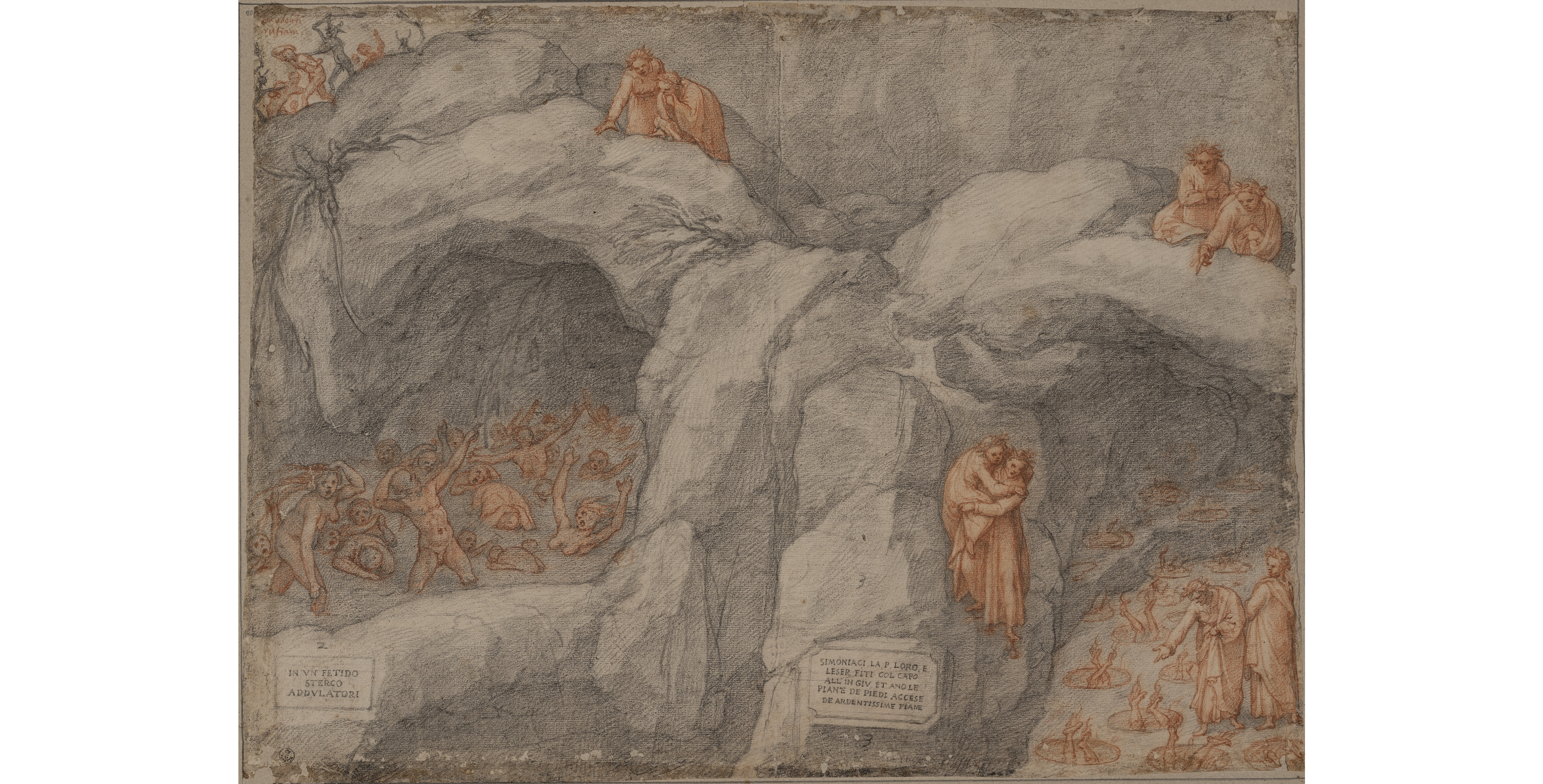 The 28 drawings dedicated to the representation of Dante's Inferno are mostly carried out by alternating the use of red and black pencils. This two-color graphic technique allows Federico Zuccari, on the one hand, to clearly highlight the figures from the background, and, on the other, to masterly translate the violent contrasts of light and shadow that characterises the appalling infernal landscape. The sheets, all of similar dimensions (approximately 440 x 590 mm), were bound inside a seventeenth-century volume so that each illustration had, on the page to its left, the corresponding verses and commentary. The complex interweaving of words and images was also enriched by the cartouches depicted in the drawings, which clarified the meaning of some details as well as some narrative passages.