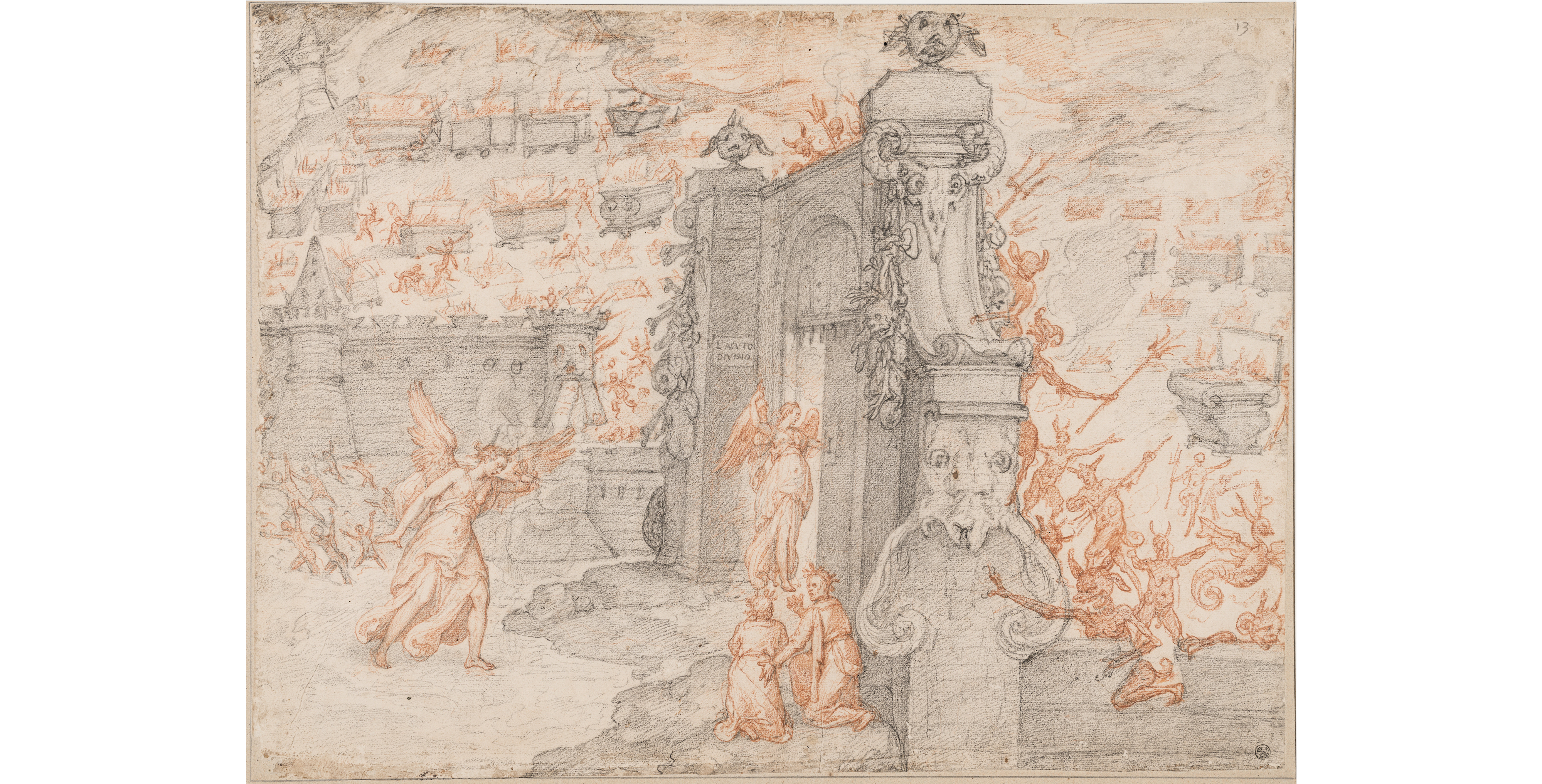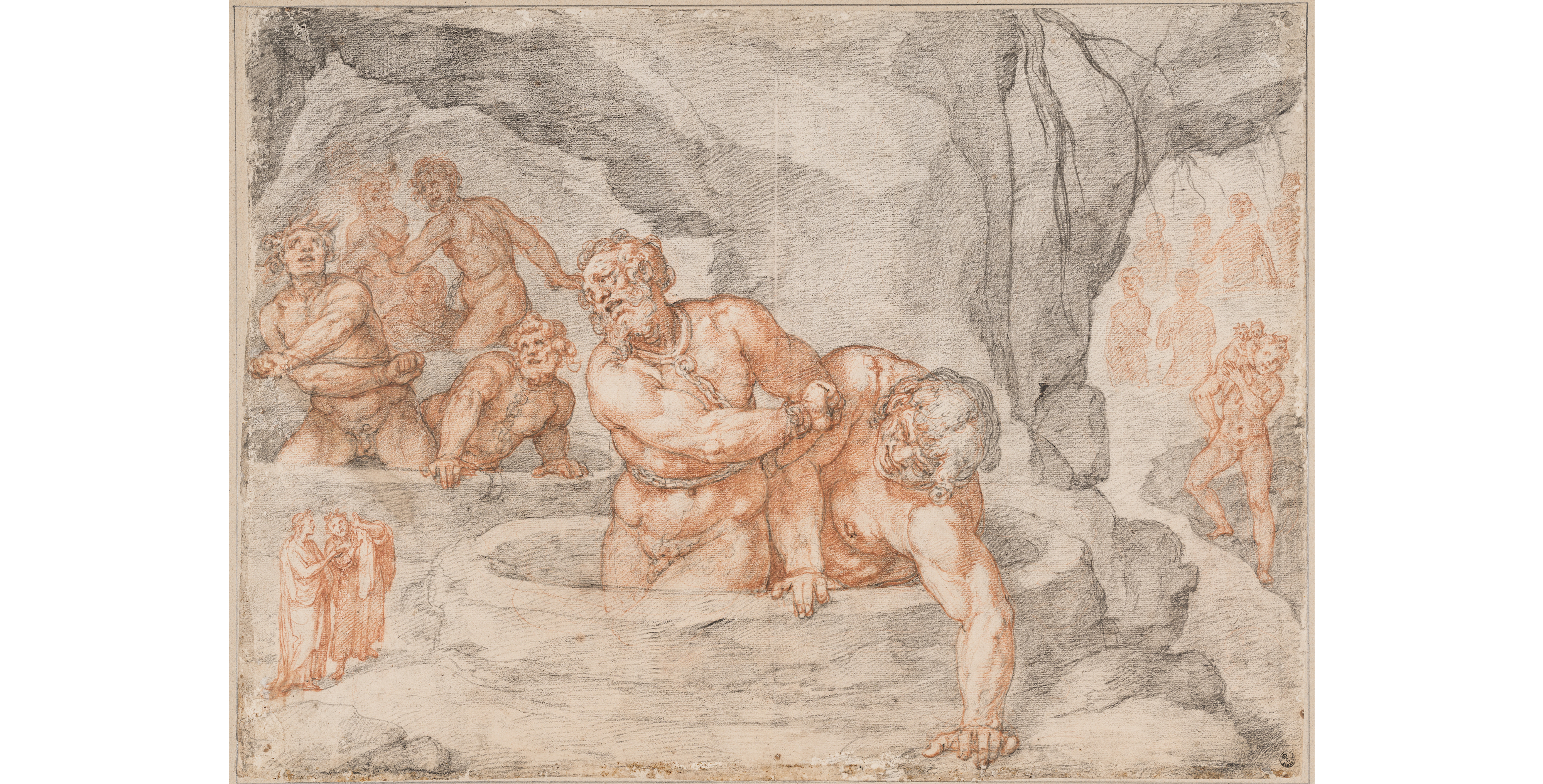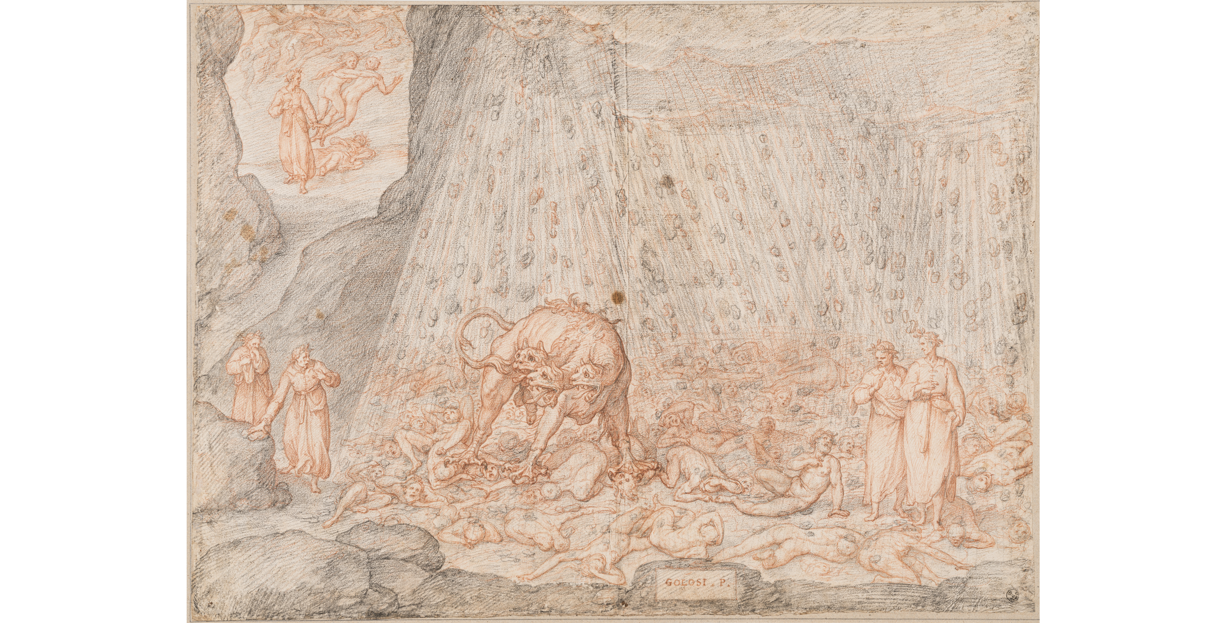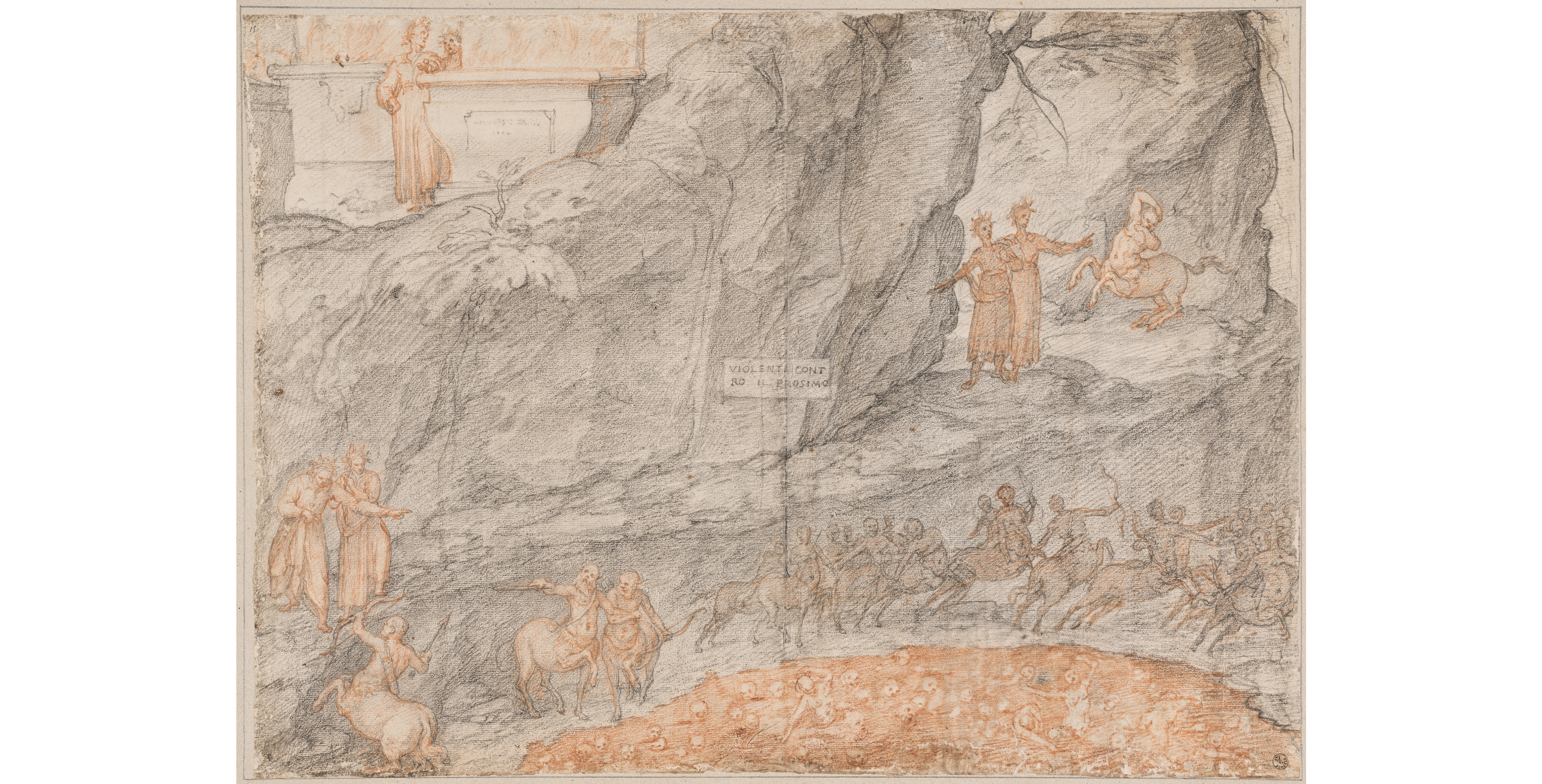 The 28 drawings dedicated to the representation of Dante's Inferno are mostly carried out by alternating the use of red and black pencils. This two-color graphic technique allows Federico Zuccari, on the one hand, to clearly highlight the figures from the background, and, on the other, to masterly translate the violent contrasts of light and shadow that characterises the appalling infernal landscape. The sheets, all of similar dimensions (approximately 440 x 590 mm), were bound inside a seventeenth-century volume so that each illustration had, on the page to its left, the corresponding verses and commentary. The complex interweaving of words and images was also enriched by the cartouches depicted in the drawings, which clarified the meaning of some details as well as some narrative passages.