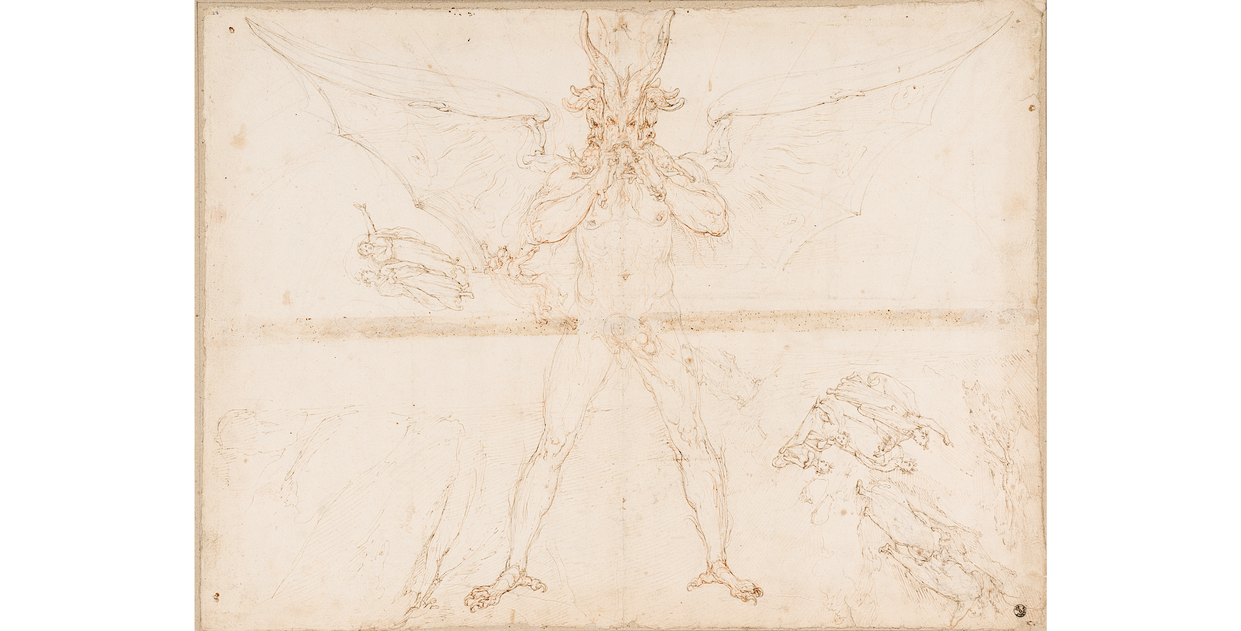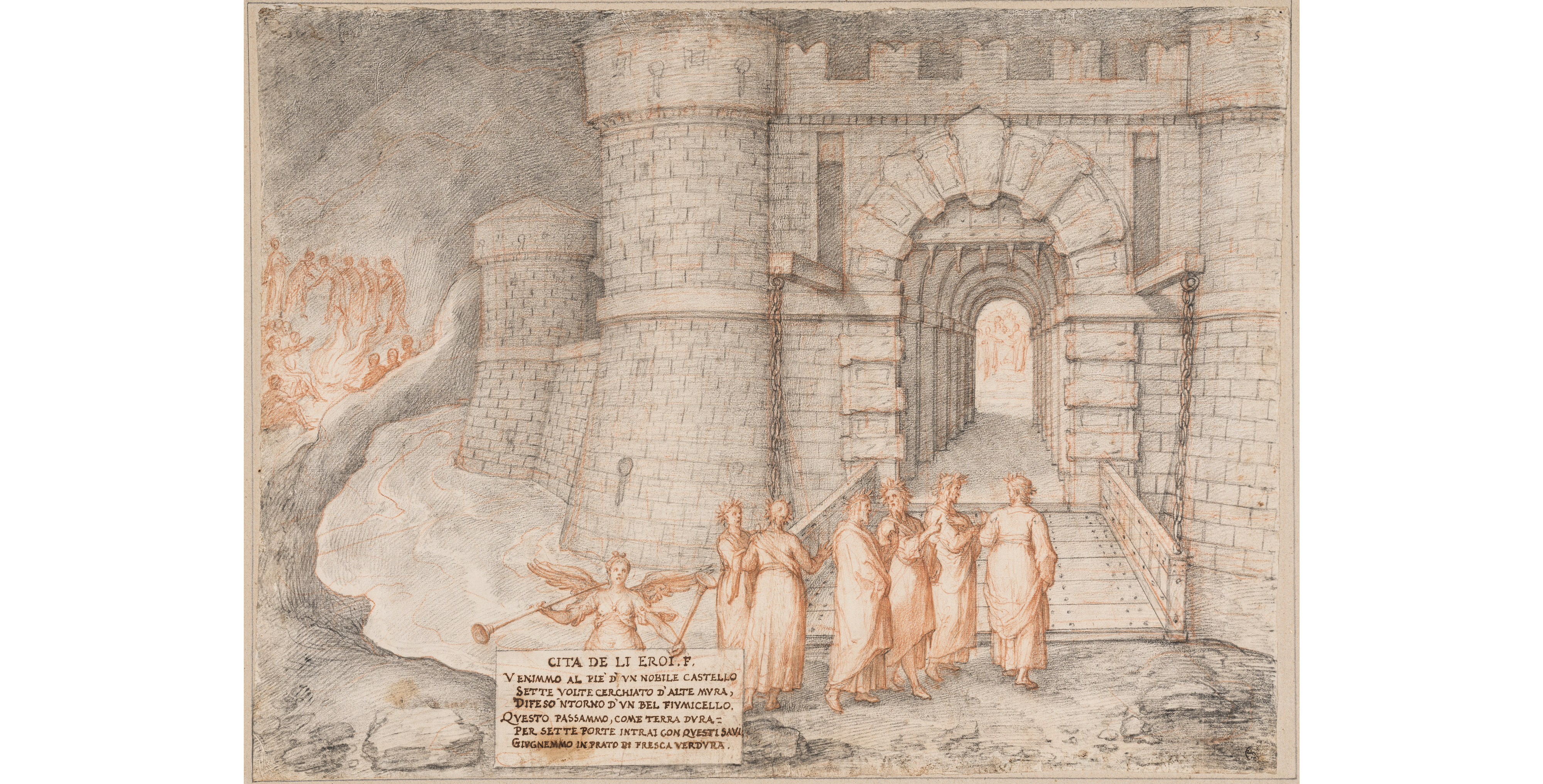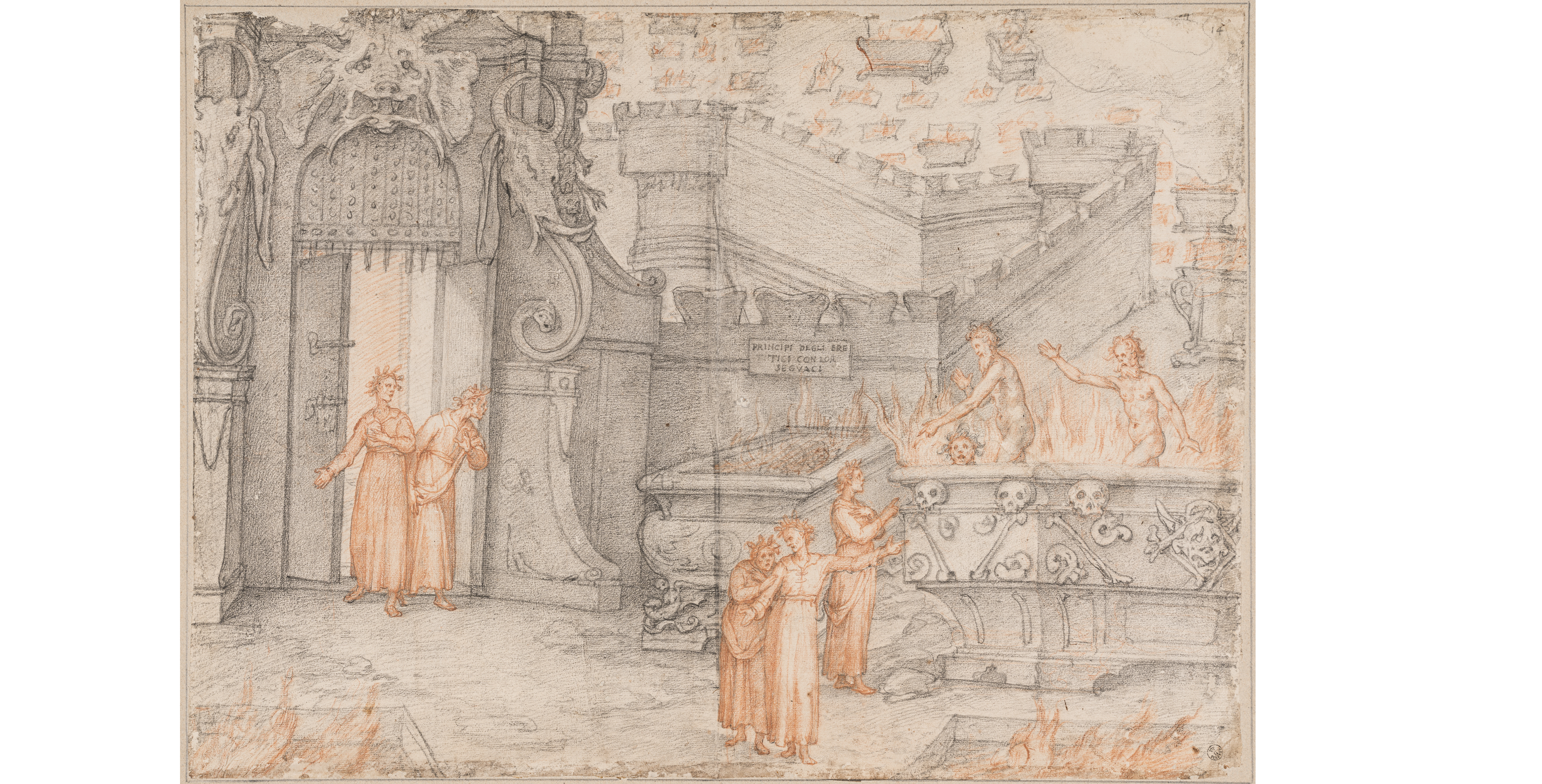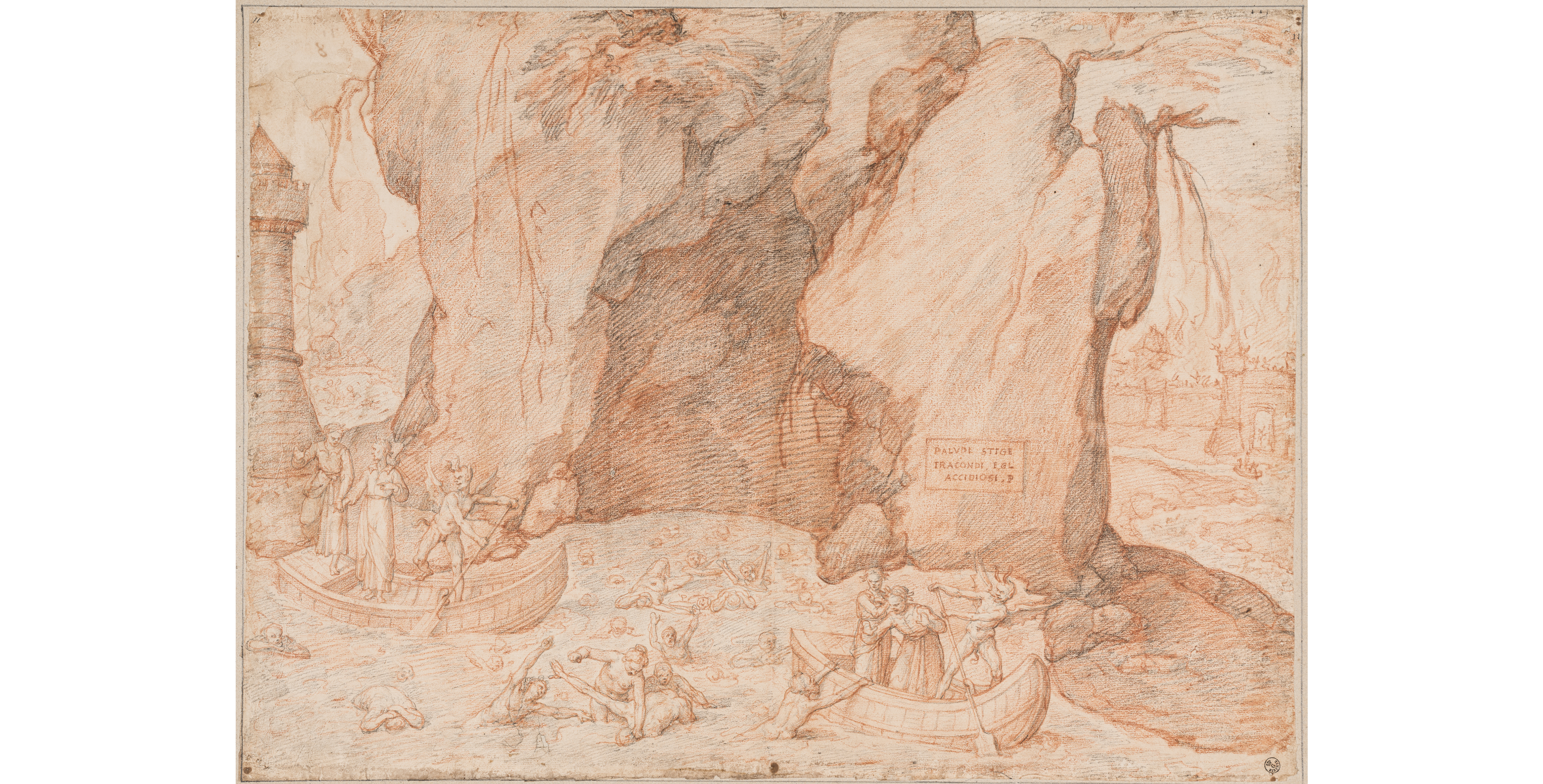 The 28 drawings dedicated to the representation of Dante's Inferno are mostly carried out by alternating the use of red and black pencils. This two-color graphic technique allows Federico Zuccari, on the one hand, to clearly highlight the figures from the background, and, on the other, to masterly translate the violent contrasts of light and shadow that characterises the appalling infernal landscape. The sheets, all of similar dimensions (approximately 440 x 590 mm), were bound inside a seventeenth-century volume so that each illustration had, on the page to its left, the corresponding verses and commentary. The complex interweaving of words and images was also enriched by the cartouches depicted in the drawings, which clarified the meaning of some details as well as some narrative passages.