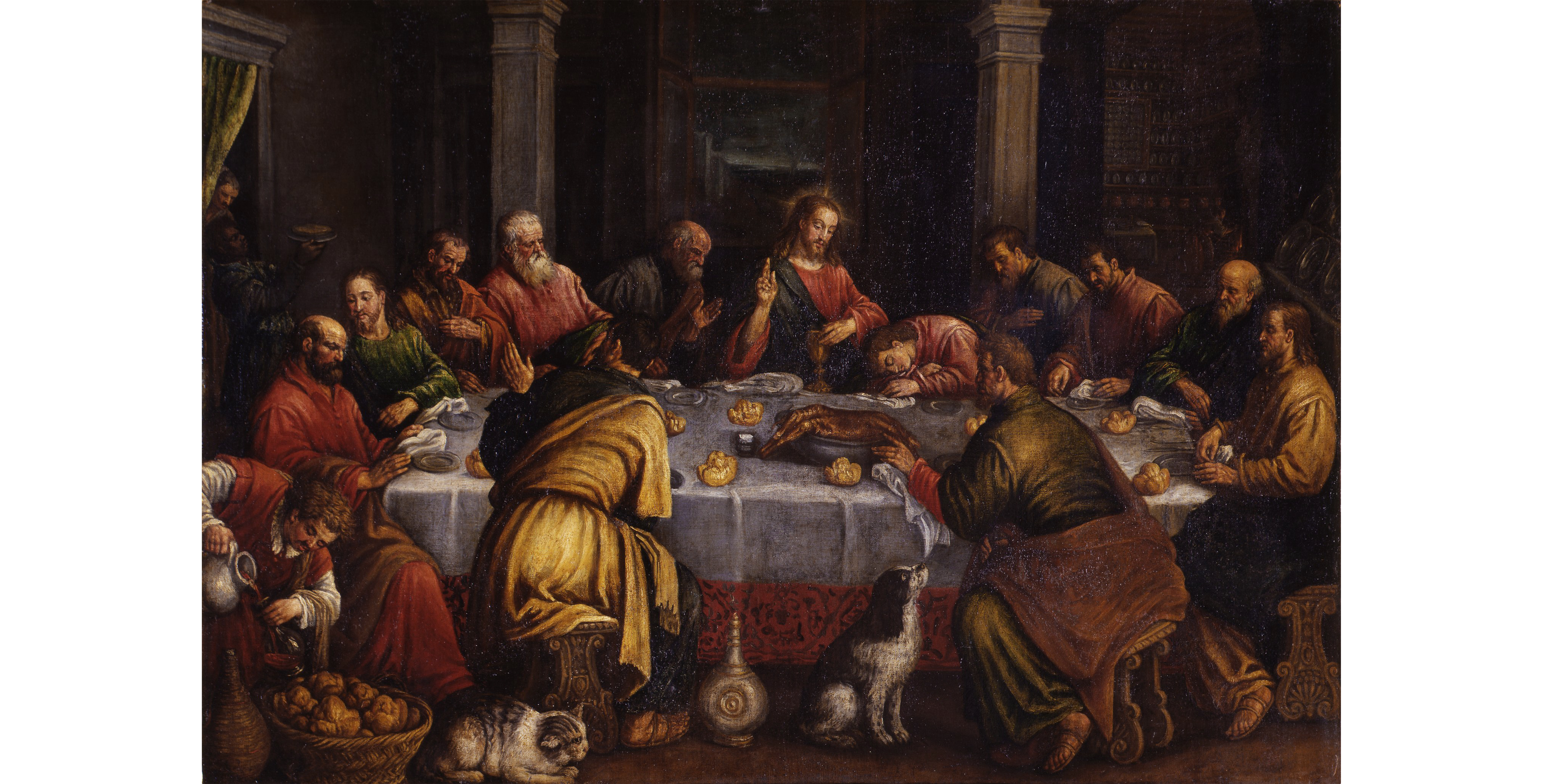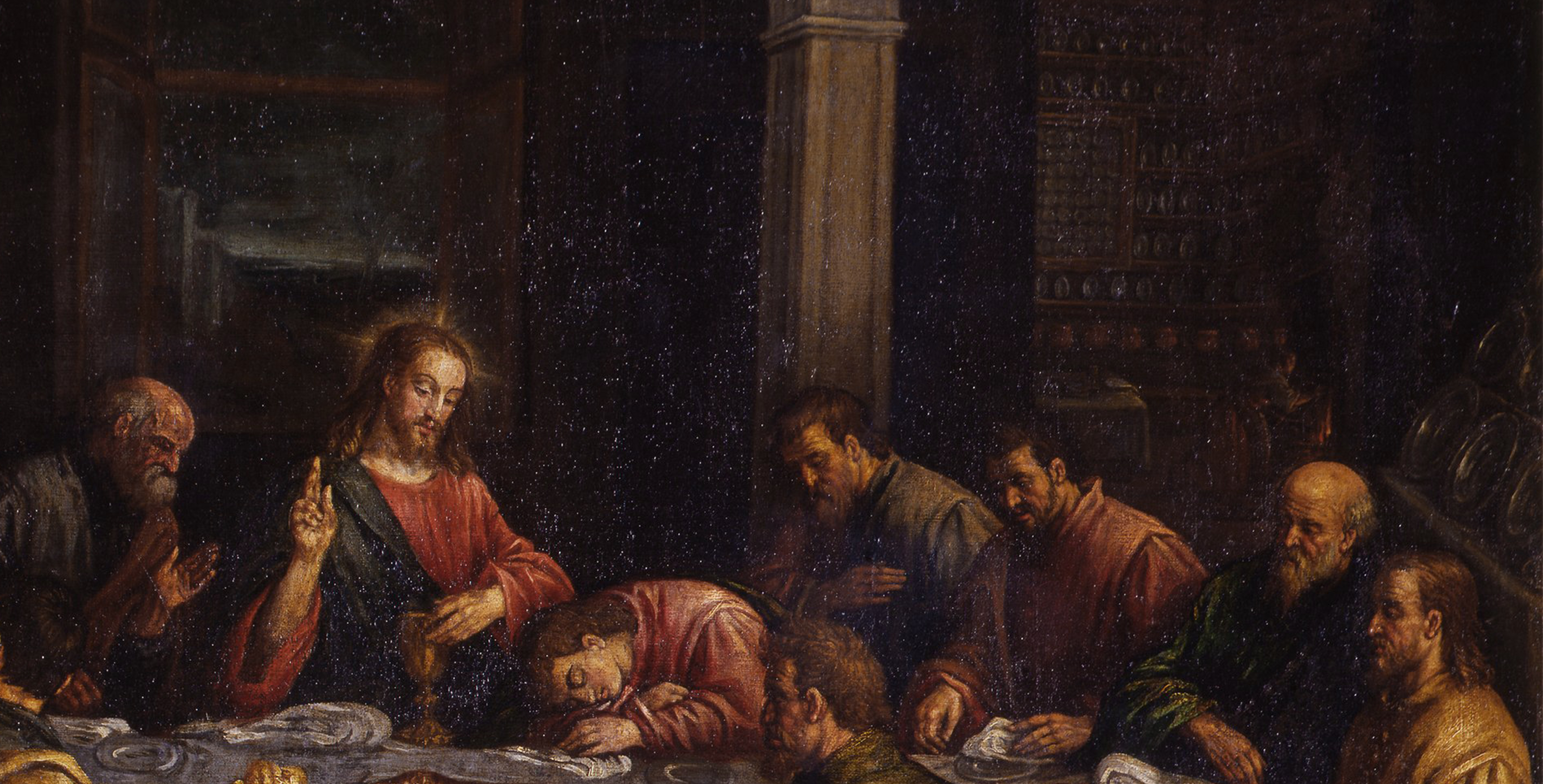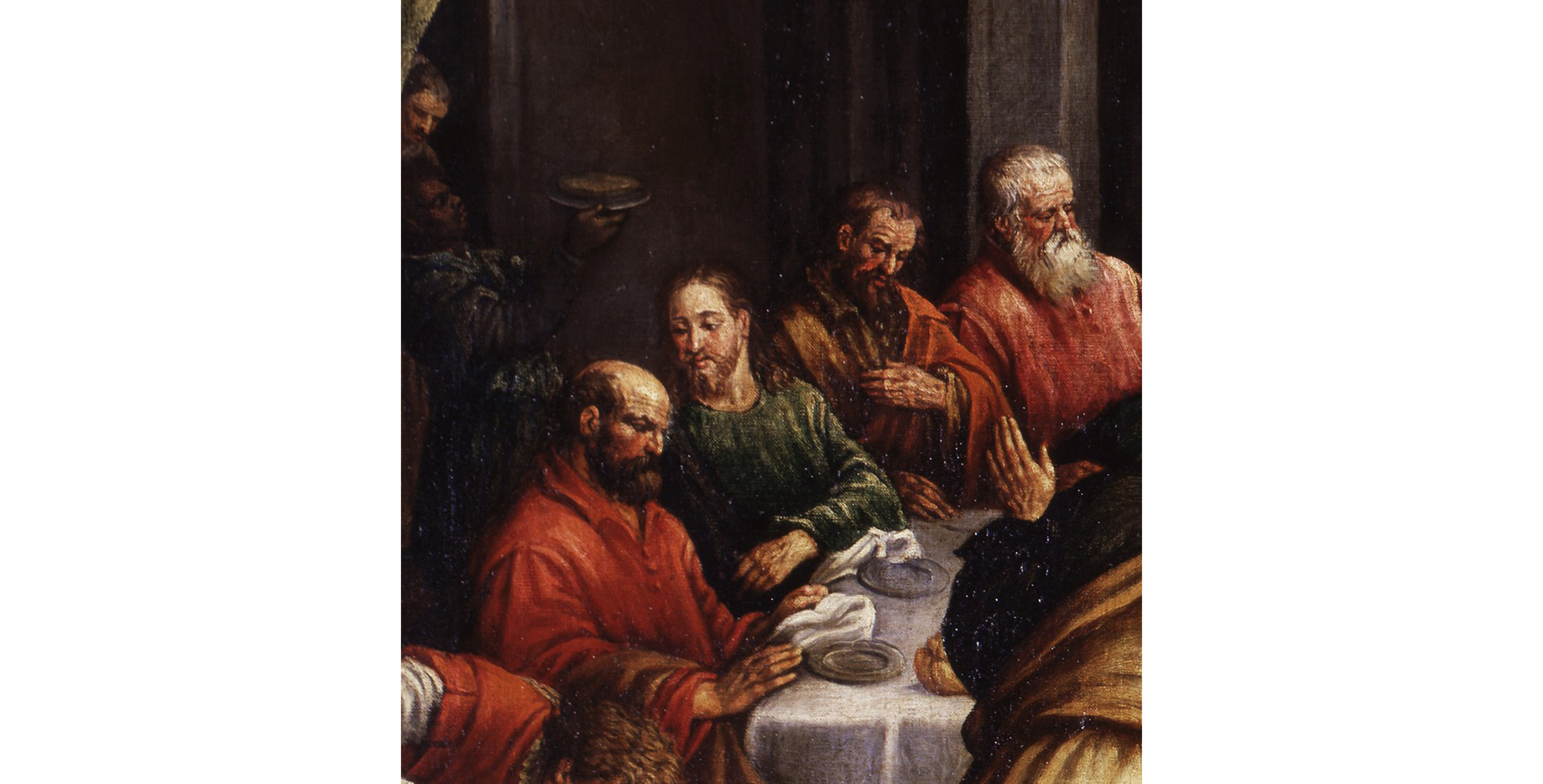 Arriving in Florence from Urbino with the rich dowry of Vittoria Della Rovere in 1631 for her marriage to Ferdinand II, this painting depicts the Last Supper of Christ, which consecrates bread and wine, foreshadowing his sacrifice on the Cross to atone for the sins of humanity. The former symbolizes his body, and the latter his blood.