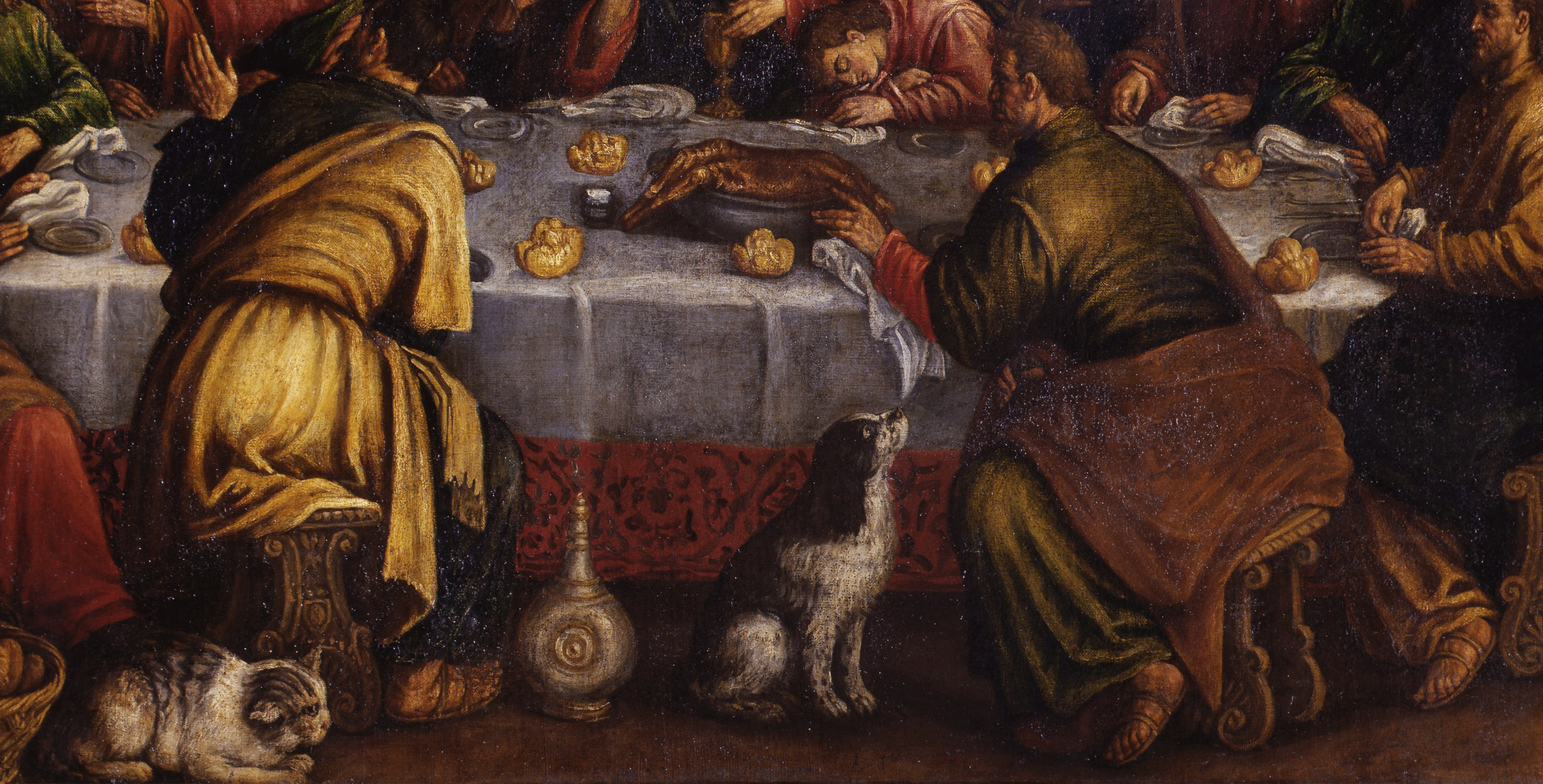 Many genre details give the appearance of a daily atmosphere, as indicated by the presence of some subjects such as the cat crouching in the foreground to monitor its surroundings, the dog begging for some crumbs, and the servant of African origin with the plate in his hand.
