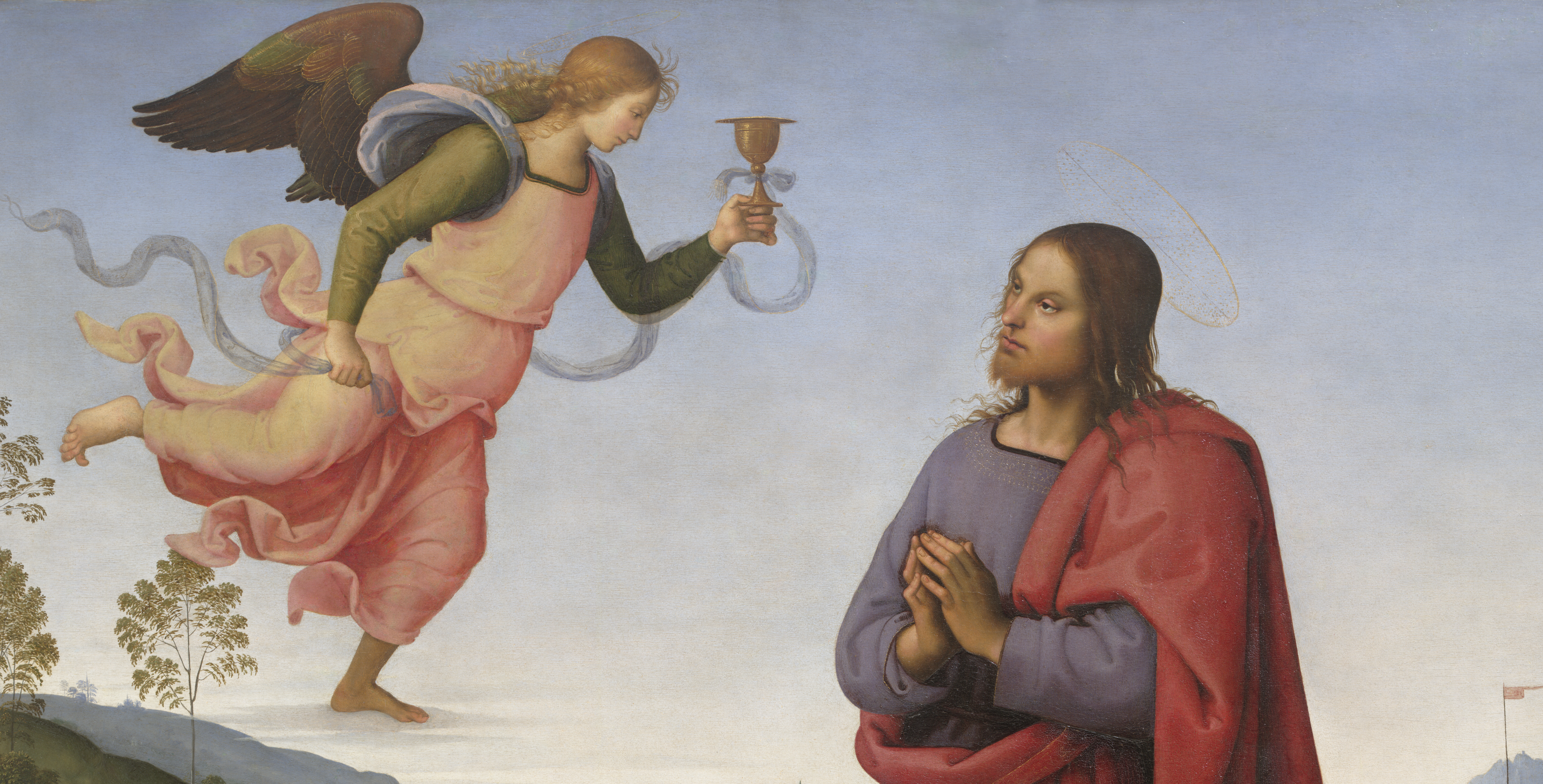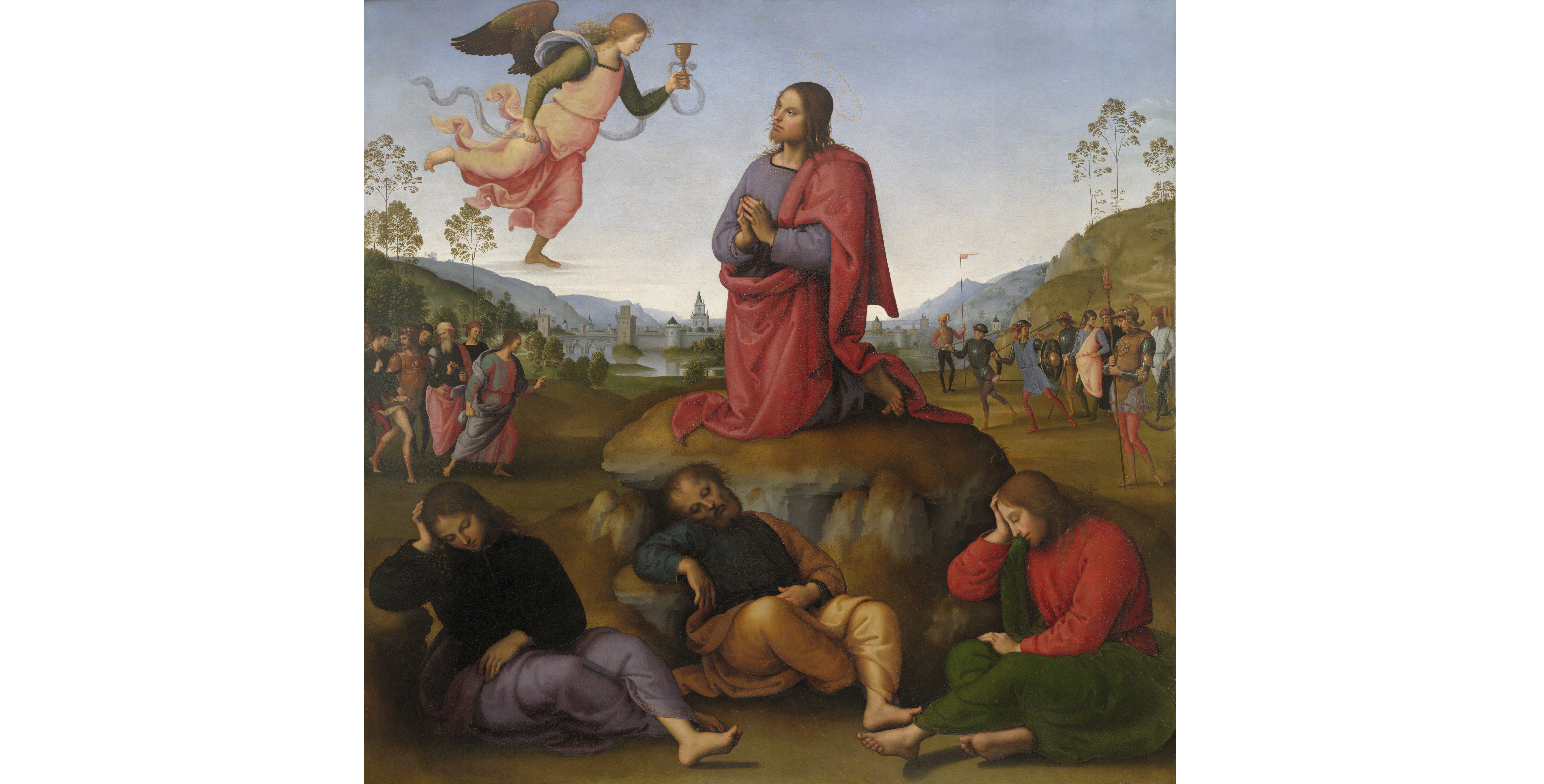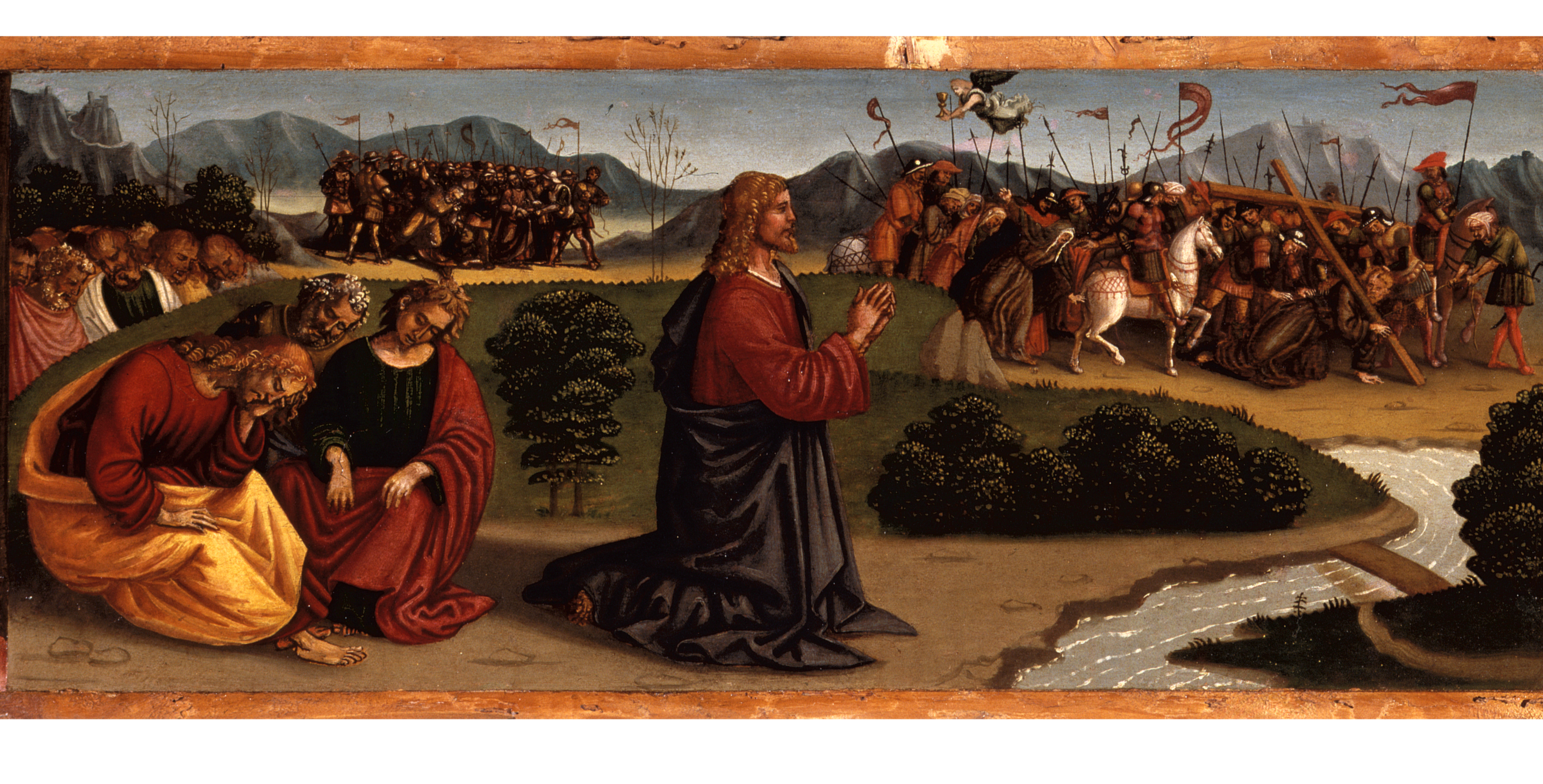 The evangelical episode illustrated in this painting refers to the hours following the Last Supper. This passage is one of the most moving of the story of Christ’s Passion: a suffering Jesus retires to pray, seeking the companionship and comfort of three apostles who, however, fall asleep, leaving him alone. The artist emphasizes this state of solitude and exhaustion by placing Christ in the center, kneeling on a rocky spur, in a quiet dialogue with the angel who offers him the chalice of passion.