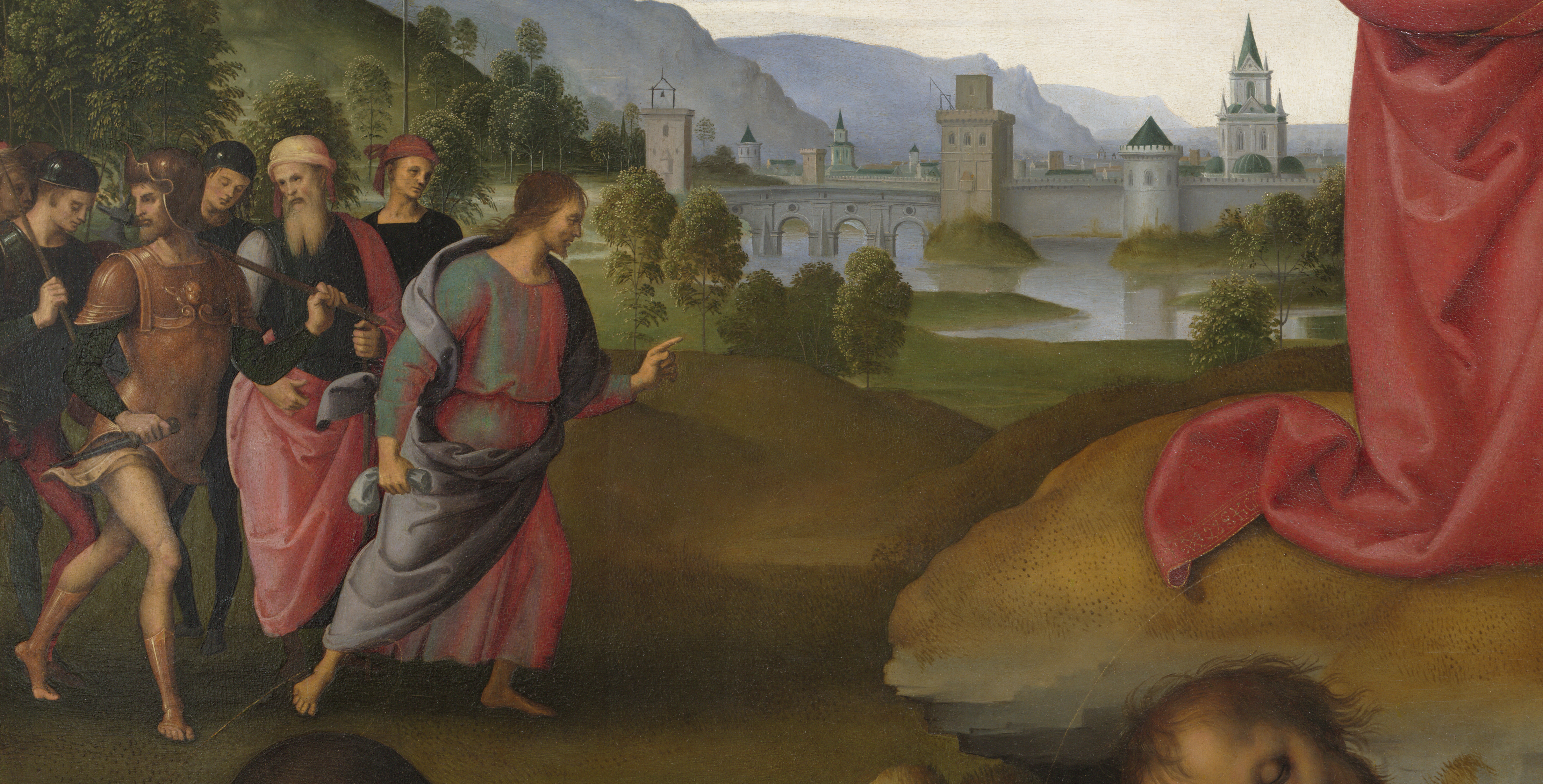 On the top of the rocky spur, Signorelli offers us a view of the town, in which we can recognize a reference to Castel Sant’Angelo in the building located right on the cliff. On the left, there is a temple in ruins, which was broken in half when Jesus died. The Gospel refers to a parallel between the ruined temple and the lifeless body of Christ, for Christ is resurrected after three days, and the temple of Jerusalem is rebuilt under the reign of the new religion of Christianity.