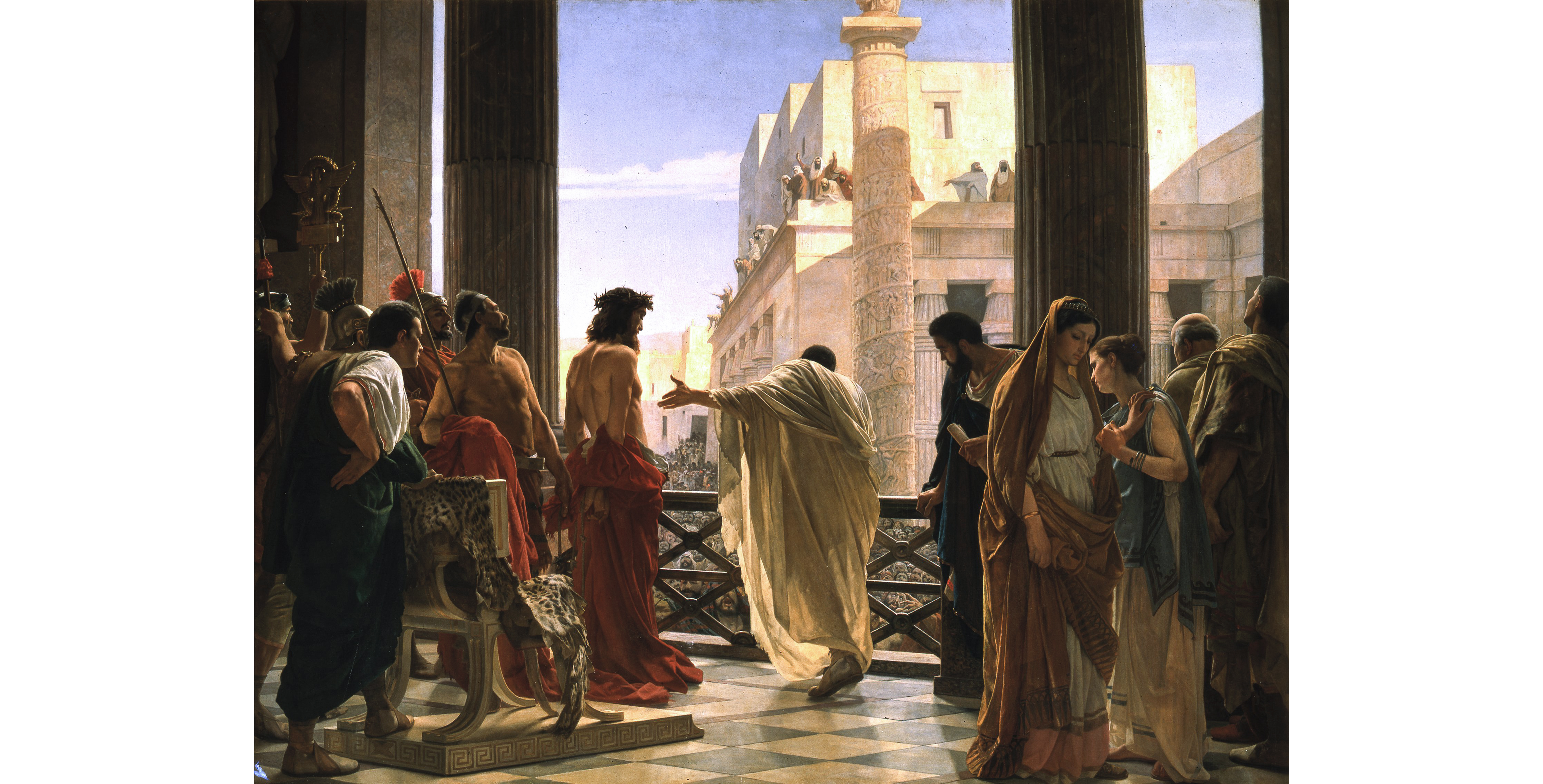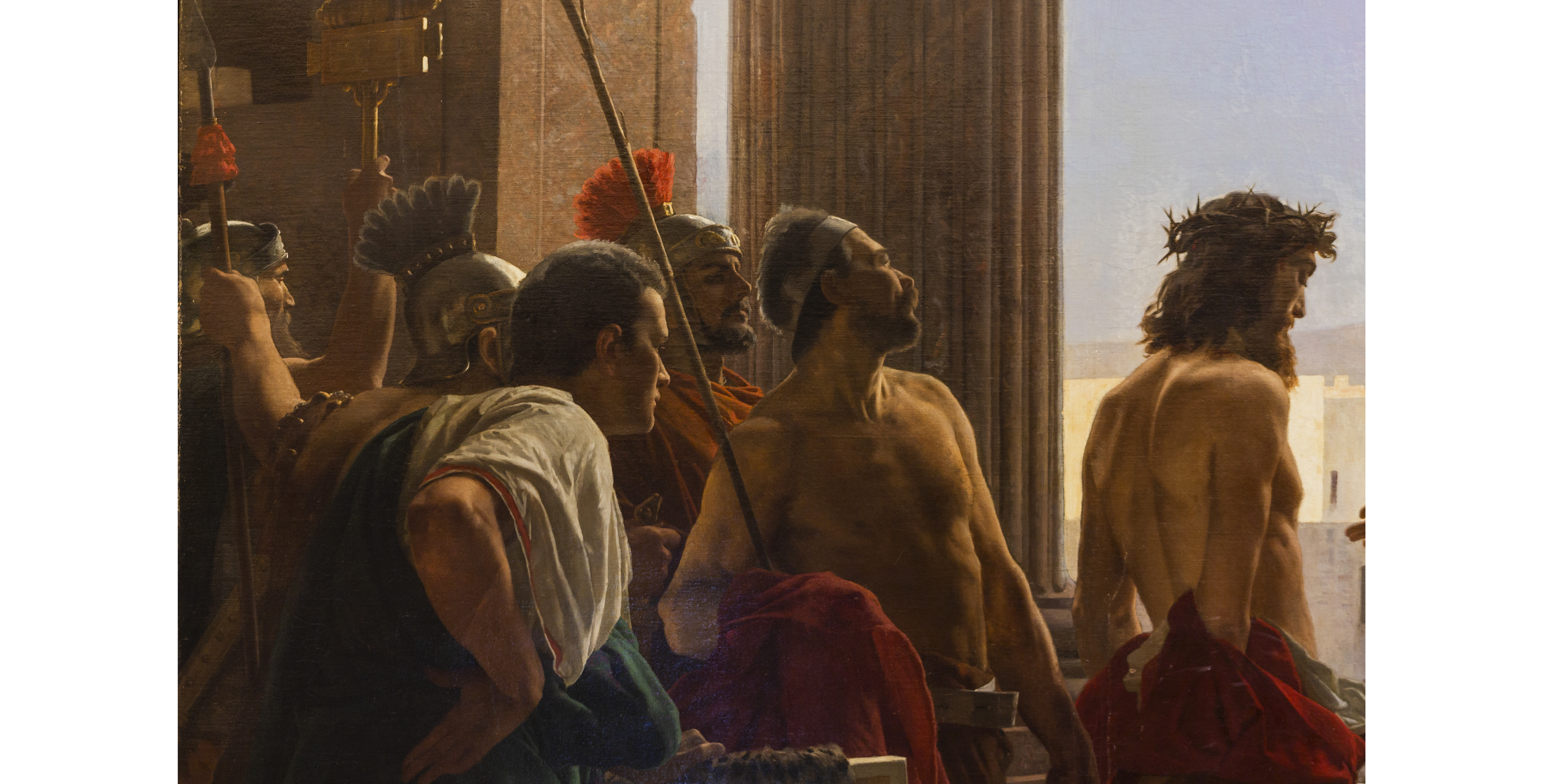 With a pronounced taste for antiquity and exoticism, Antonio Ciseri reconstructs the setting of this evangelical episode, combining mixed elements such as the Column of Antoninus Pius, of which the painter owned a photograph and which in the painting demonstrates the Roman domination of Judea in the time of Christ, as well as a monumental building which is exemplary of Egyptian architecture. These elements recall in a suggestive, but not philological, way urban spaces of a distant geographical and historical place. The scene has an unusual style with respect to traditional iconography: Christ is not presented facing forward, or towards those who will look at the painting so as to stimulate pious devotion and meditation on the sacrifice of the innocent, but is exposed from Pilate's balcony to the judgment of the crowd, capturing the event from "behind the scenes.” The episode specifically takes its inspiration from the Gospel according to Matthew but is more extensively treated in the Vie de Jésus by Ernest Renan (1863), a modern chronicle of the events of the life of Jesus which caused great protest because of the secularism of its setting, and that it was a source for Ciseri's lucid and passionate story.