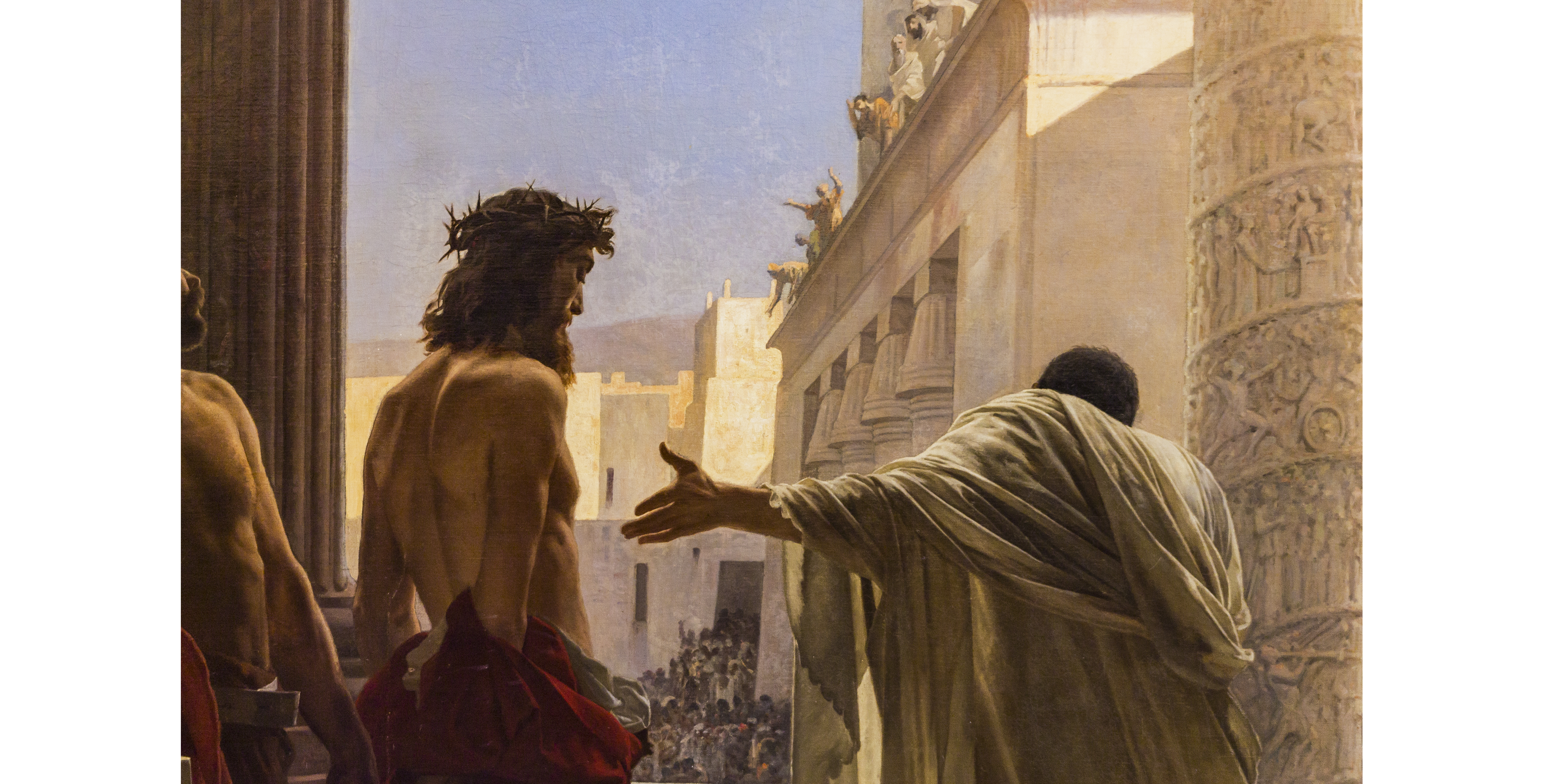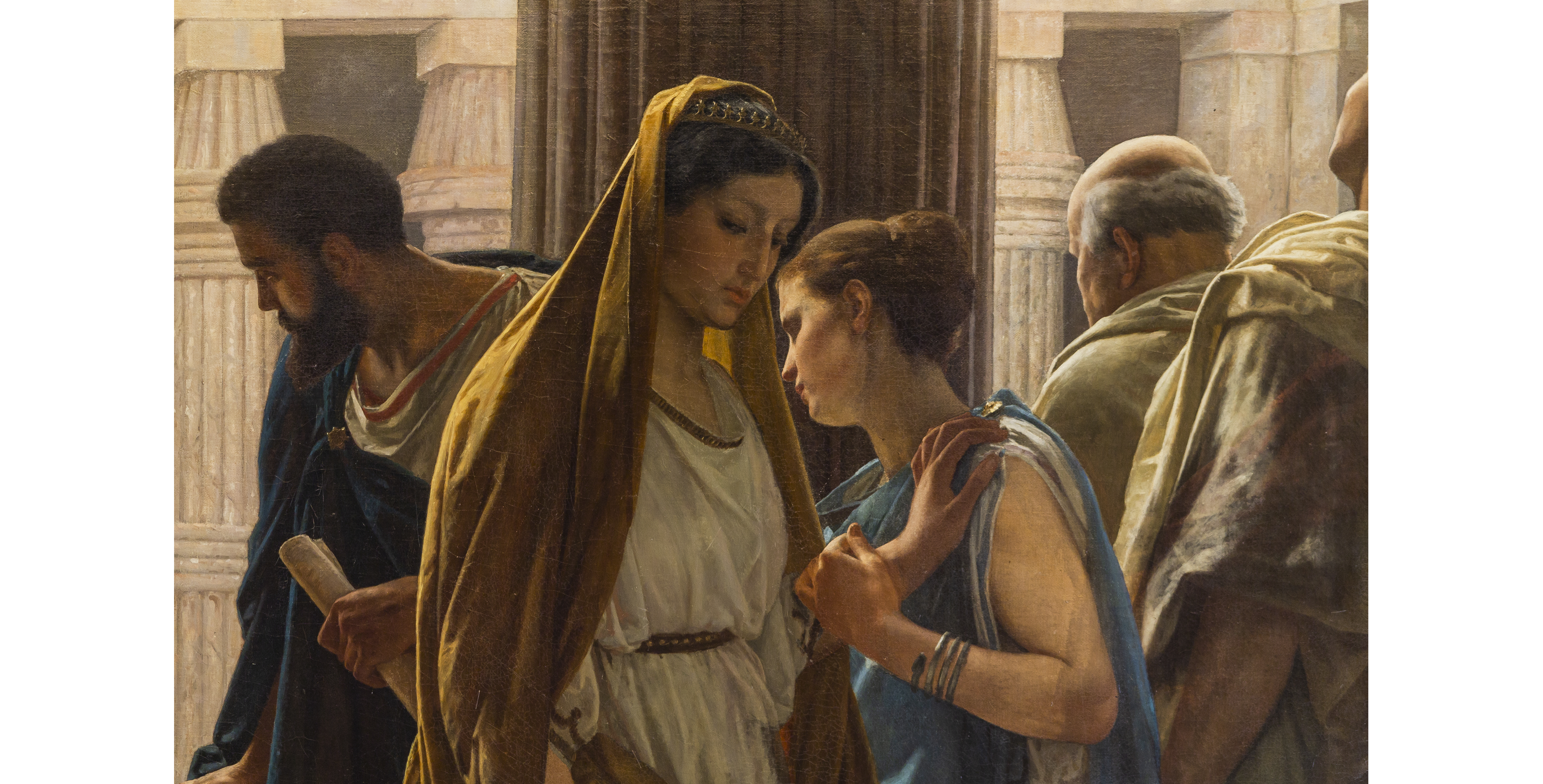 The condemnation of Jesus is narrated by choosing the point of view of Pilate's wife, Claudia Procula, the figure on the right who leans on the young maid. She had a dream which contained a premonition that the blood of the young man glimpsed in the courtyard of the palace would be unjustly spilled, and so she negotiated with her husband so that the innocent would be spared.