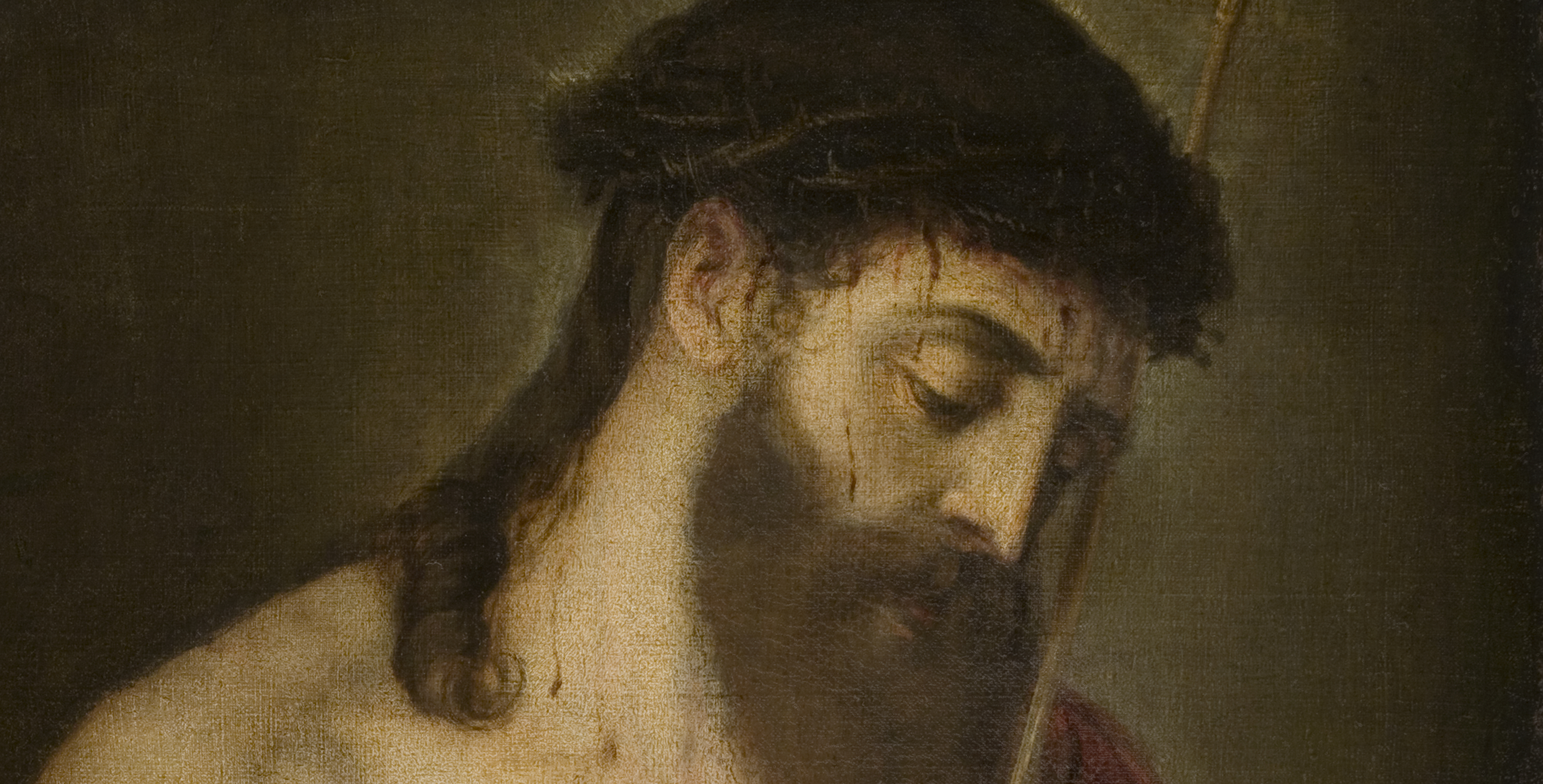 The title of this work (Ecce Homo, which in Latin means "here is the man") reclaims the words that, in the Gospel of John, are attributed to Pontius Pilate, Roman governor of Judea. He pronounced them while presenting Jesus - scourged and mocked by the soldiers - to the Jews gathered outside the Praetorian Palace. Following the orders of Pilate, the priests and guards invoked the crucifixion, the governor washed his hands to remove all responsibility and finally sent Jesus to his destiny. In this devotional image Christ is usually depicted half-length, with his wrists tied tightly by a rope and the "royal" attributes that Roman soldiers gave him as a form of mockery, ridiculing his claim to be "King of the Jews": the crown of thorns , the purple cloak, and, in some cases, a cane to represent a scepter.