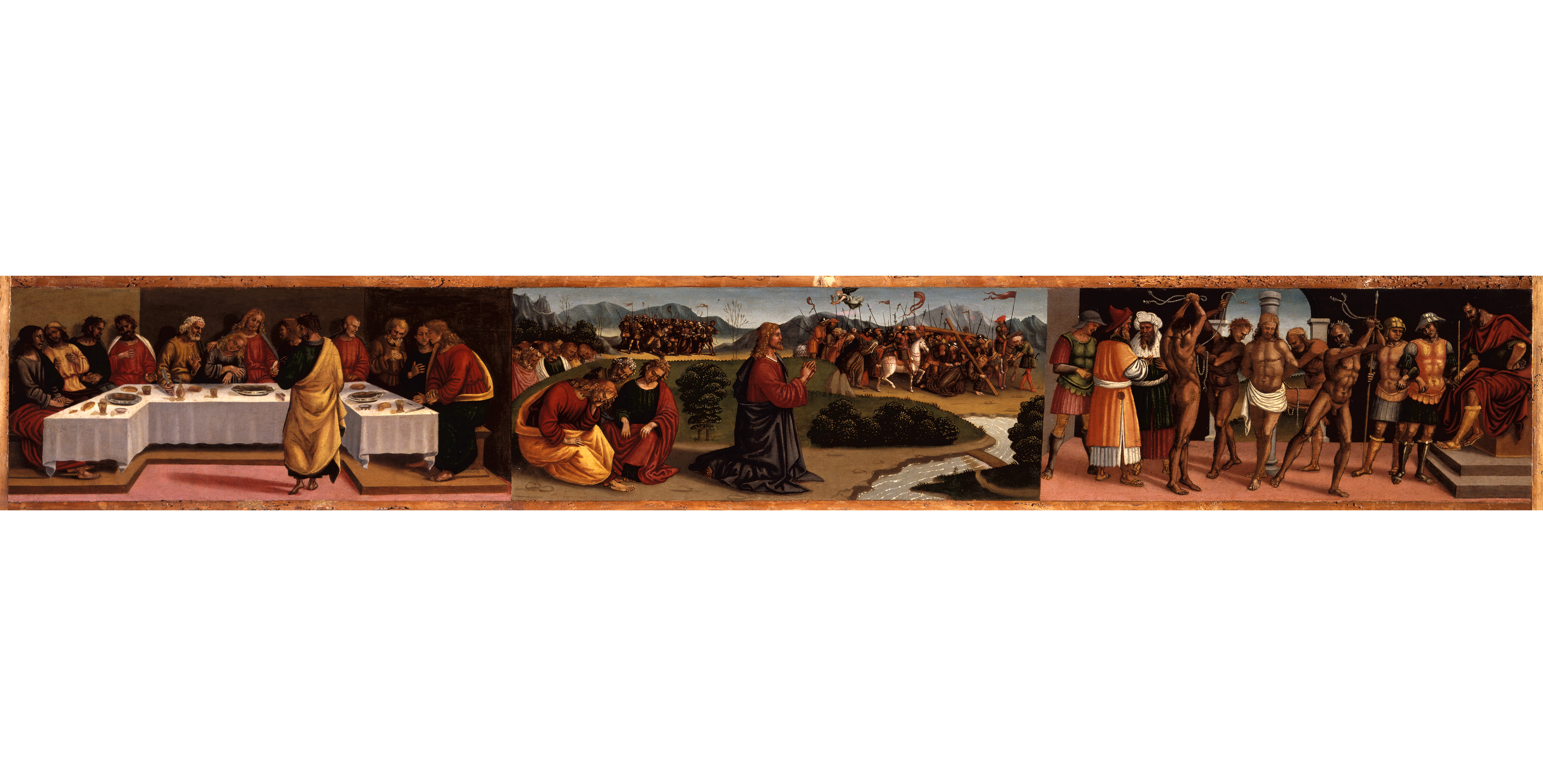 Predella with Stories of the Passion: The Last Supper, Prayer in the Garden and Capture of Christ, Ascent to Calvary, and the Flagellation