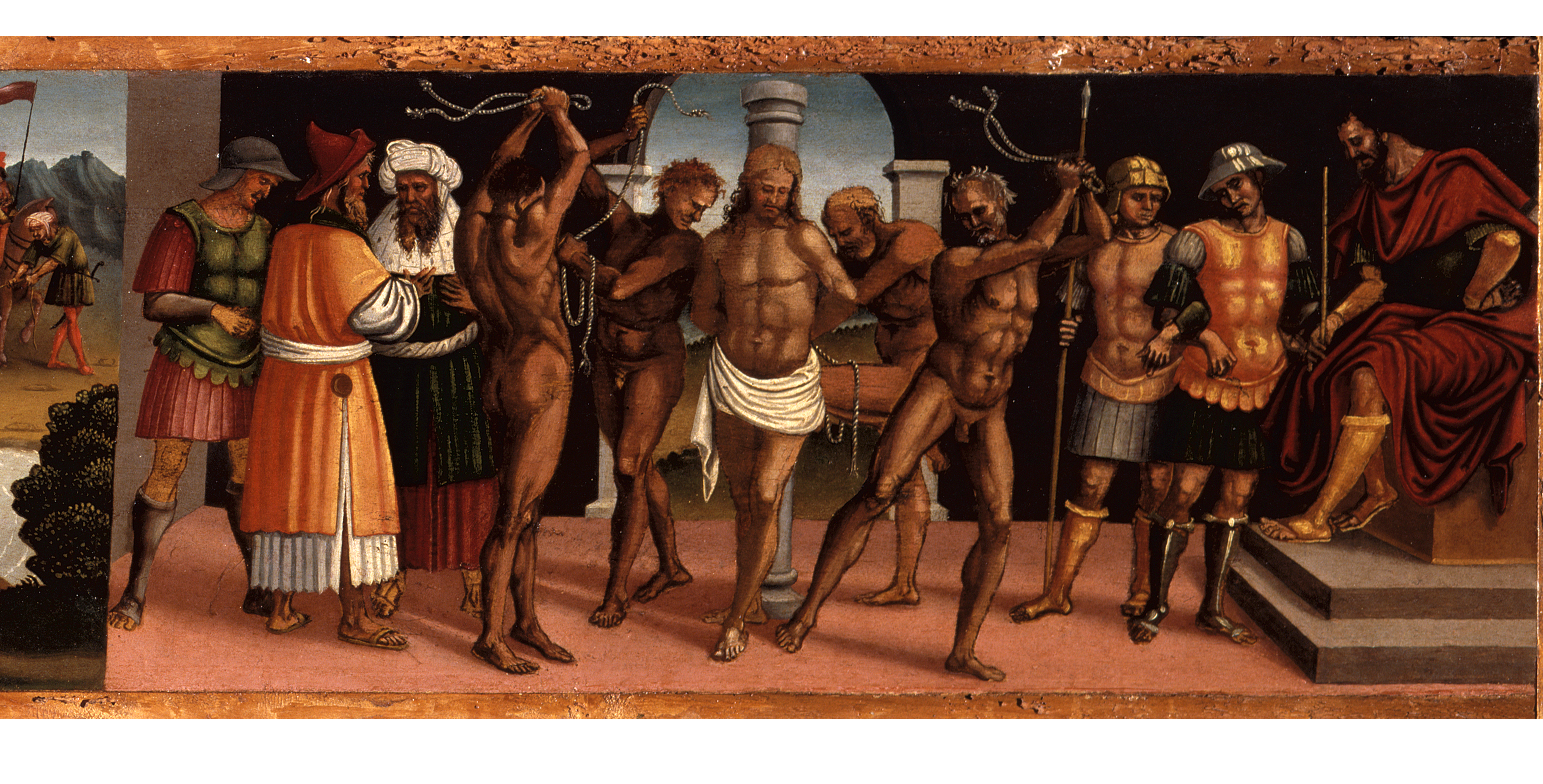 The scene takes place in an interior which is depicted in a very simple manner in order to give maximum emphasis to the figures. At the center, Jesus is tied to a column and flogged by four of Herod's henchmen, described in explicit anatomical detail. This characteristic reveals Signorelli's knowledge of Michelangelo's studies on the human figure. On the left we see two members of the Sanhedrin characterized by long robes, turbans, and sandals on their feet as they whisper with a soldier dressed in ancient armor. On the opposite side, Herod sits on a raised throne flanked by two guards.