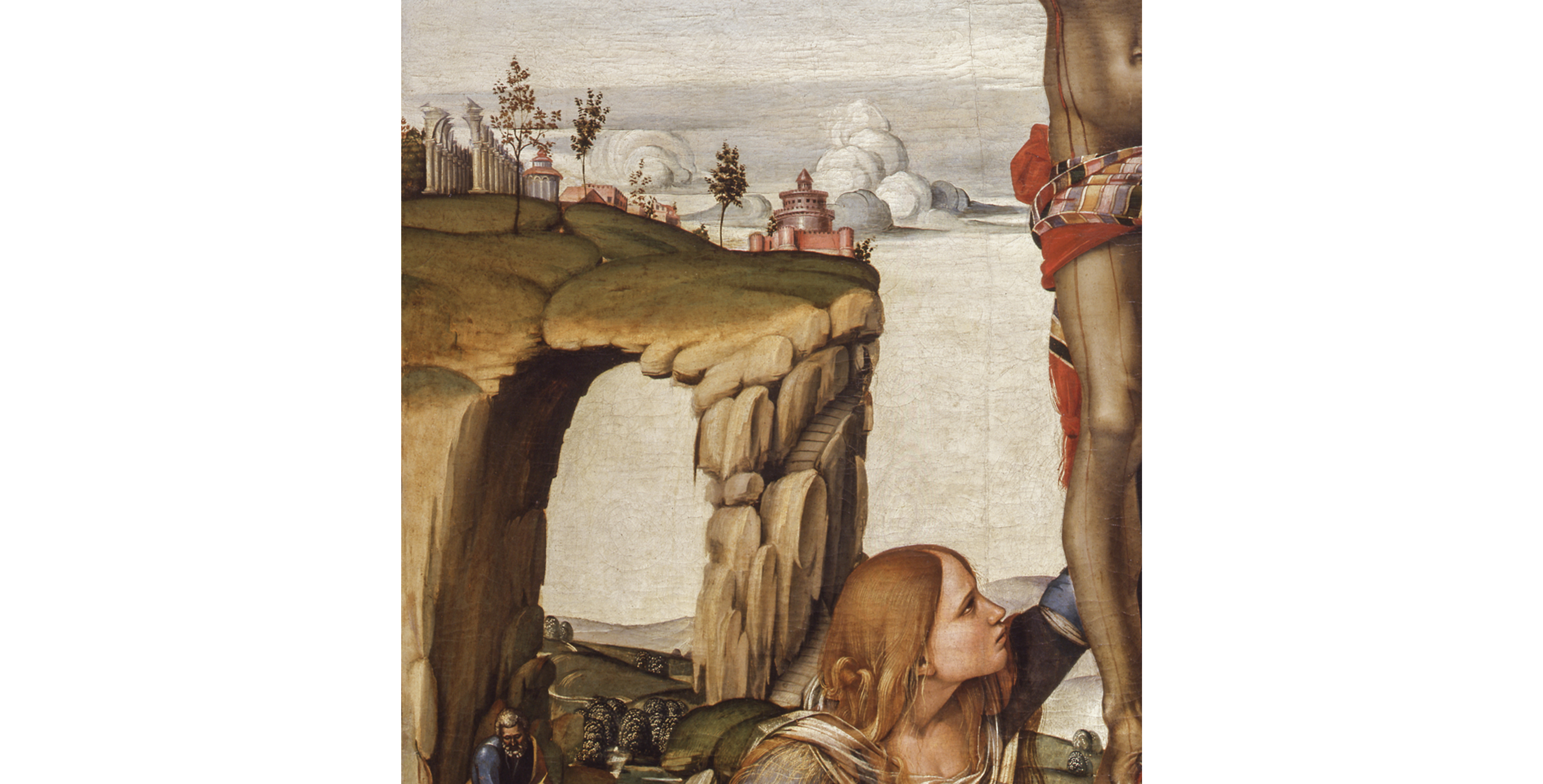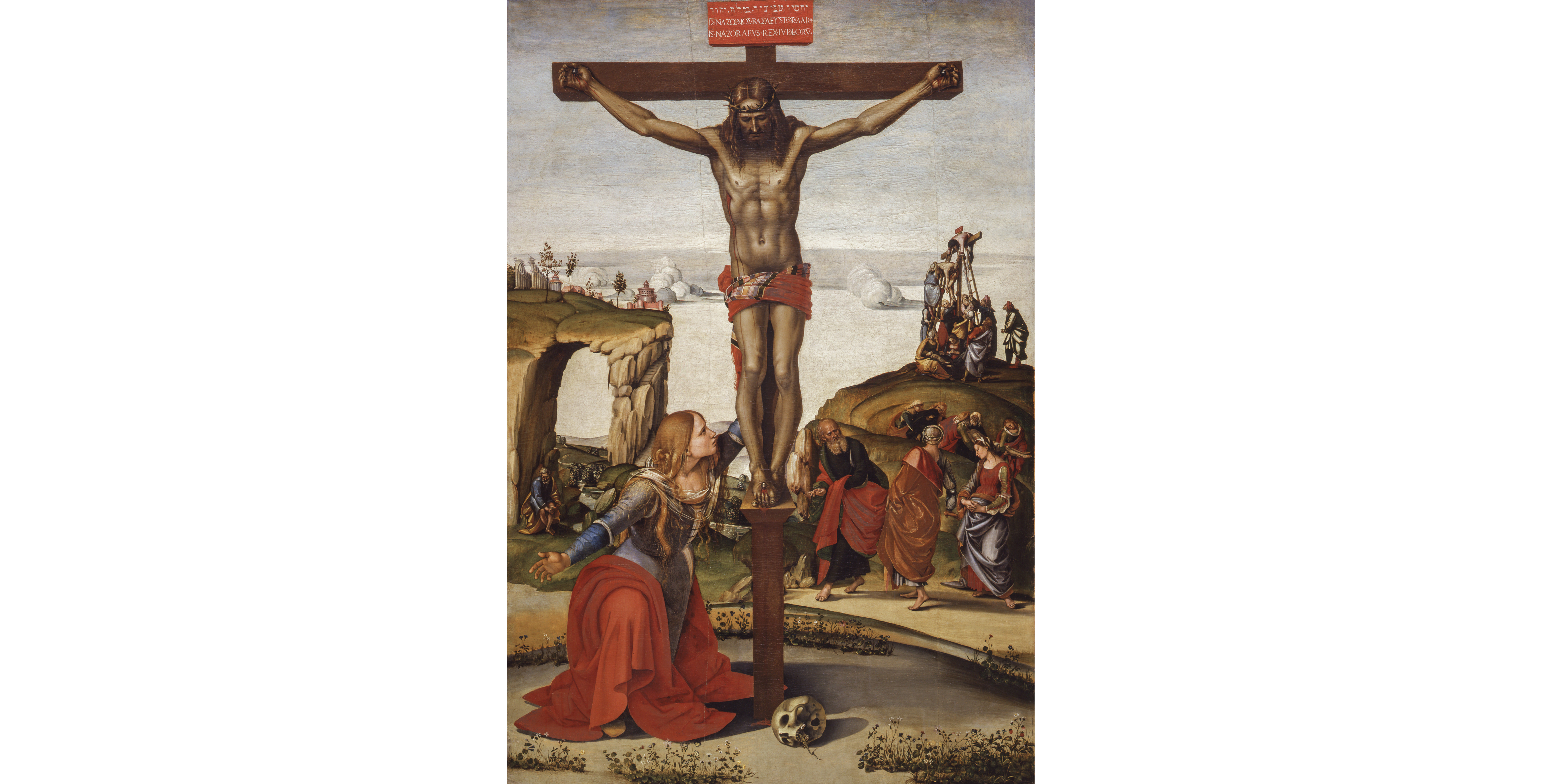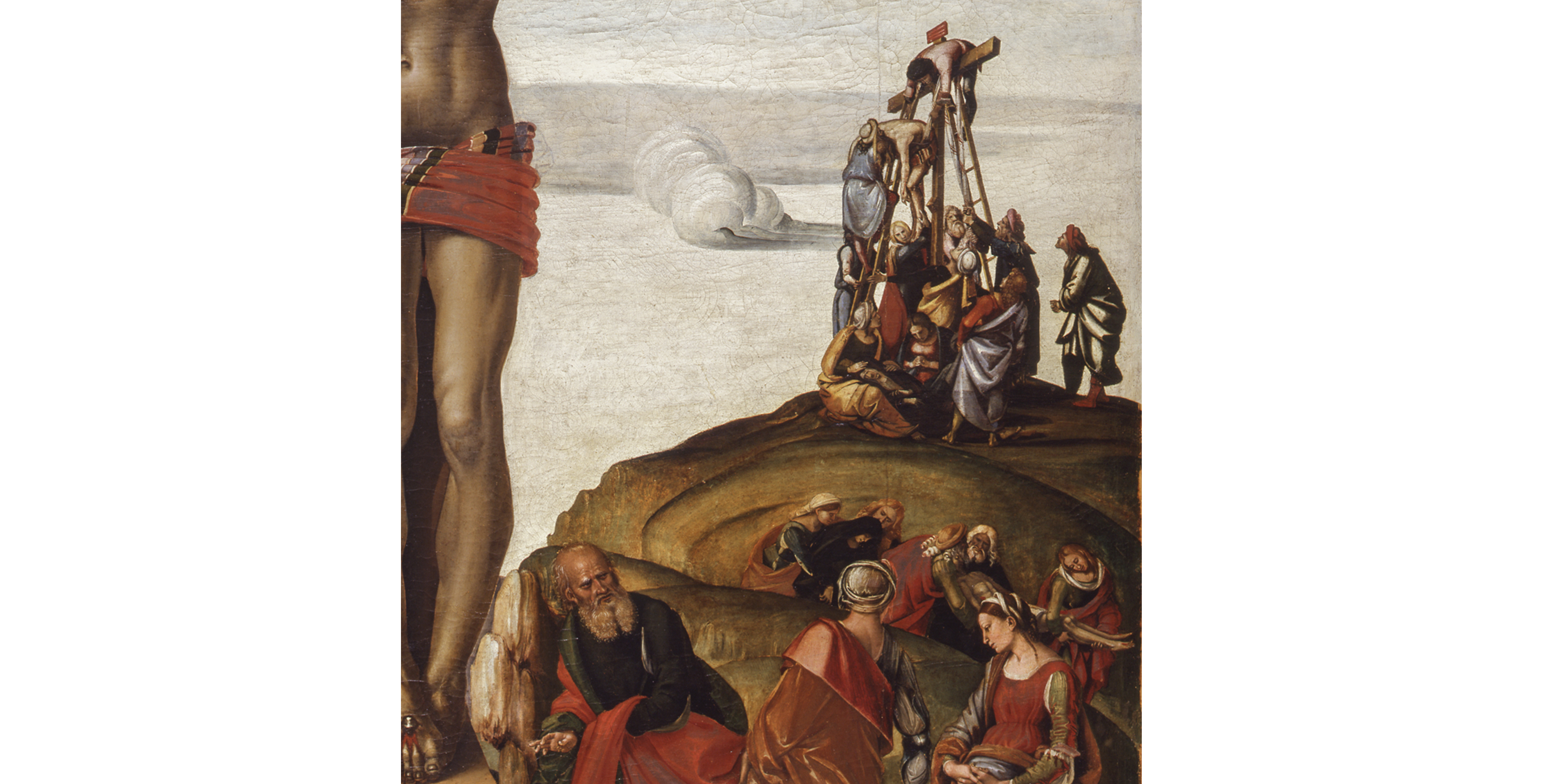 In this work, the centrality of the cross is immediately striking; it stands imposingly in the middle of a clearing of land bordered by strawberry seedlings and other meticulously depicted small flowers. On the molding there is a carving referring to Jesus, presented as King of the Jews in three different languages: Hebrew, ancient Greek, and Latin.With his head resting on his chest and his thick blond hair framing his handsome face, Christ is still firmly nailed to the cross.Signorelli, in fact, with his usual skill in the muscular rendering of figures, shows us a body with already stiffened limbs, which is slowly acquiring the typical color of death. Only the striking red color of the blood coming out of the various wounds (especially the one on Christ’s side) and of the loincloth, embellished with streaks of other colors, stands out.