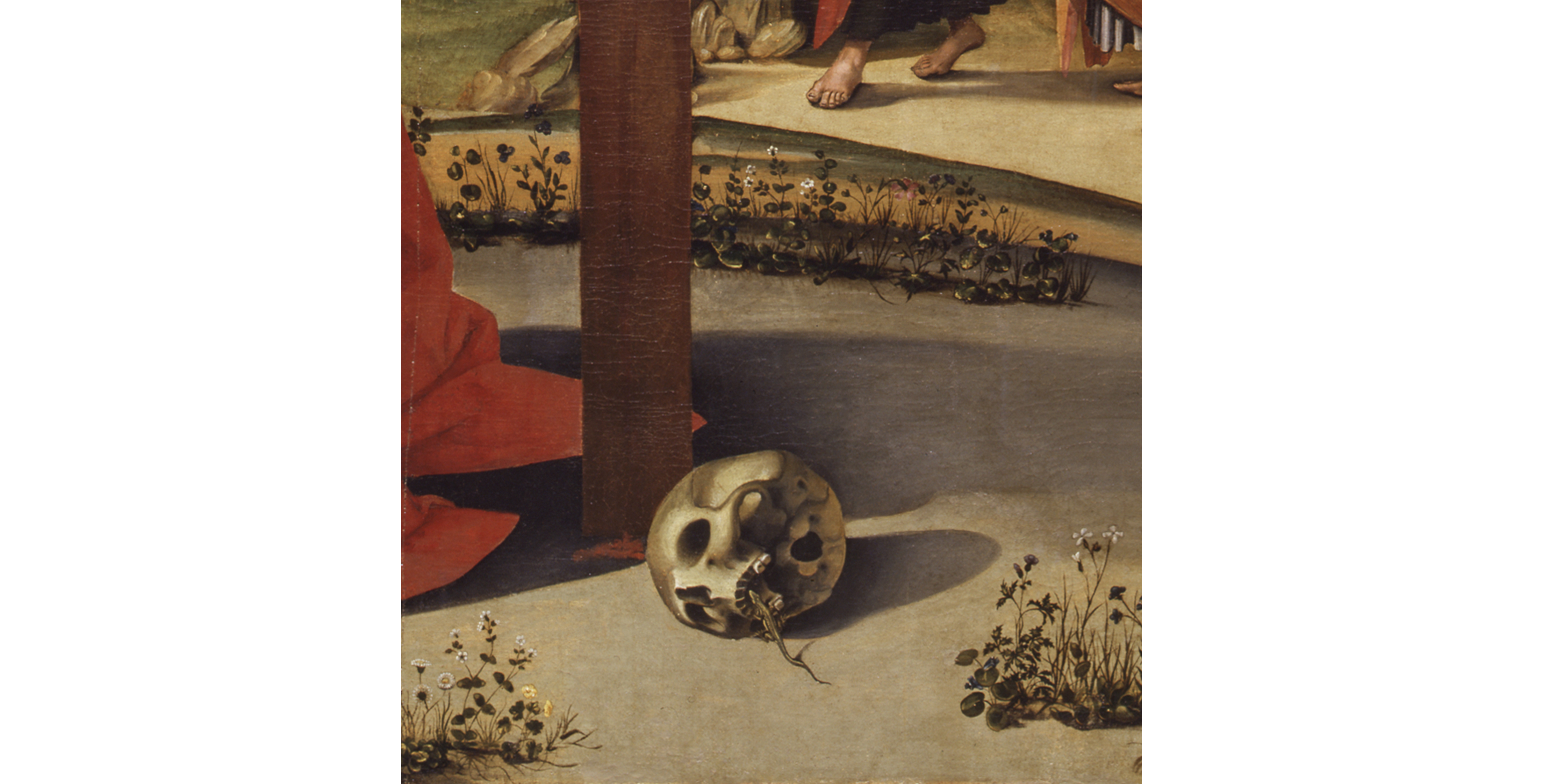 At the foot of Signorelli’s cross, there is a skull on which a lizard rests its paws: this alludes to the aramaic significance of Golgota ( 'gūlgūtā' means skull ), the name given to the place of the Crucifixion, which took place on the mountain where Adam was believed to be buried. In Christian symbolism, the ancestor's skull is directly placed at the sacrifice of Christ, since he, dying on the cross, has redeemed all humanity stained by original sin. On the other hand, the lizard is a symbol which represents the Resurrection, as its tail, even if broken, can grow back.