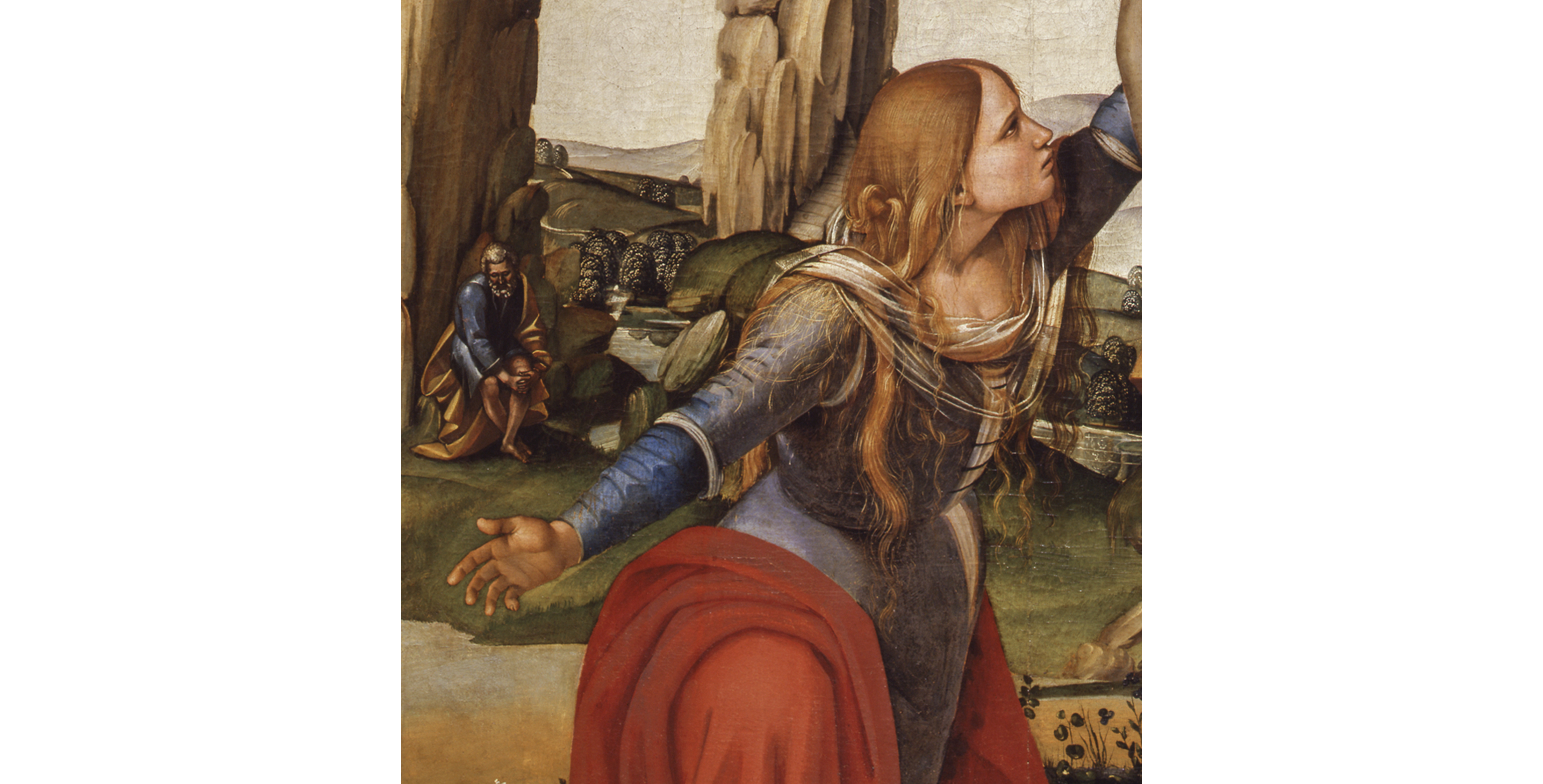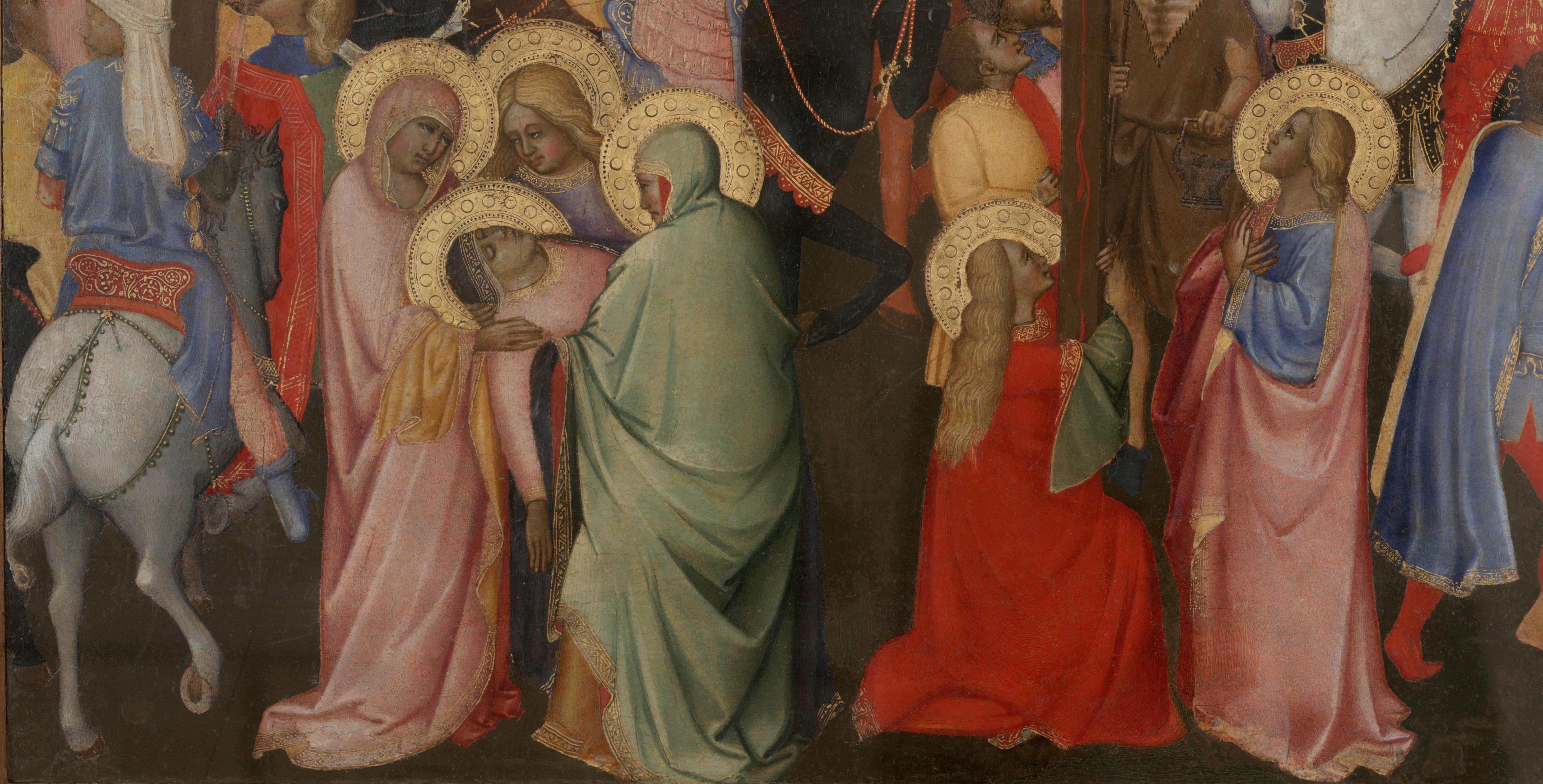 In the background to the right, the Ascent to Calvary is visible: Jesus, carrying the cross on his back, falls under the weight of it. Behind him, amongst the procession of soldiers and knights, the Pious Women stand out in particular. The Virgin, who, determined to follow her son closely, almost risks falling. Above the crowd appears an angel in flight, holding a goblet in his hands, a representation of the Gospel passage: “Father, if you are willing, take this cup from me; yet not my will, but yours be done.” An angel from heaven appeared to him and strengthened him” (Luke 22:42-43).
