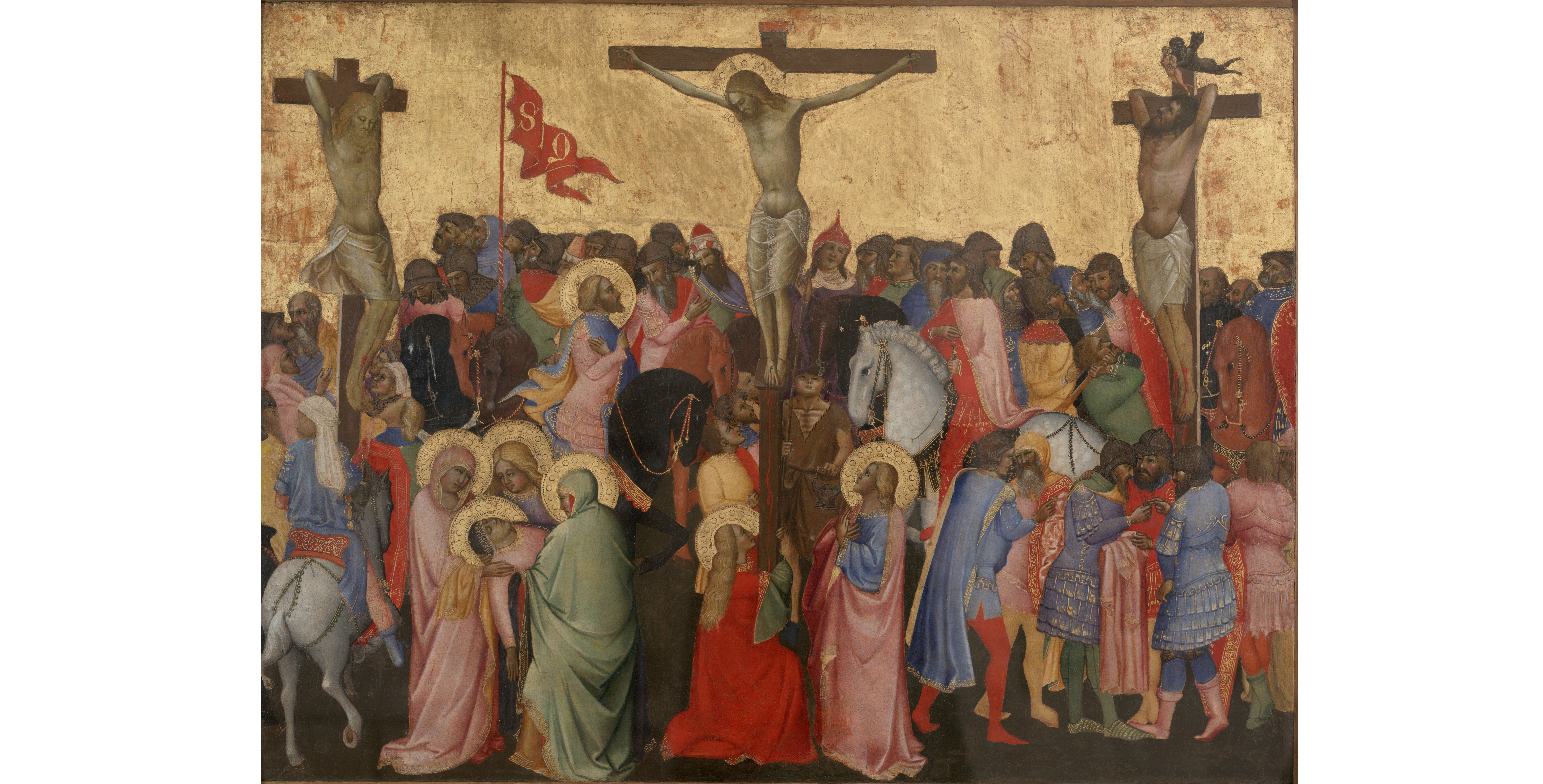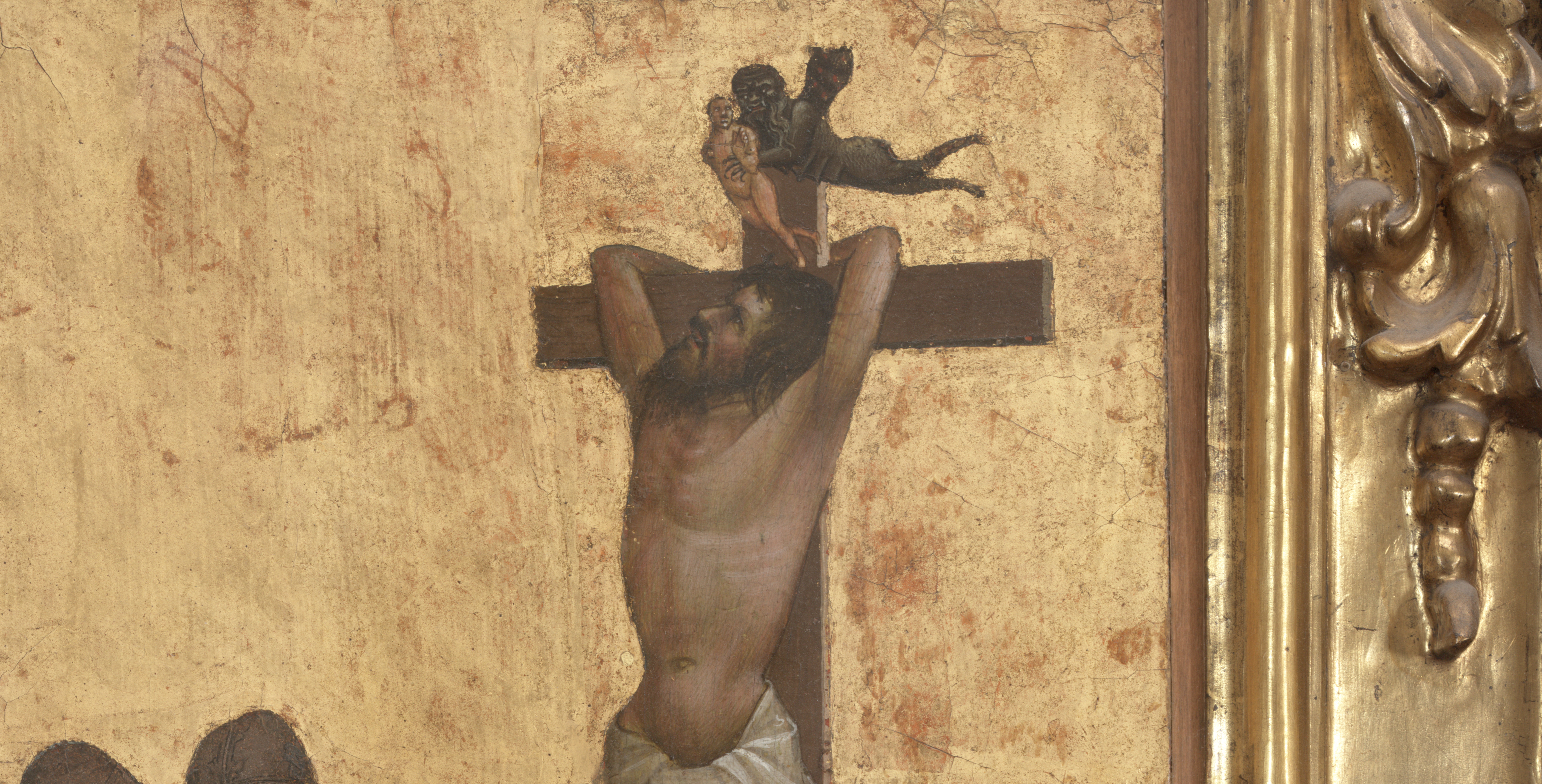 The total absence of architectural elements, with the bare and bloody cross dominating the upper part of the panel, as well as studied compositional devices such as the woman seen from behind in the foreground, accentuate the tragic intensity and force the observer to focus on the drama and empathize with the characters.