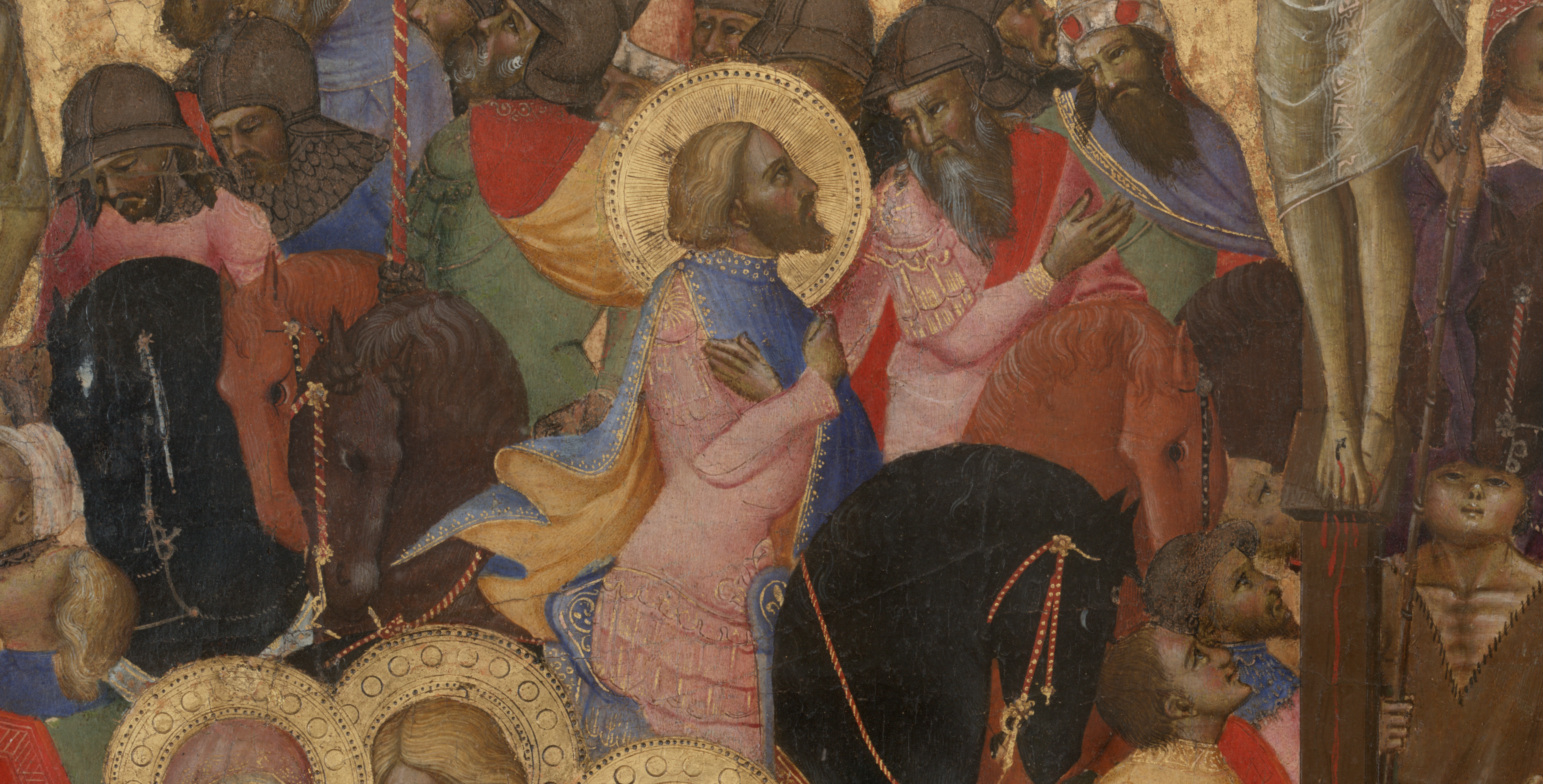 Compared to the brutal appearance of the thief, committed to mocking Christ, Agnolo instead adopts a refined and elegant style for the figure of the Roman centurion, of whom he recognizes the divine nature. The refined lines of the face and the colors of the cloak just moved by the wind show a different trait of the artist's style, allowing the interpretation of late-Gothic stylistic innovations in a lyrical sense.
