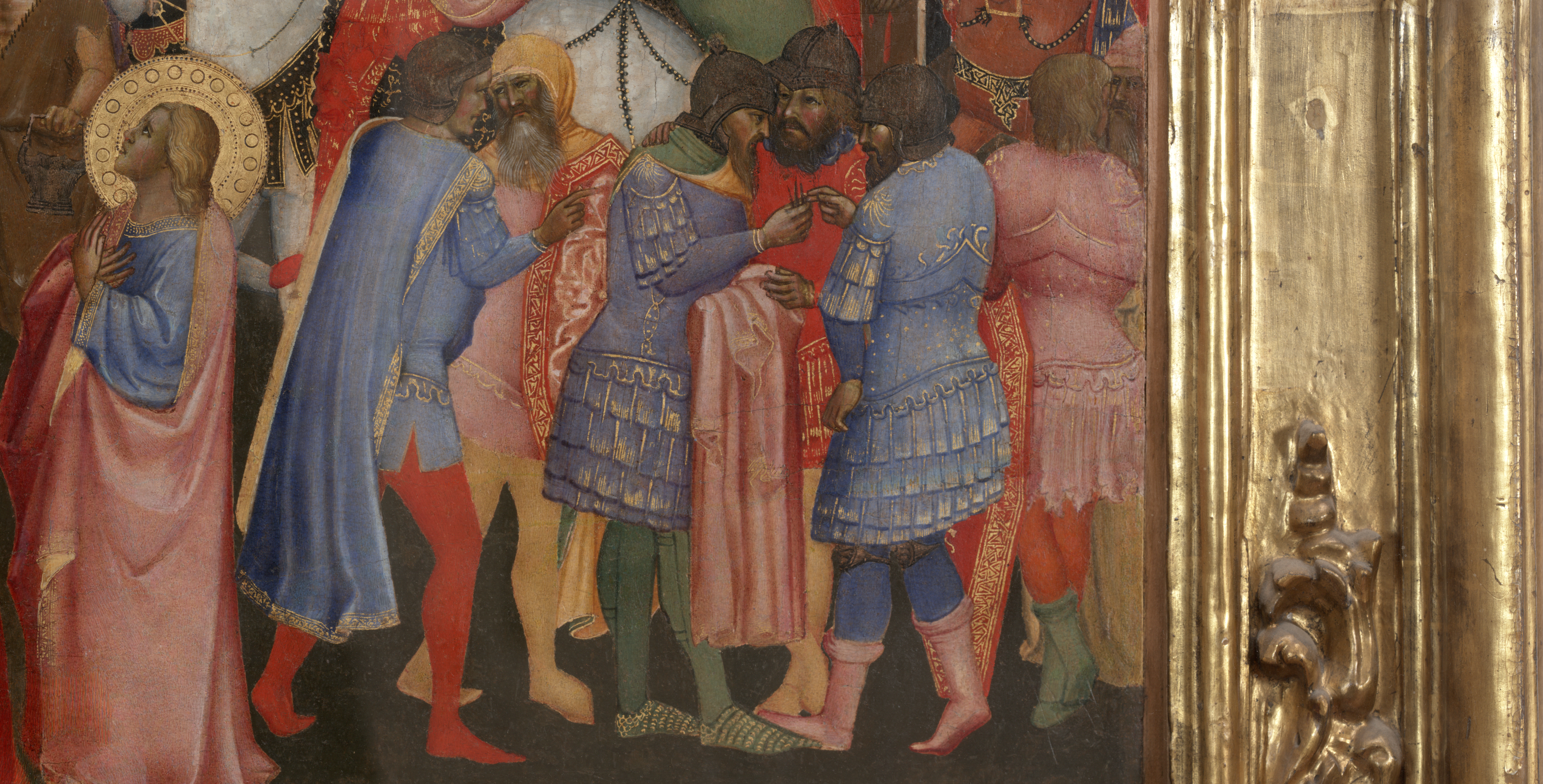The soldiers are depicted in the act of drawing lots for which one of them would obtain the tunic. The artist focuses on the precious details of the garments, defined by brilliant colors and golden finishes.