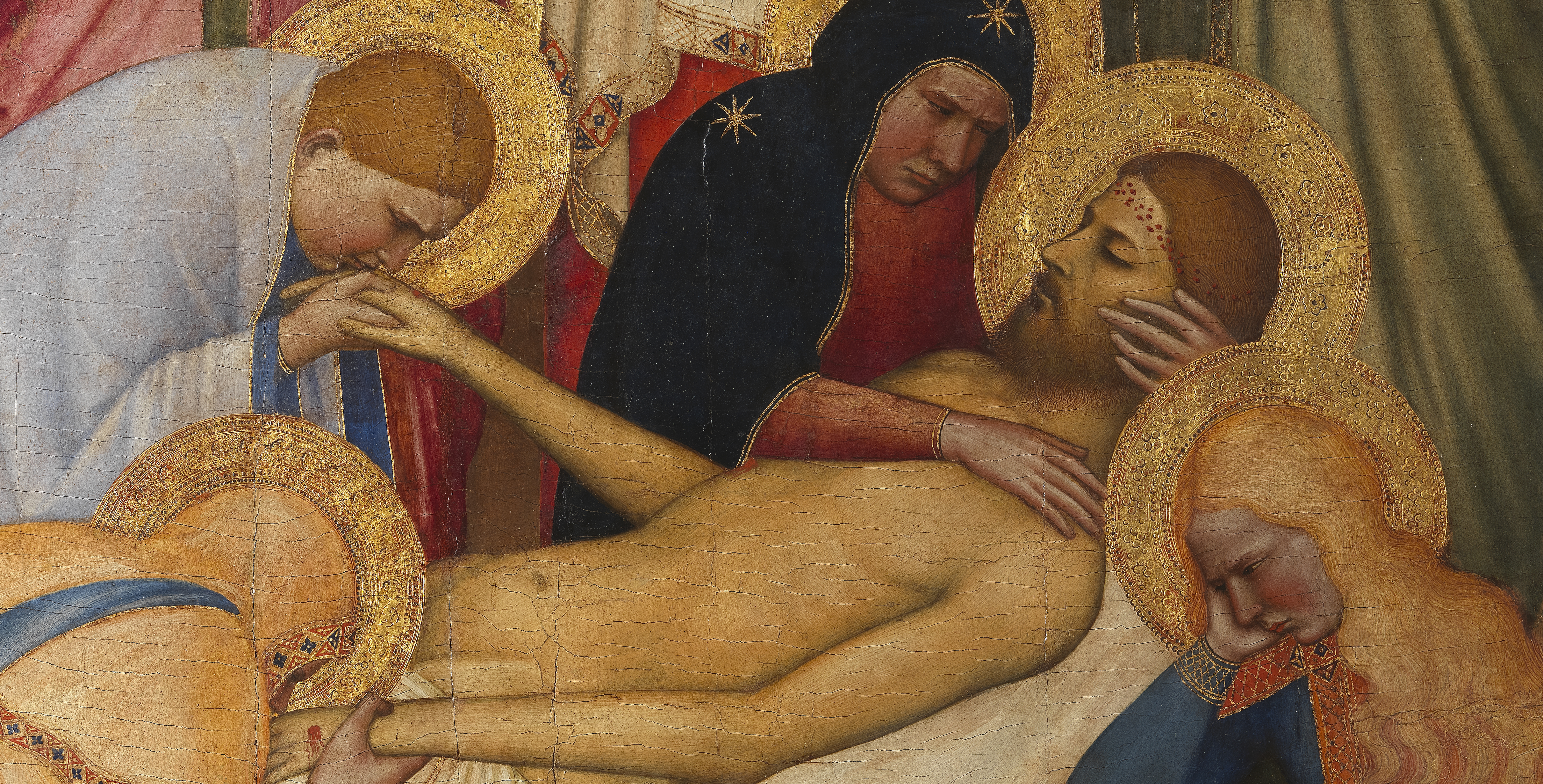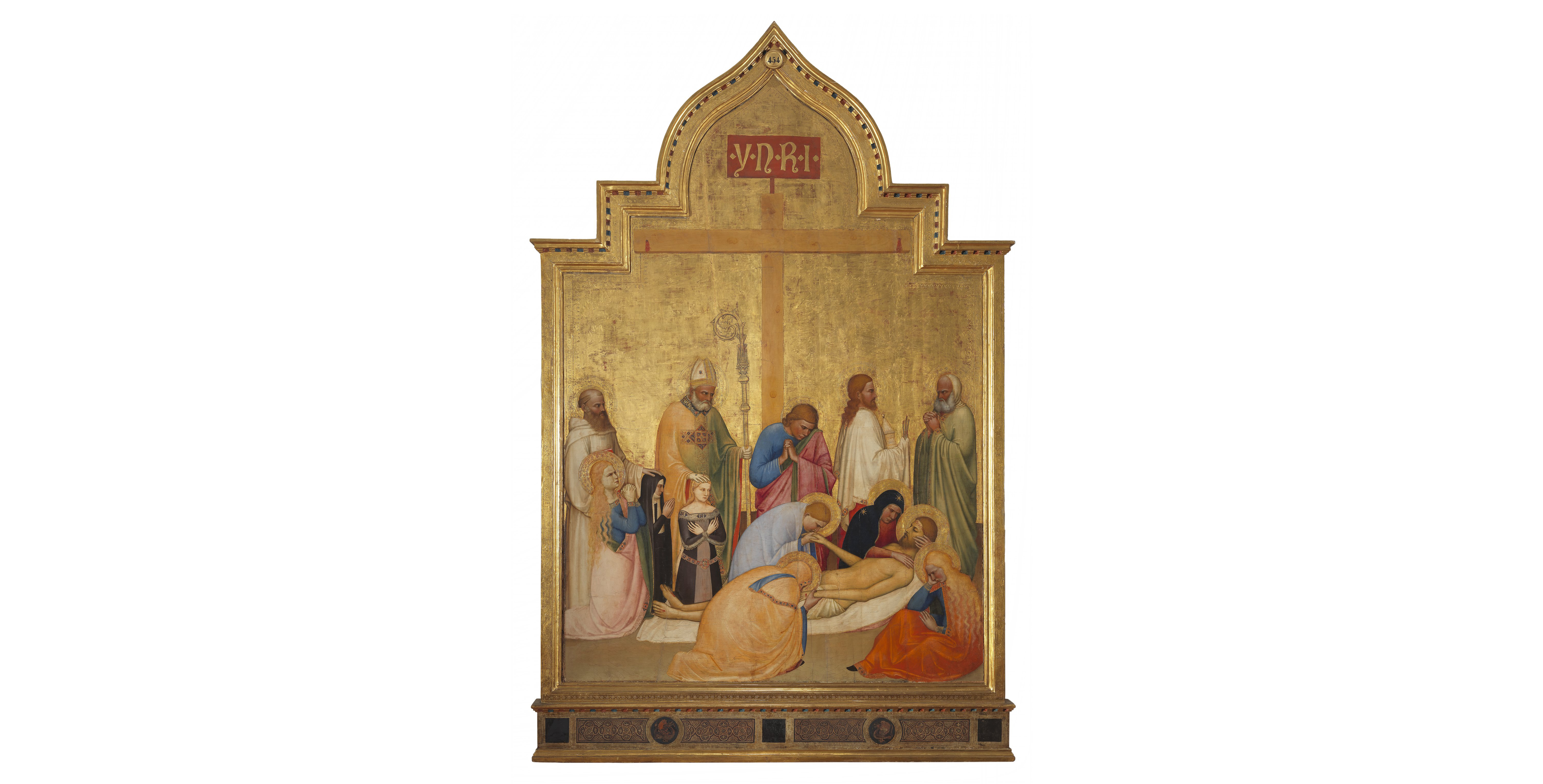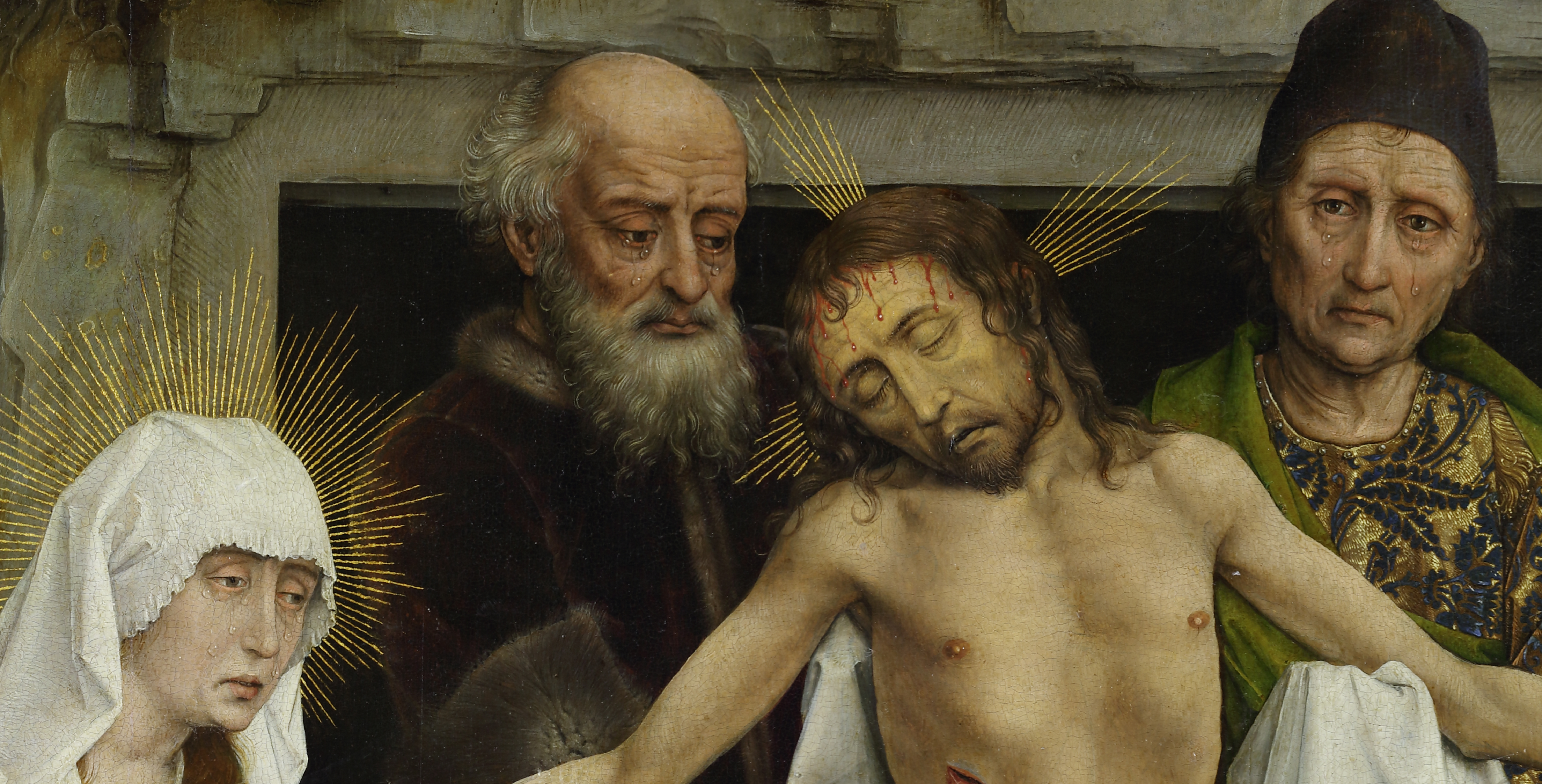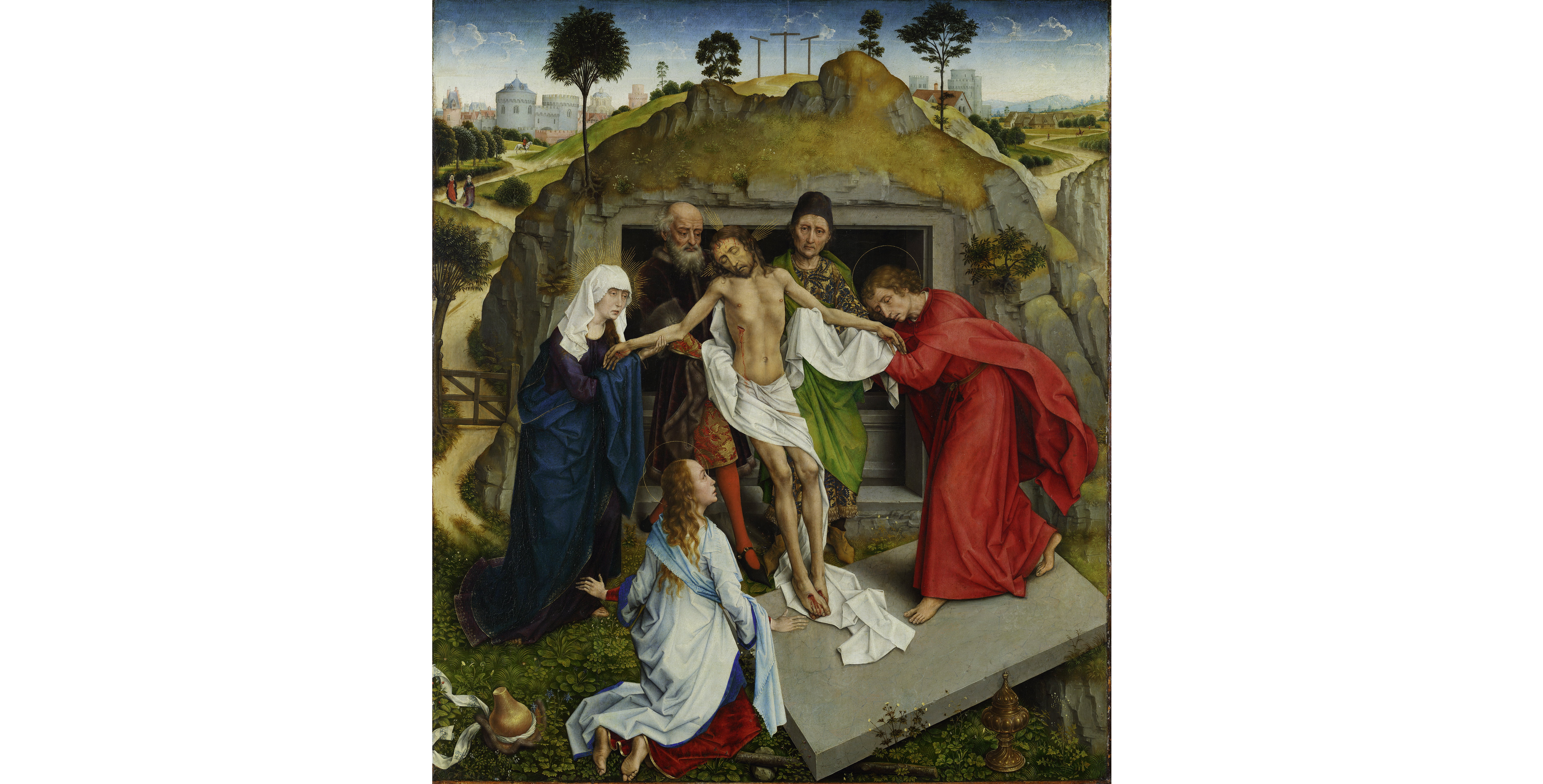 On the occasion of the Jubilee of 1450, Flemish painter Rogier van der Weyden embarked on a journey to Italy that led him close to the main courts of the Renaissance: firstly Rome, and then Naples, Mantua, Milan, Ferrara, and Florence. In the Tuscan city, he had significant contacts with Beato Angelico, which are explicitly reflected in this picture. In fact, it recounts (and reinterprets through the filter of the very particular Nordic artistic vision) the depiction of the Pietà painted by Angelico for the platform of the Pala di San Marco (1438-1443) and today at the Alte Pinakothek in Munich. From this work comes the idea of the centrality of the tomb carved in rock, in front of which the body of Christ, depicted in all its expressive thinness, is sadly presented to the faithful. Giuseppe d'Arimatea (on the left) and Nicodemus (on the right) support him from behind, also holding the edges of the shroud, while on the sides the Virgin Mary and Saint John the Evangelist support him by his thread-like arms, causing him to take a slightly diagonal position. Jesus' body barely rests his skeletal feet on the stone of the tomb thrown to the ground and almost seems to slide towards the Magdalene kneeling in front of him with his arms wide open in a gesture of desperation. The whole composition is constructed with a raised point of view, in order to fully engage the viewer, who feels almost "sucked" into the scene. To accentuate this sense of actualization of the sacred event, attention is paid to the typical detail of Flemish painting, which focuses on making the faces, hair, and clothes as realistic as possible (those in fur and brocade, Joseph of Arimathea and Nicodemus, are very valuable), as well as the chromatic and luminous effects.