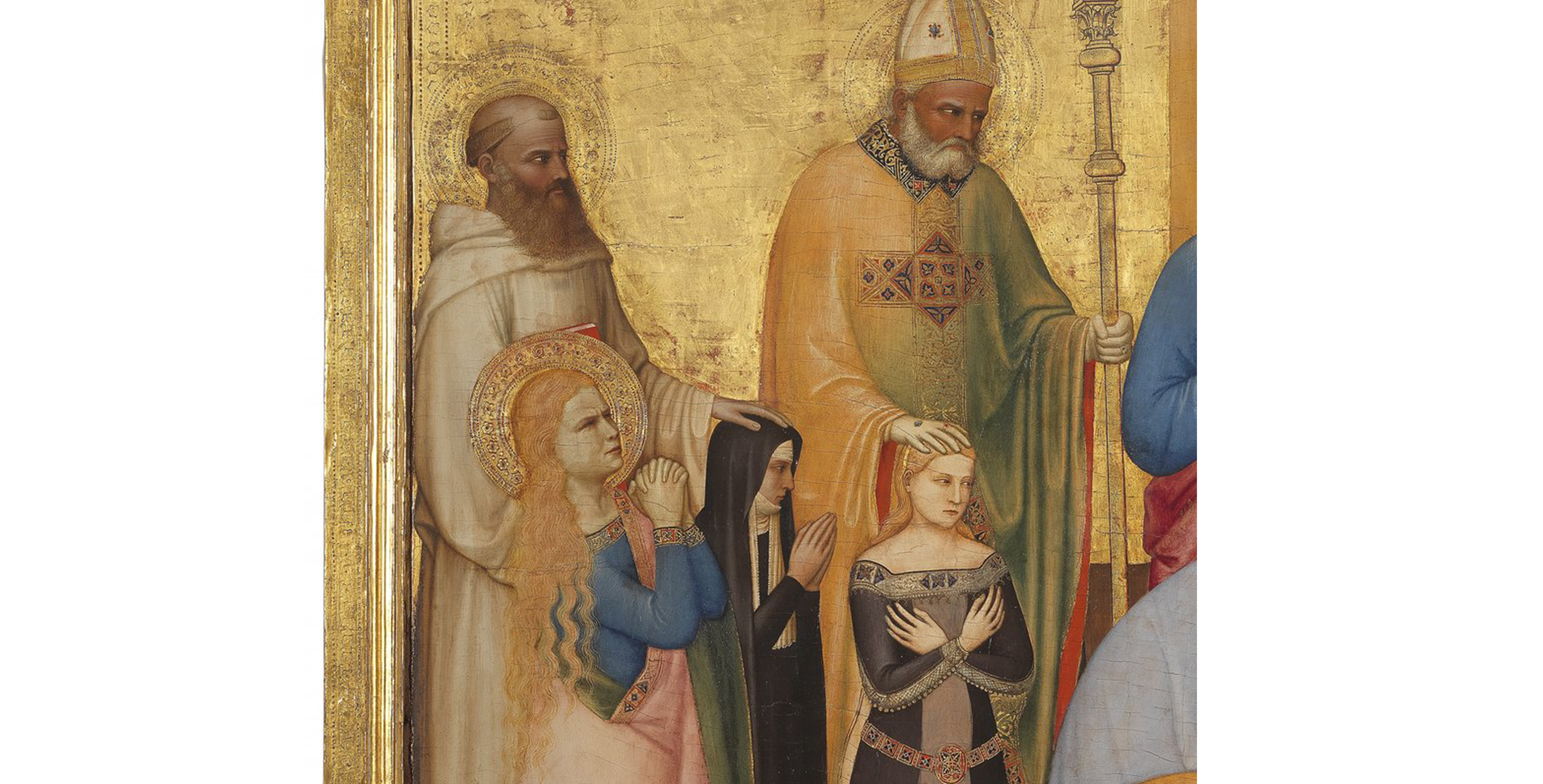 The work was commissioned for the Church of San Remigio in Florence: on the left we see two clients, a Benedictine nun and an elegantly dressed girl with her hands crossed over her chest. In the background, San Benedetto and Bishop Remigio, with a gesture of blessing and paternal protection, lay their hands on their heads.