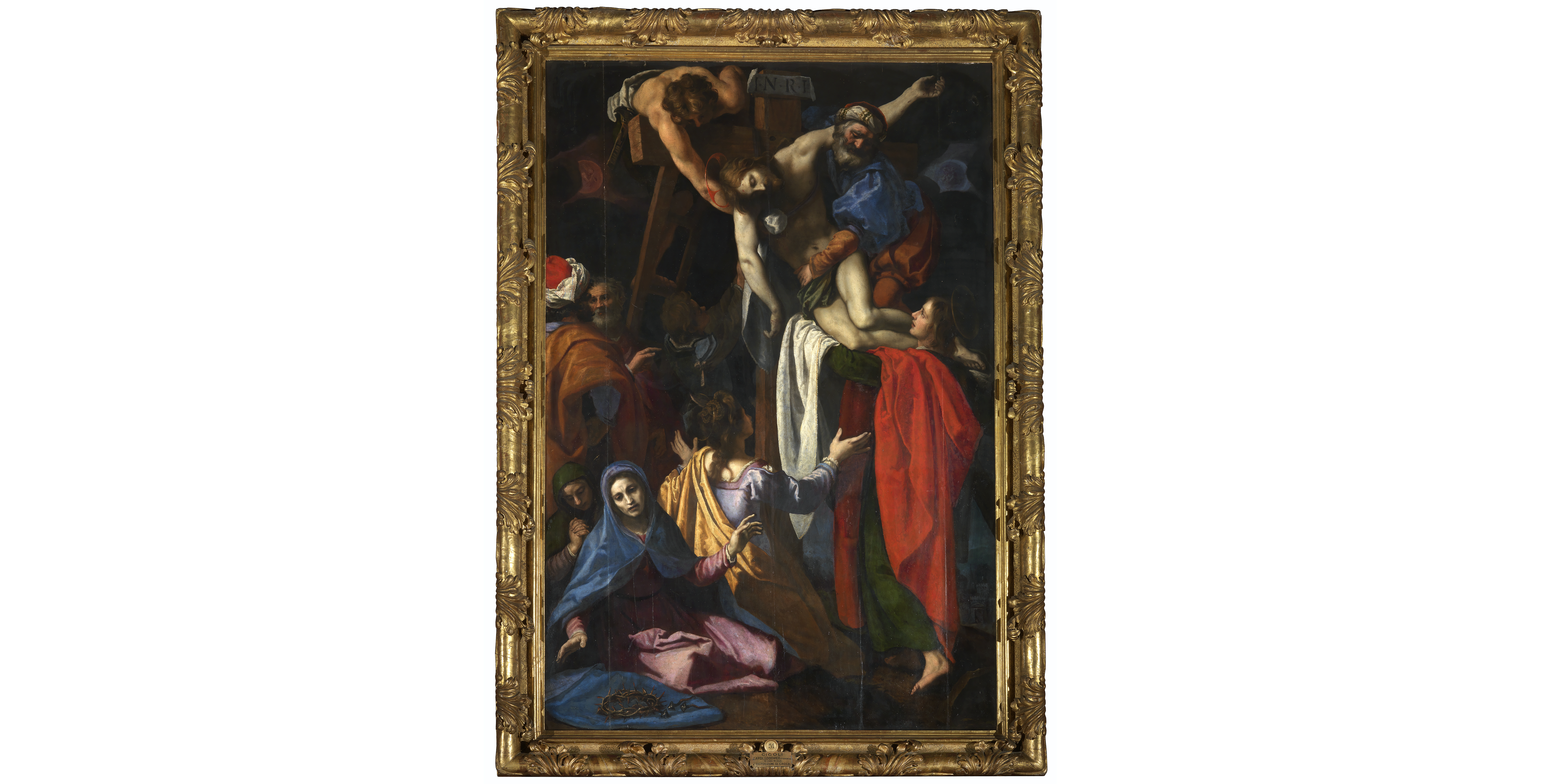 The scene is divided almost in half by a diagonal, which, starting at the top left, descends following the profile of the young man's arm who, climbing up the ladder, helps Giuseppe d'Arimatea to lay Jesus on the white sheet held by St. John the Evangelist. This line, also identified by the side and the heavily abandoned legs of the body of Christ, as well as from the arm and shoulder of St. John, separates this group of figures from that of the women (the Virgin Mary, Mary of Cleophas and Mary Magdalene). The women, seen on the left at the foot of the cross, express their pain in a content and introspective way. Behind them emerge three other male figures, among which Nicodemus is present, the Pharisee secretly converted to the teachings of Jesus, who brought an amphora of myrrh and aloes with which to anoint the body of the Savior before placing it in the tomb.