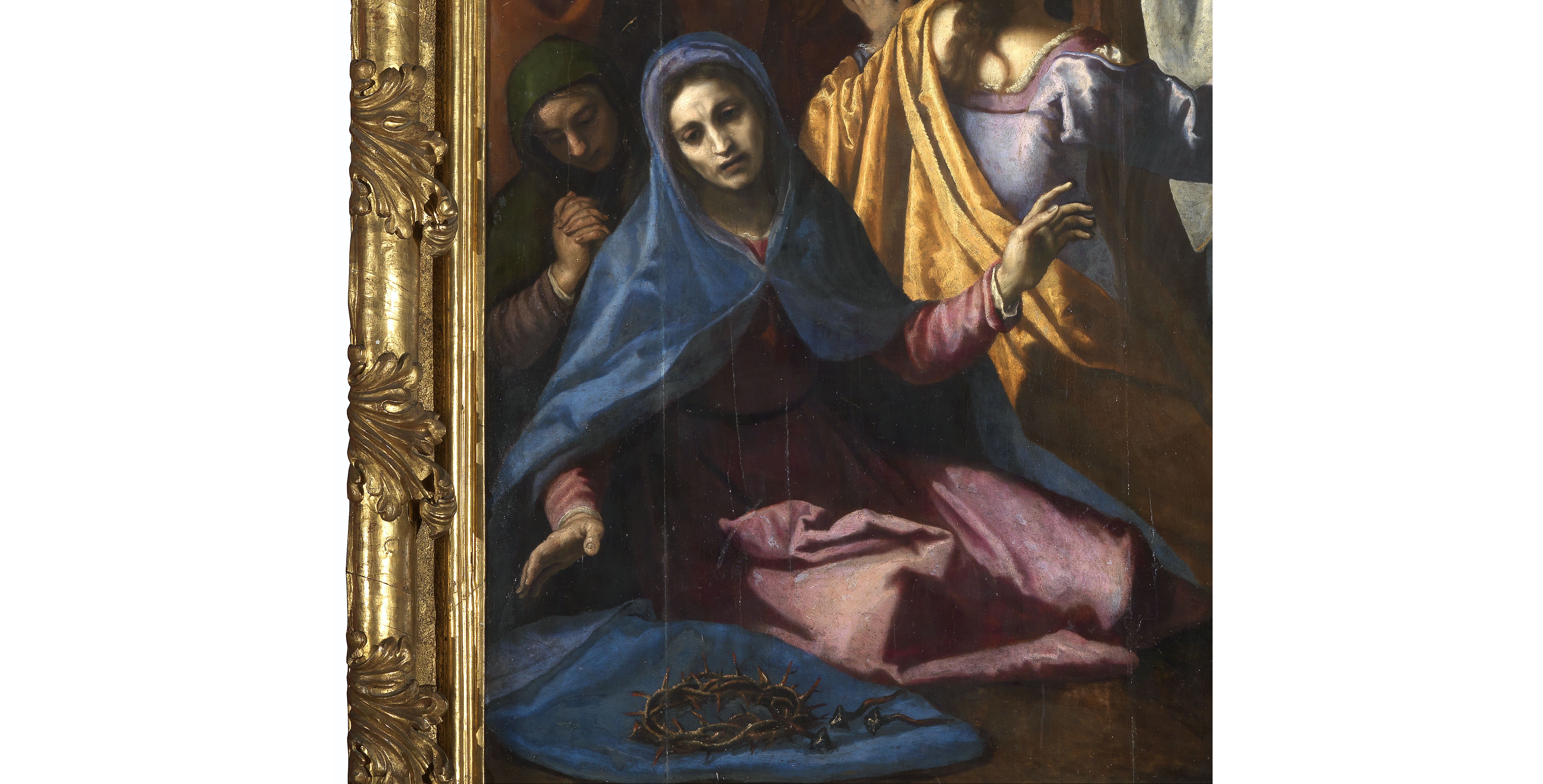 To give even more expressive and theatrical incisiveness to this dramatic moment, Cigoli inserts some brilliant “spots of color” that animate the surface of the picture, breaking here and there the various chiaroscuro passages. This is the case, for example, of the shining blue of the sleeve of the doublet of Giuseppe d'Arimatea, of the bright red of the cloak of San Giovanni Evangelista, as well as the pale blue and of the orange-yellow of the Magdalene's garments.