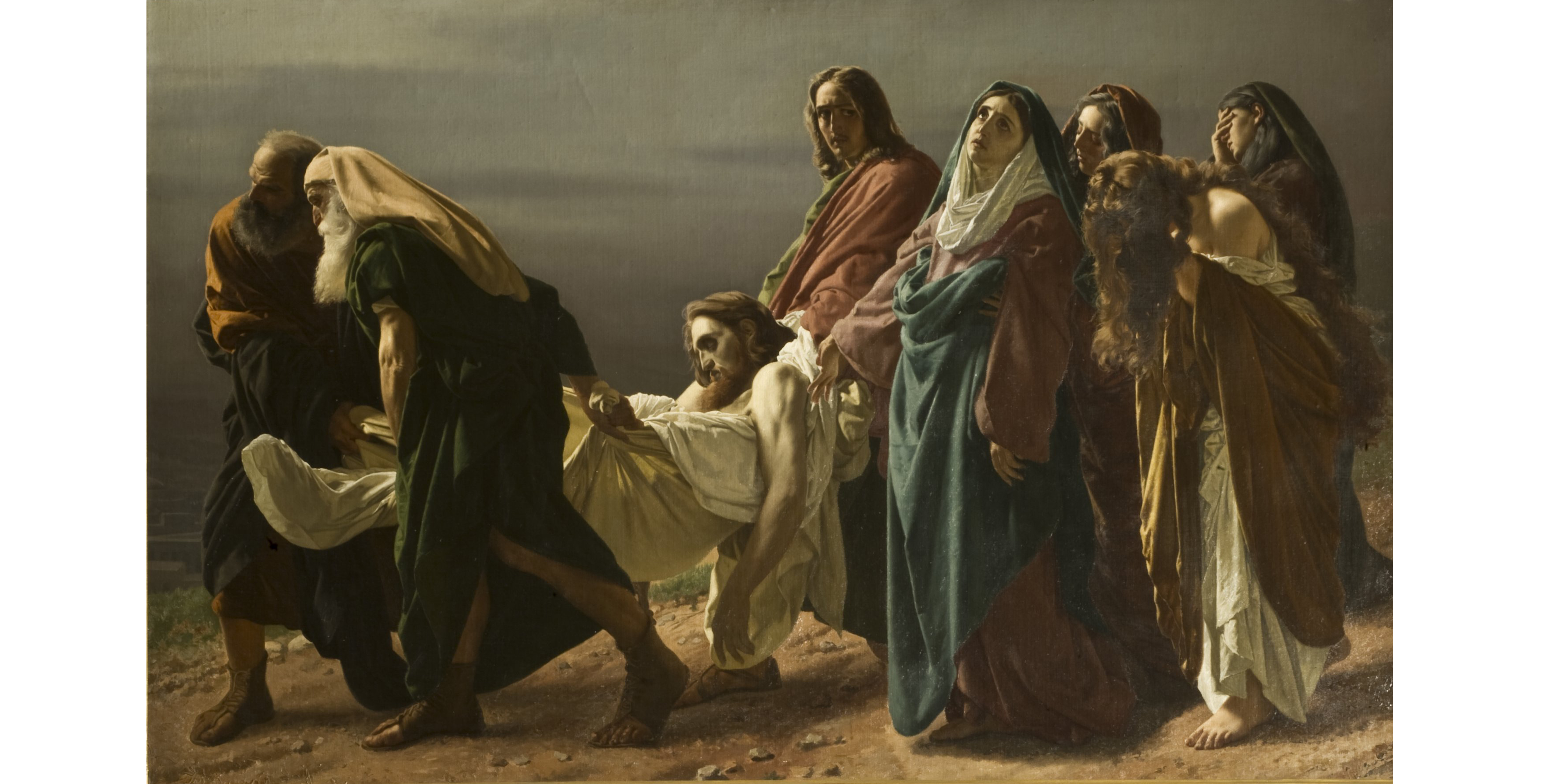 Under the intensity of an almost metaphysical light, the solemn procession that leads Christ to his tomb becomes monumental. In the foreground, the Virgin, glancing to the sky, seems to return the dead Son to the Father with a clear gesture. The women behind her embody human suffering, including the figure of Mary Magdalene, who combines despair and sensuality in a perfect balance. John, with his face in shadow, supports the weight of Jesus' body and turns to Mary, while Joseph of Arimatea and Nicodemus hold up his white shroud and lead the procession to the grave.