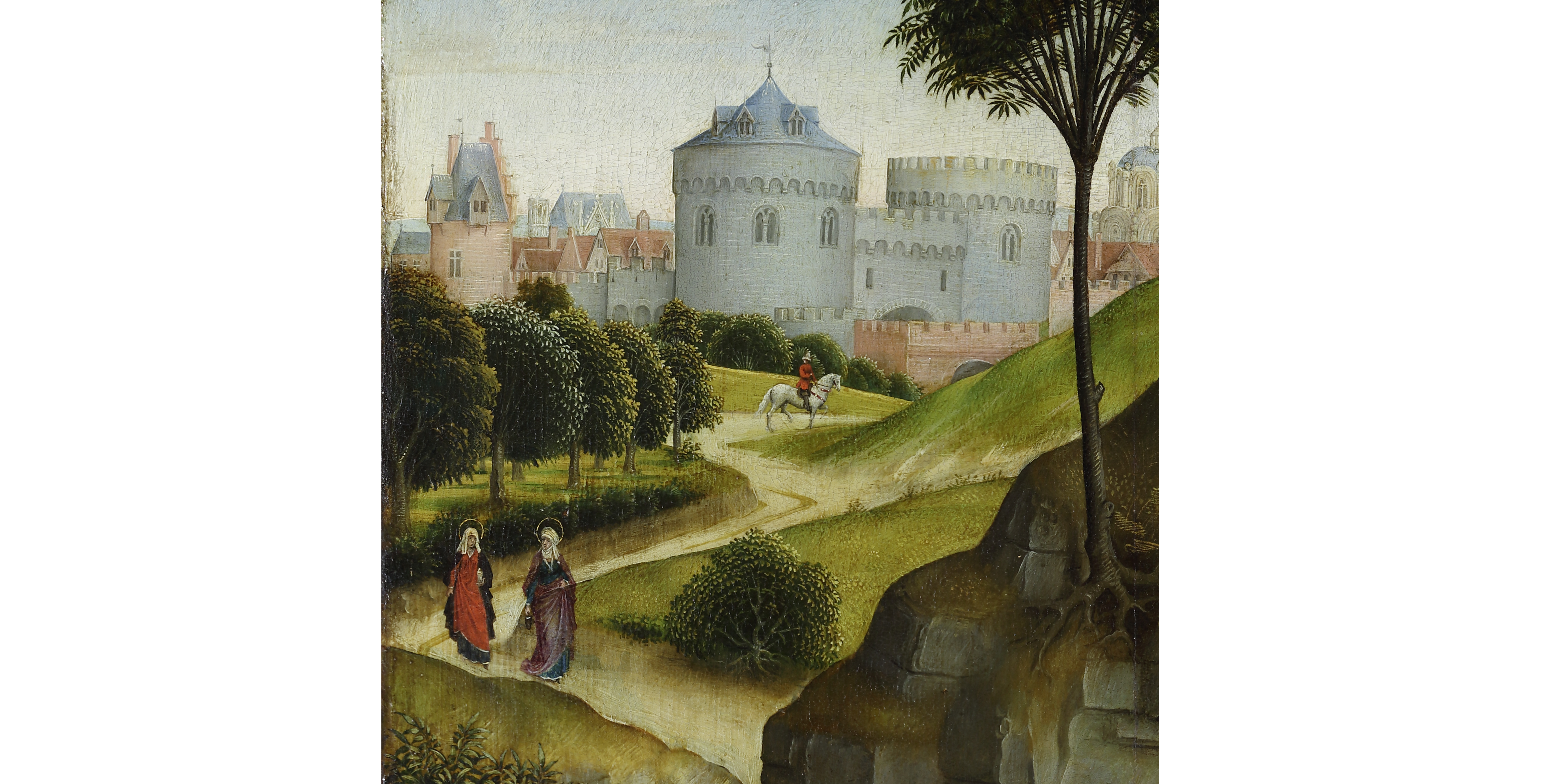 Strong realism also characterizes the landscape, defined by many minutely depicted details. The curious eye of the spectator lingers on each of them: from the wooden gate that closes the path traveled by the pious women (who will find the empty tomb of Christ after the Resurrection), to the towered city with a clear Nordic style in the background, to the mountain of Golgotha on which stand the three crosses in a dimensional blue sky.