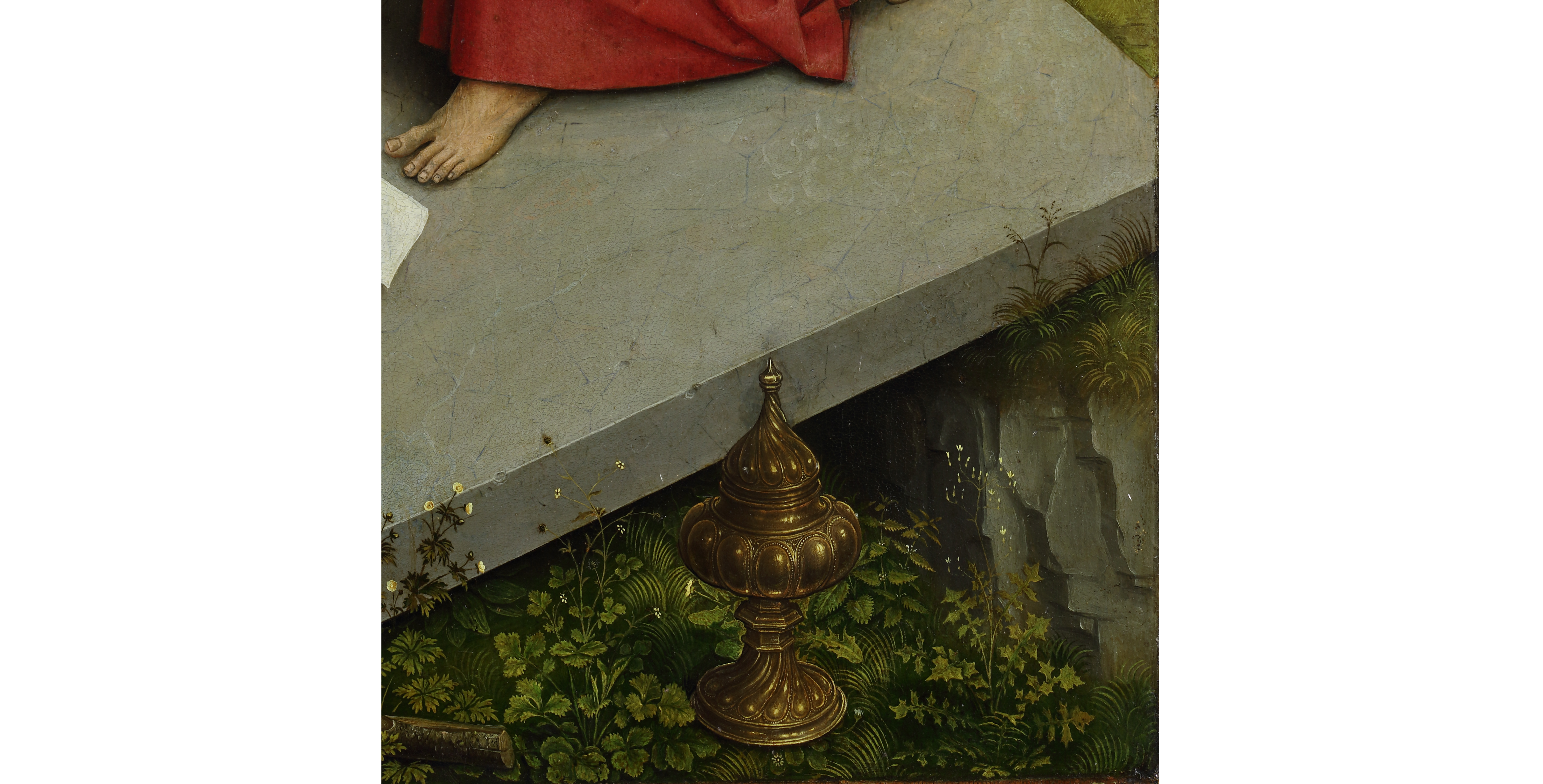 At the bottom right, we see a precious handcrafted gold container; it is the jar of oils and perfumed essences with which Mary Magdalene anointed the feet of Jesus Christ. In the meadow (but also under the stones and in the cracks of the rock of the tomb) grow a great variety of plants and flowers, depicted with botanical precision.
