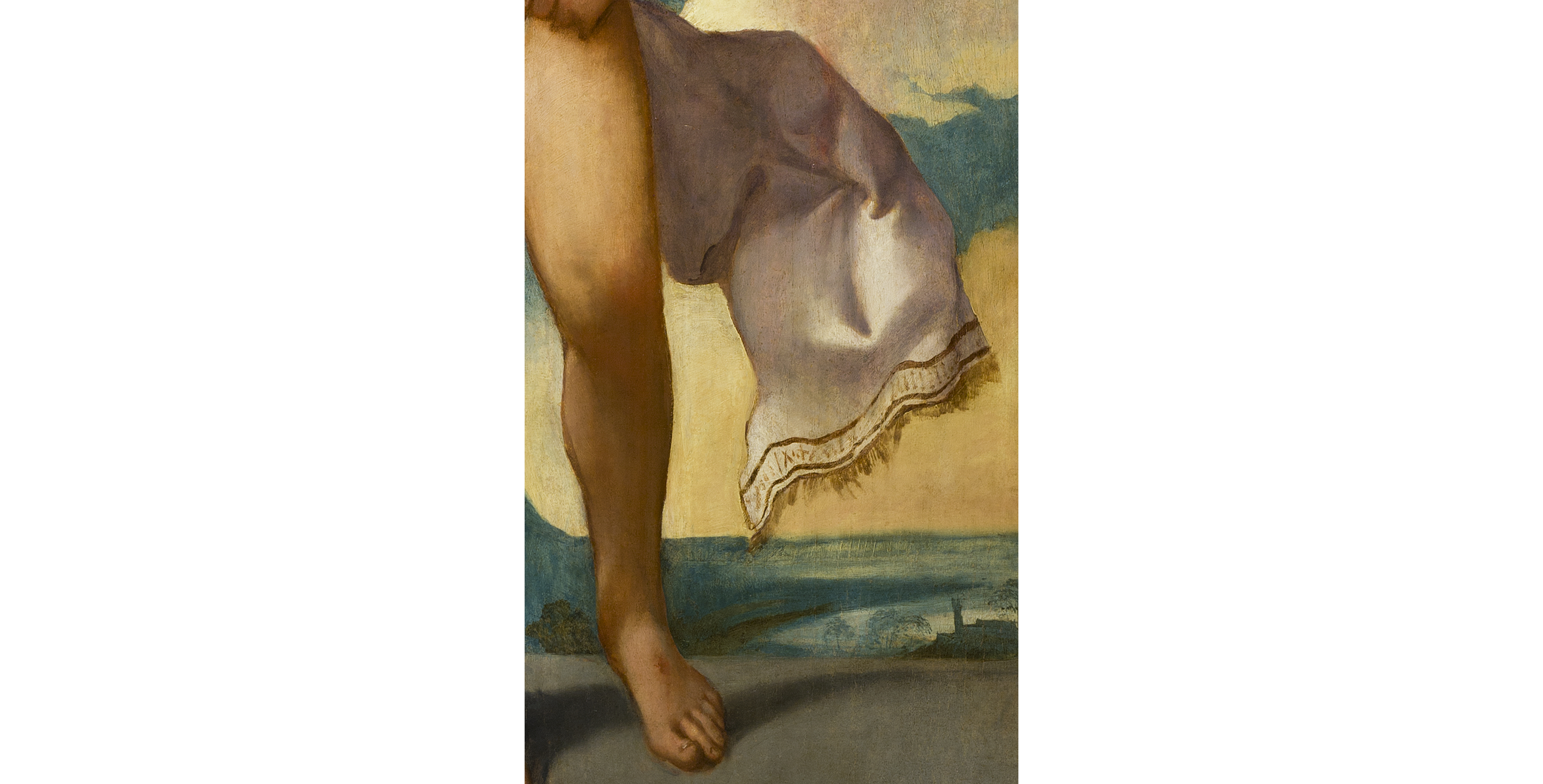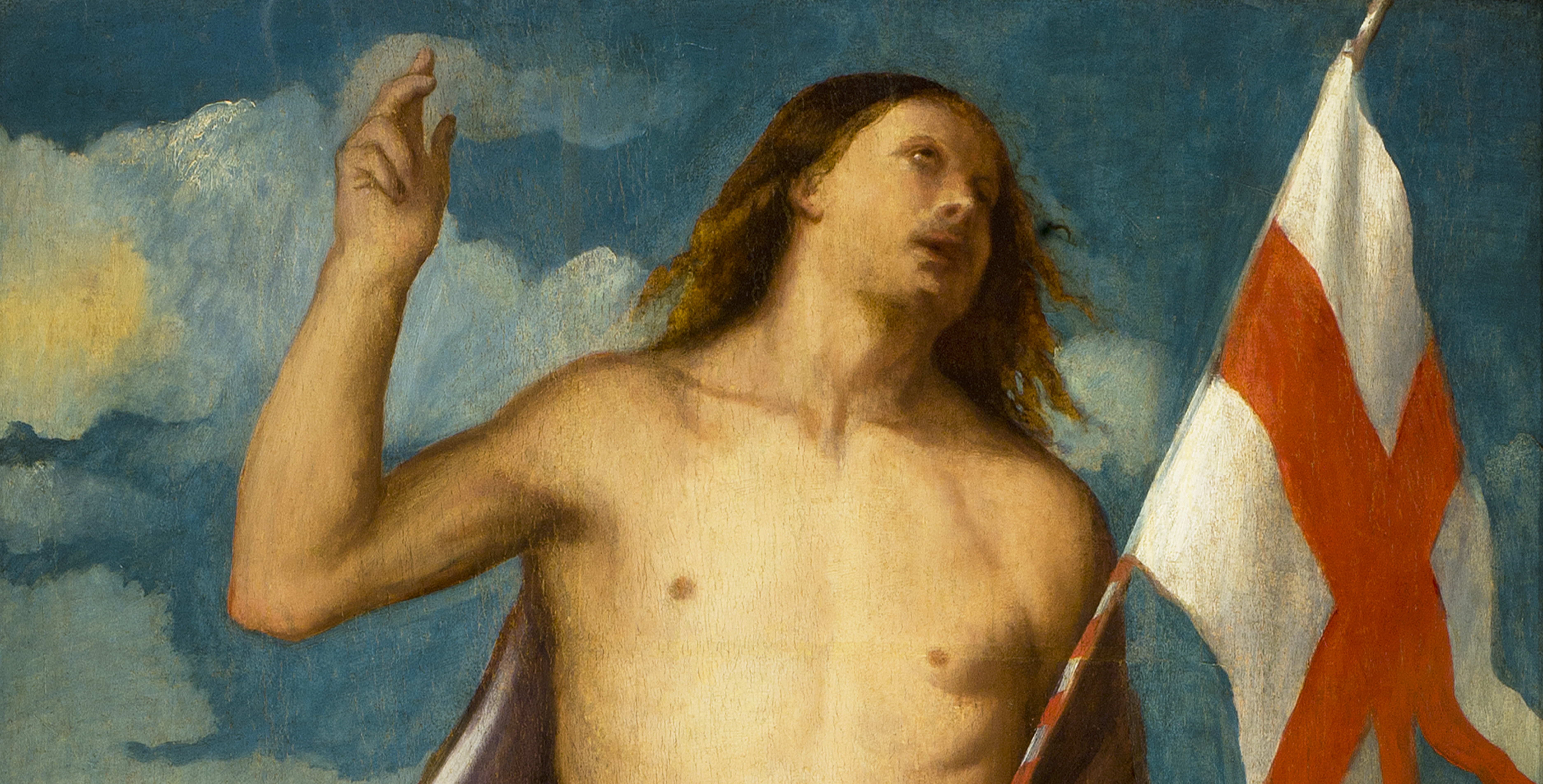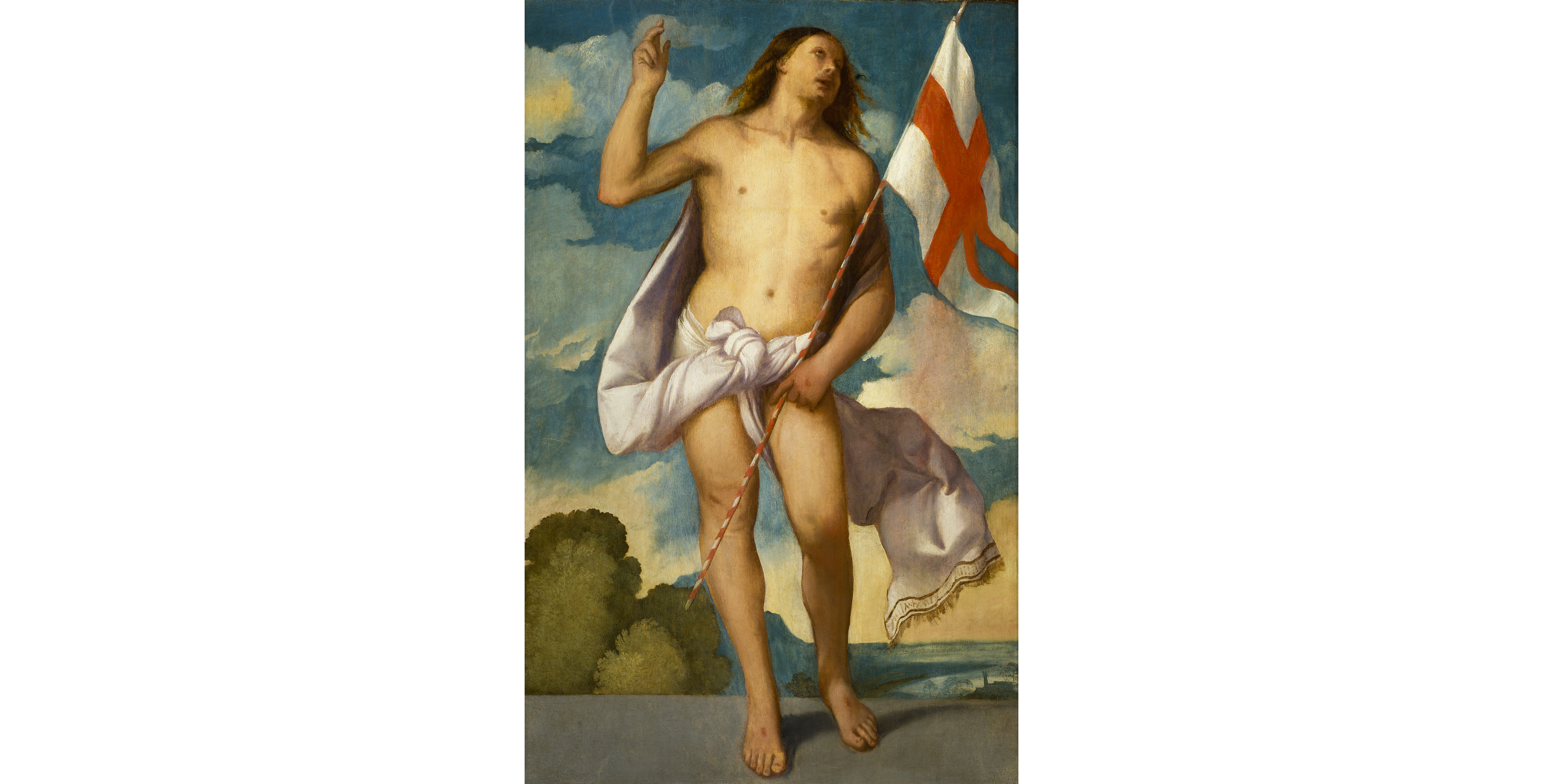 The Risen Christ by Titian, painted in oil around 1511 when the artist was about twenty years old, is a work in which the narrative elements are traced back to the fundamentals and the painter focuses on the image of the Risen One. In fact, according to the Synoptic Gospels, Mary Magdalene and the Pious Women go to the tomb with the herbs for burial; here there appear to be two men in shining robes who ask: " “Why do you look for the living among the dead? He is not here; he has risen!" (Luke 24:5-6) The first element that is encountered, therefore, is the empty tomb, an element which constitutes an essential "sign" for believers. The artist then chooses to depict what is written in the sources: Christ’s feet rest on a "neutral" plane which is presumably his tomb. The whole painting is thus concentrated on the figure of the Risen One, through whom Titian transmits his own personal vision of sacred images, or a harmonious dialogue between heaven and earth, in a space that is composed of both landscape and luminous sky.
