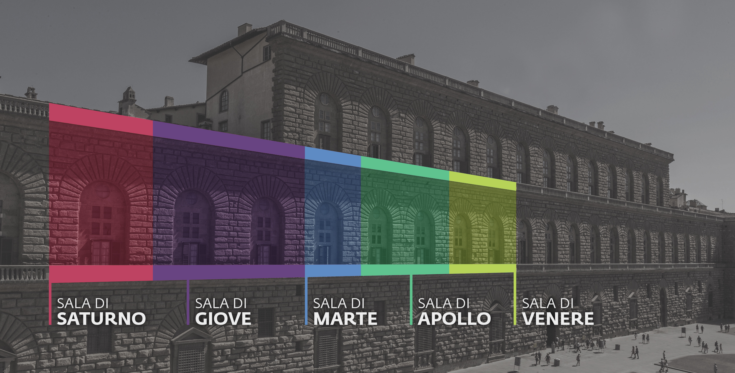 At the time of their creation, these rooms were visited in reverse order to the way they are today, starting with the Room of Venus, immediately after the Room of the Niches. Each room had its own precise function within the apartments of Grand Duke Ferdinand II, and the walls, covered with fabrics or hangings, were also home to a select number of paintings and objects.